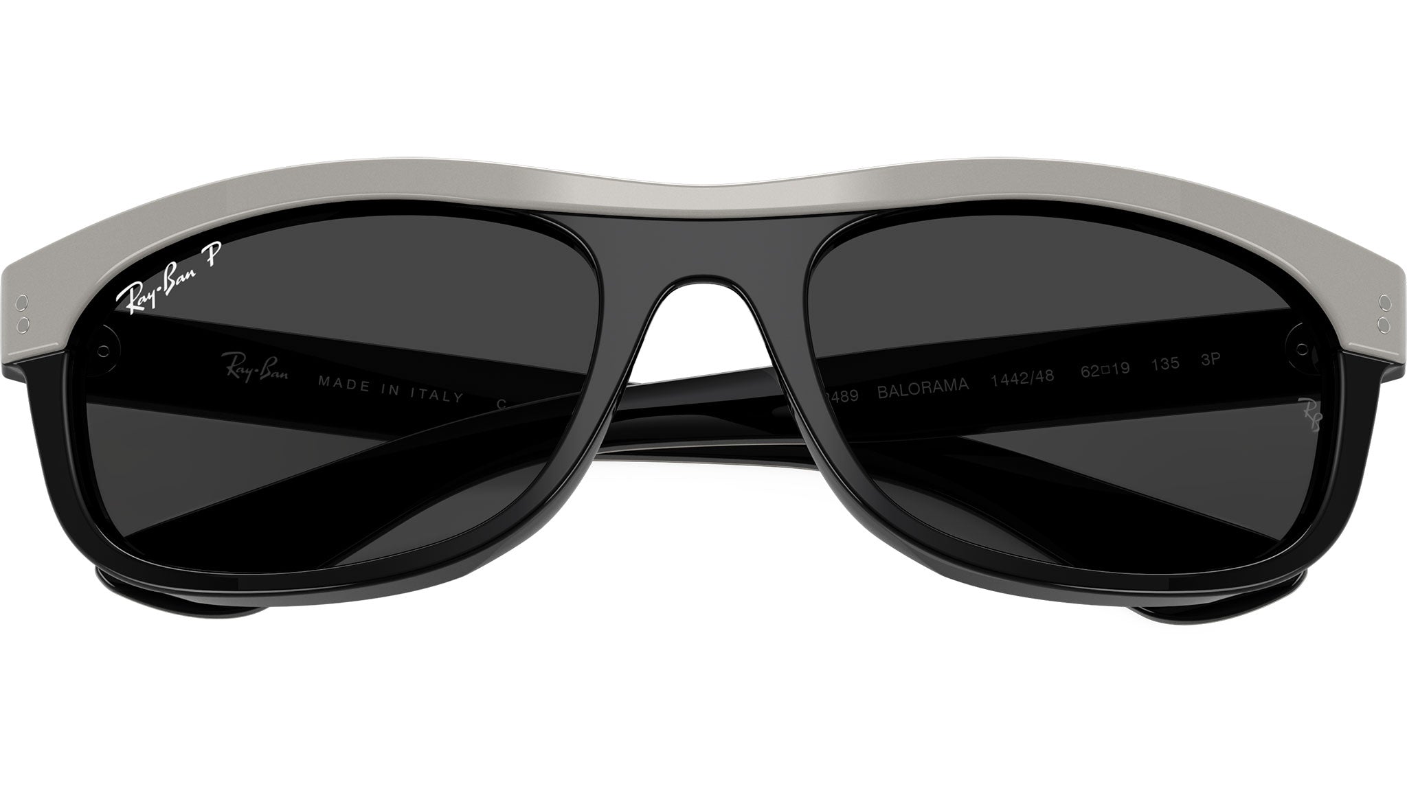 Ray-Ban Balorama RB2489 144248 sunglasses for men and woman, featuring grey on black rectangular acetate frame and polarized black glass lenses. High bridge fit. Brand line: Evolution. Style code: 0RB2489. Color code: 144248. Authorized Ray-Ban online reseller. Your glasses will include the original case and accessories and are covered by a 12-month global warranty.