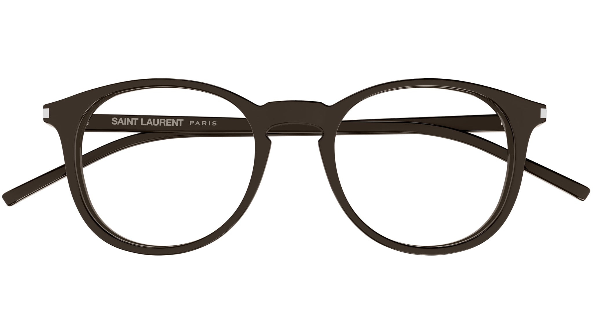 Saint Laurent SL 106 021 glasses for men and woman, featuring shiny solid dark brown panthos acetate frame and demo lenses. Brand line: Classic. Style code: SL 106. Color code: 021. Made in Italy. Authorized Saint Laurent online reseller. Your glasses will include the original case and accessories and are covered by a 12-month global warranty.