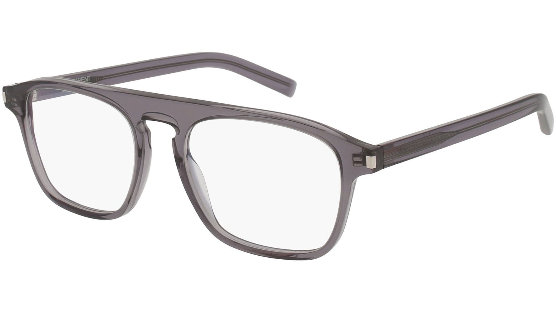 Saint Laurent SL 157 003 glasses for men, featuring shiny transparent grey rectangular acetate frame and demo lenses. Brand line: Corner Angle. Style code: SL 157. Color code: 003. Made in Italy. Authorized Saint Laurent online reseller. Your glasses will include the original case and accessories and are covered by a 12-month global warranty.