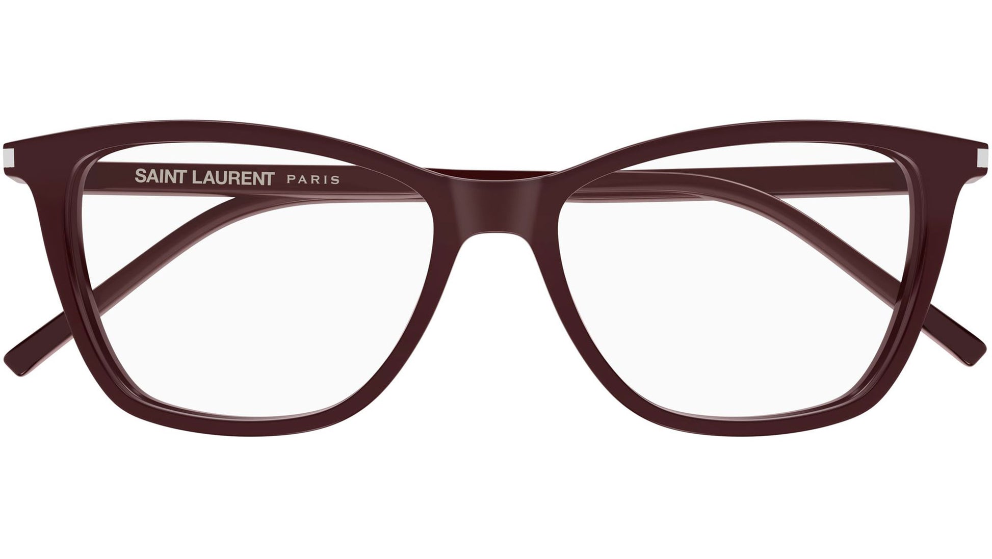 Saint Laurent SL 259 018 glasses for women, featuring shiny solid burgundy cat eye acetate frame and demo lenses. Brand line: Corner Angle. Style code: SL 259. Color code: 018. Made in Italy. Authorized Saint Laurent online reseller. Your glasses will include the original case and accessories and are covered by a 12-month global warranty.