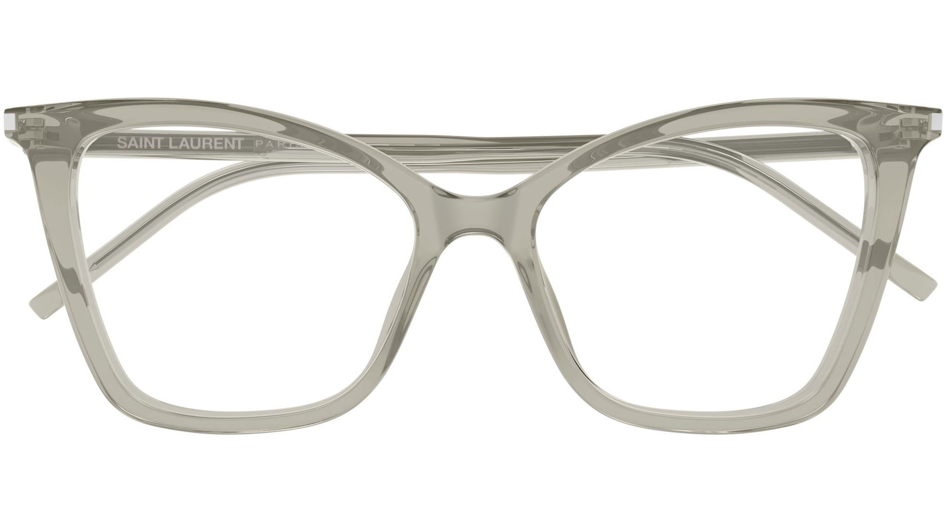 Saint Laurent SL 386 021 glasses for women, featuring shiny transparent taupe cat eye acetate frame and demo lenses. Brand line: Corner Angle. Style code: SL 386. Color code: 021. Made in Italy. Authorized Saint Laurent online reseller. Your glasses will include the original case and accessories and are covered by a 12-month global warranty.