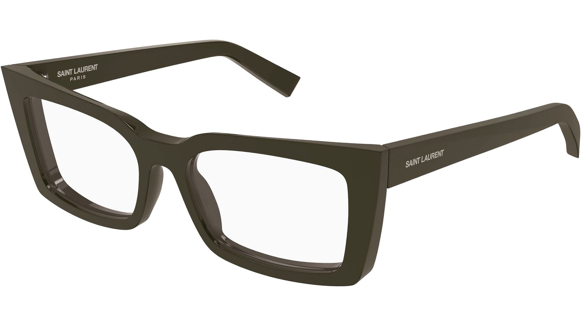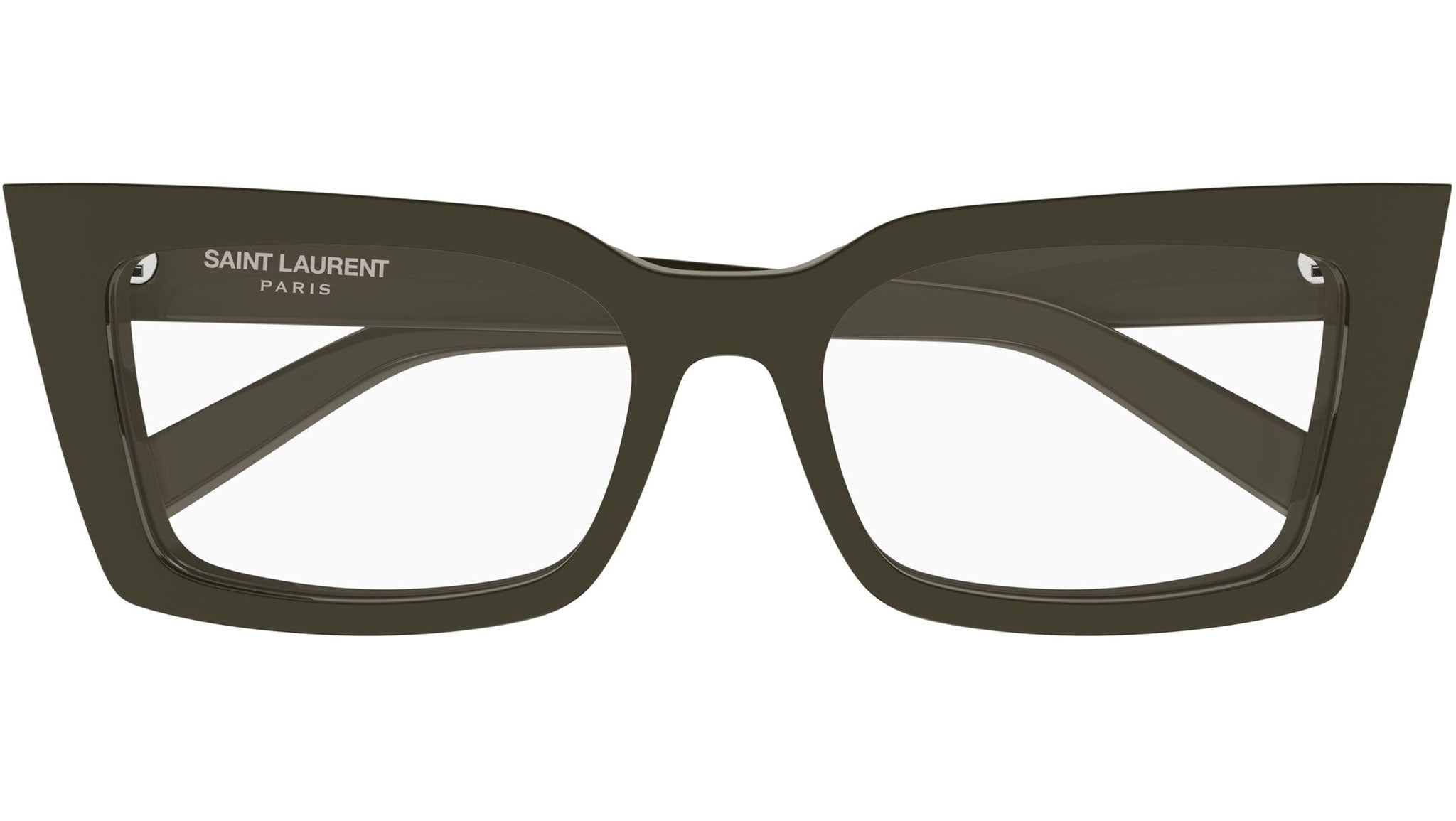 Saint Laurent SL 554 006 glasses for women, featuring shiny solid brown cat eye acetate frame and demo lenses. Brand line: SL Logo. Style code: SL 554. Color code: 006. Made in Italy. Authorized Saint Laurent online reseller. Your glasses will include the original case and accessories and are covered by a 12-month global warranty.