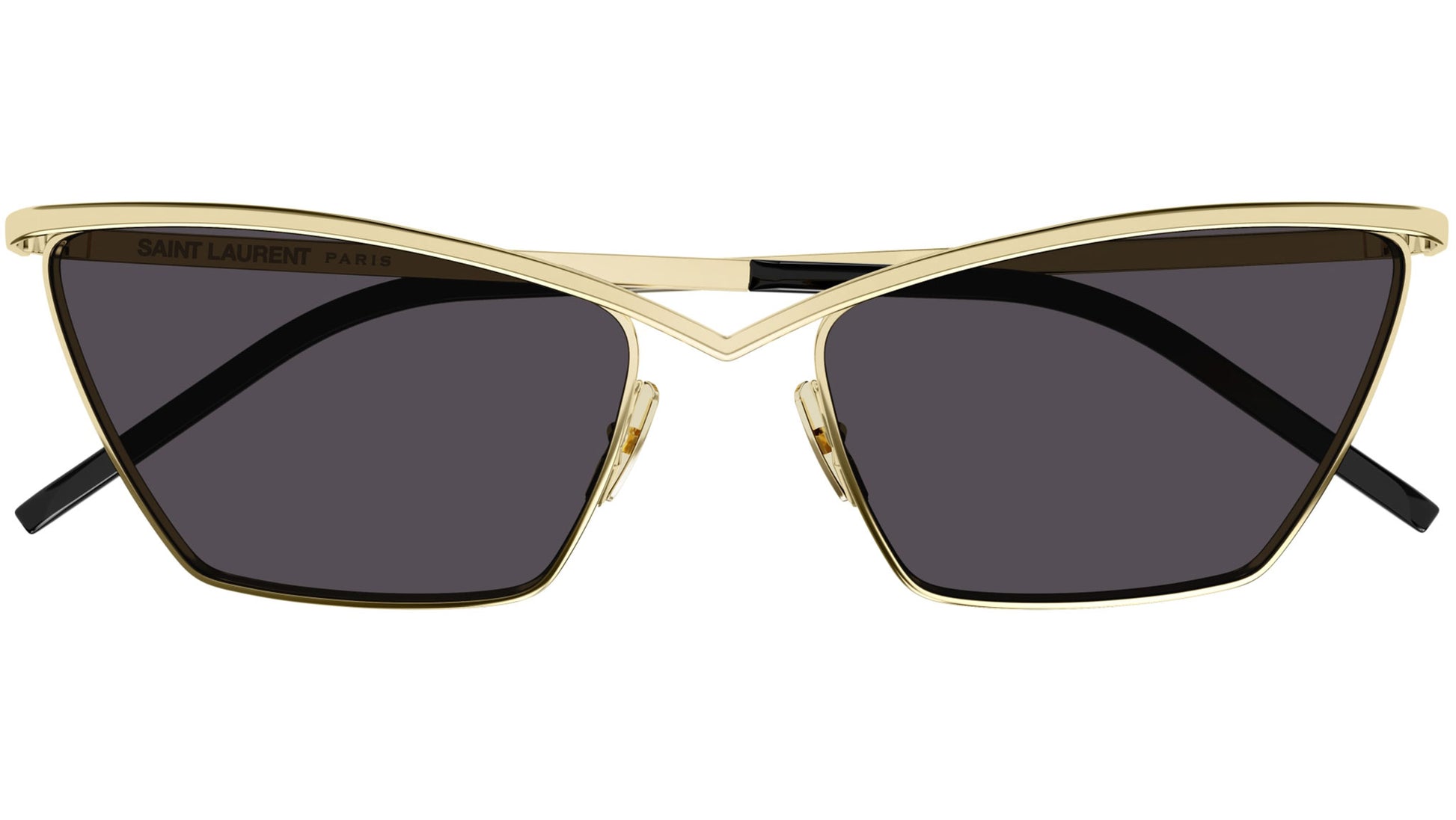 Saint Laurent sunglasses model SL 637 from New Wave eyewear line, color code 003 shiny light gold metal, cat eye frame shape with solid black lens.