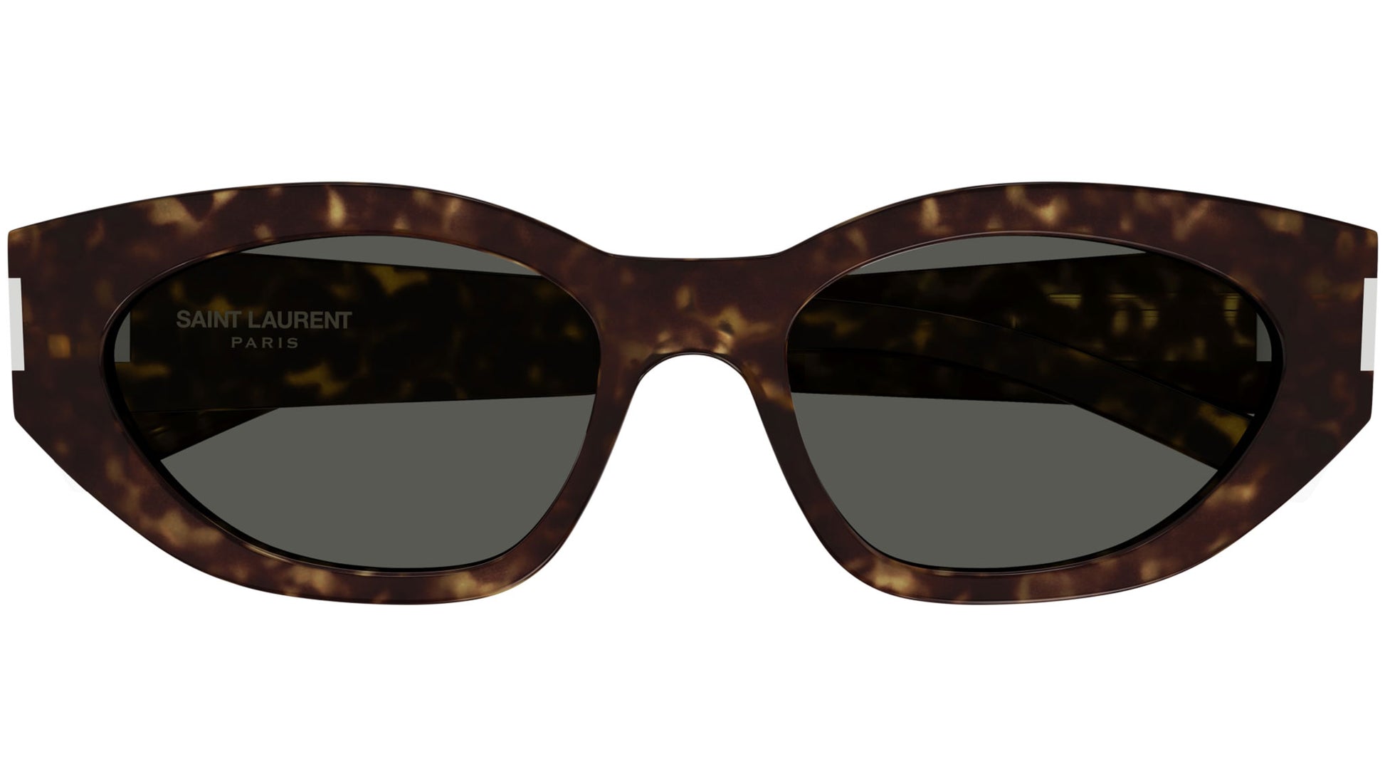 Saint Laurent sunglasses model SL 638 from New Wave eyewear line, color code 002 shiny dark havana recycled acetate, cat eye frame shape with solid grey lens.