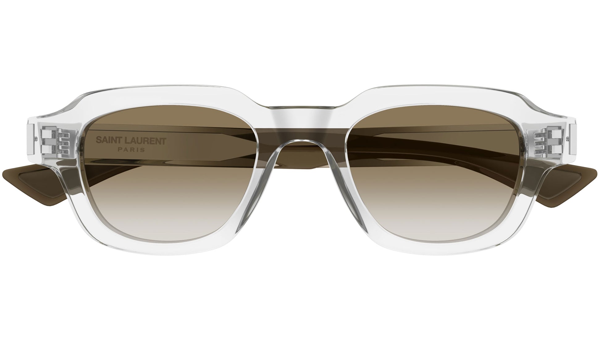 Saint Laurent SL 791 003 sunglasses for men and woman, featuring shiny transparent crystal rectangular recycled acetate frame and gradient brown bio nylon lenses. Brand line: Corner Angle. Style code: SL 791. Color code: 003. Made in Japan. Authorized Saint Laurent online reseller. Your glasses will include the original case and accessories and are covered by a 12-month global warranty.