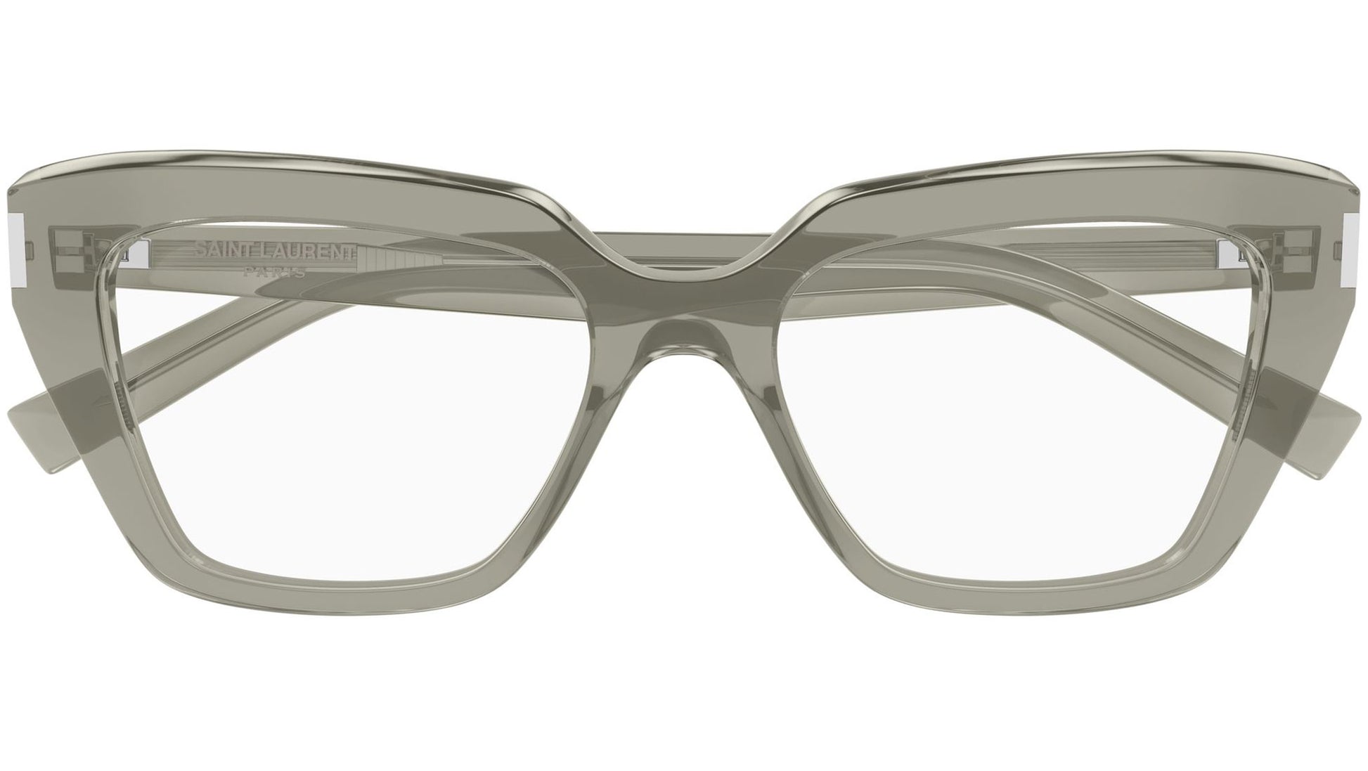 Saint Laurent SL 829 005 glasses for women, featuring shiny transparent taupe cat eye recycled acetate frame and demo lenses. Brand line: Corner Angle. Style code: SL 829. Color code: 005. Made in Italy. Authorized Saint Laurent online reseller. Your glasses will include the original case and accessories and are covered by a 12-month global warranty.