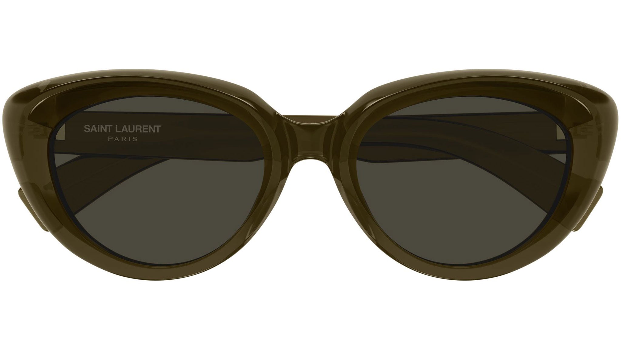 Saint Laurent SL 859 009 sunglasses for women, featuring shiny transparent khaki cat eye recycled acetate frame and solid grey bio nylon lenses. Brand line: SL Logo. Style code: SL 859. Color code: 009. Made in Italy. Authorized Saint Laurent online reseller. Your glasses will include the original case and accessories and are covered by a 12-month global warranty.