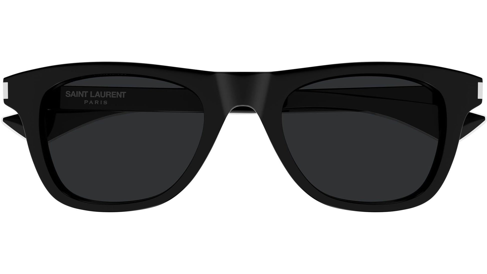 Saint Laurent SL 879 001 sunglasses for men, featuring shiny solid black rectangular recycled acetate frame and solid black bio nylon lenses. Brand line: Corner Angle. Style code: SL 879. Color code: 001. Made in Japan. Authorized Saint Laurent online reseller. Your glasses will include the original case and accessories and are covered by a 12-month global warranty.