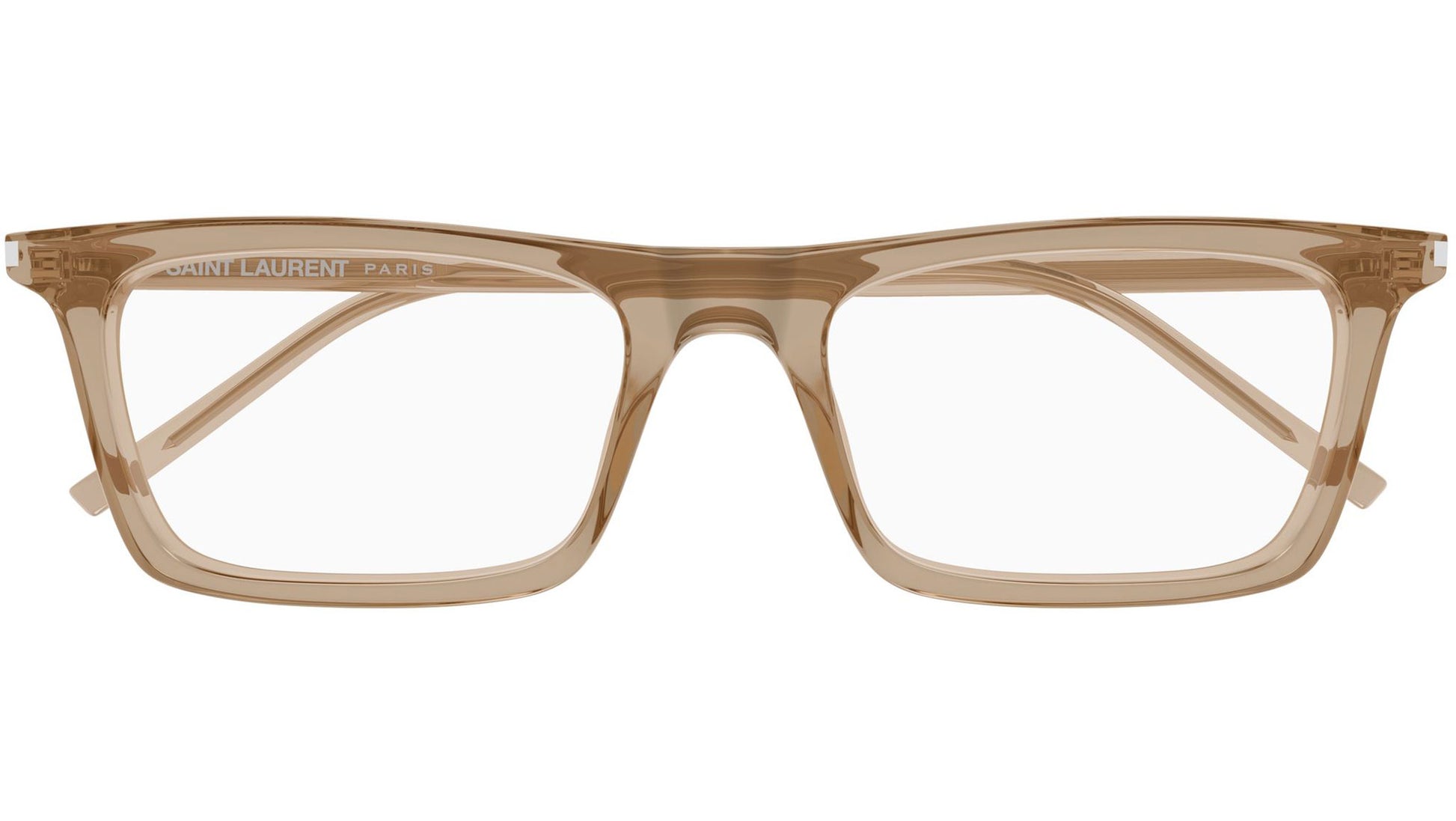 Saint Laurent SL 890 BETTY THIN OPT 005 glasses for men and woman, featuring shiny transparent brown rectangular recycled acetate frame and demo lenses. Brand line: Corner Angle. Style code: SL 890 BETTY THIN OPT. Color code: 005. Made in Italy. Authorized Saint Laurent online reseller. Your glasses will include the original case and accessories and are covered by a 12-month global warranty.