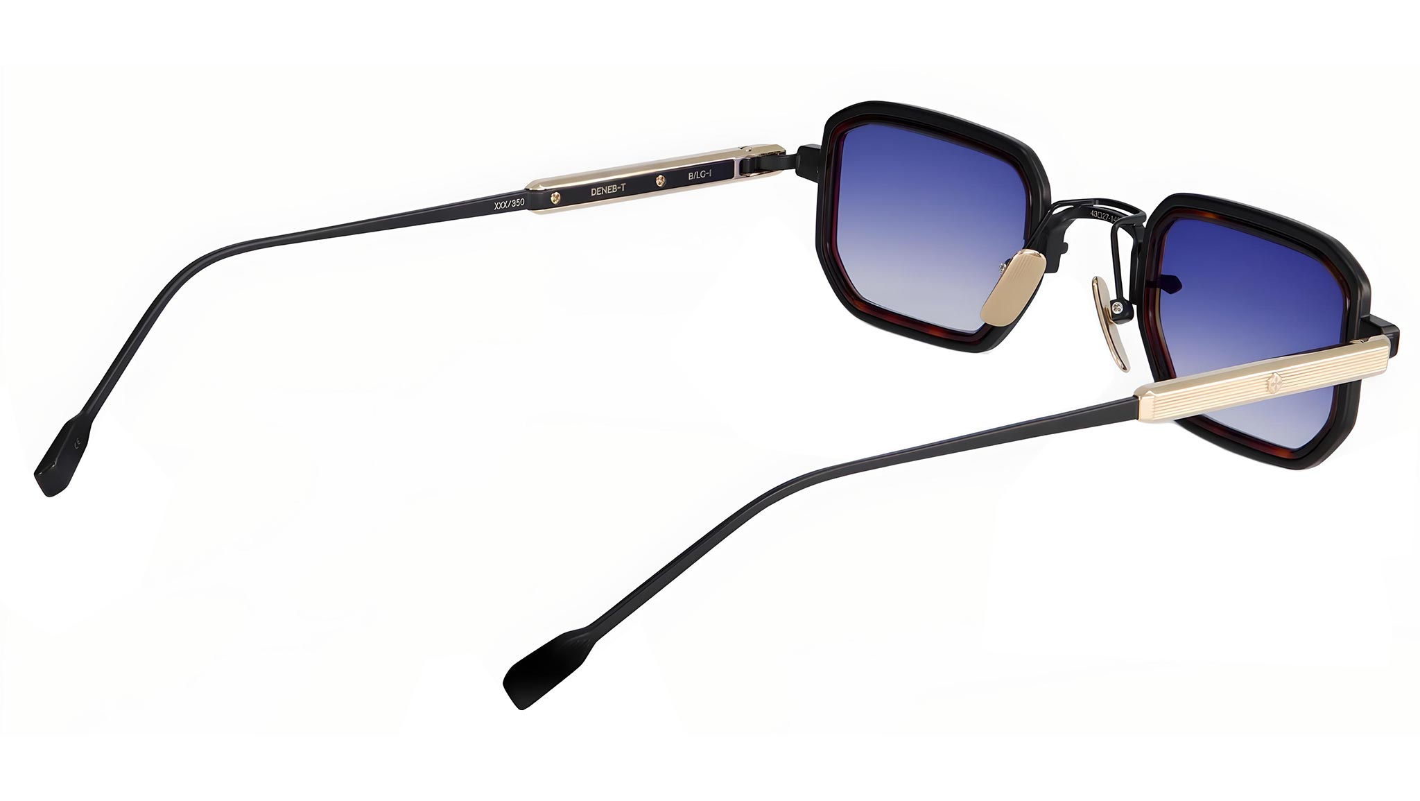 Sato Eyewear sunglasses model Deneb-T B/LG-1 featuring black and gold Titanium with tortoise takiron rim insert and gradient dark blue lenses. Deneb-T Collection, a captivating enigma, where every pair of glasses holds a narrative of allure and seduction. These designs peel away the layers of mystery, igniting an insatiable thirst for desire and evoking an irresistible intrigue with their distinct allure.