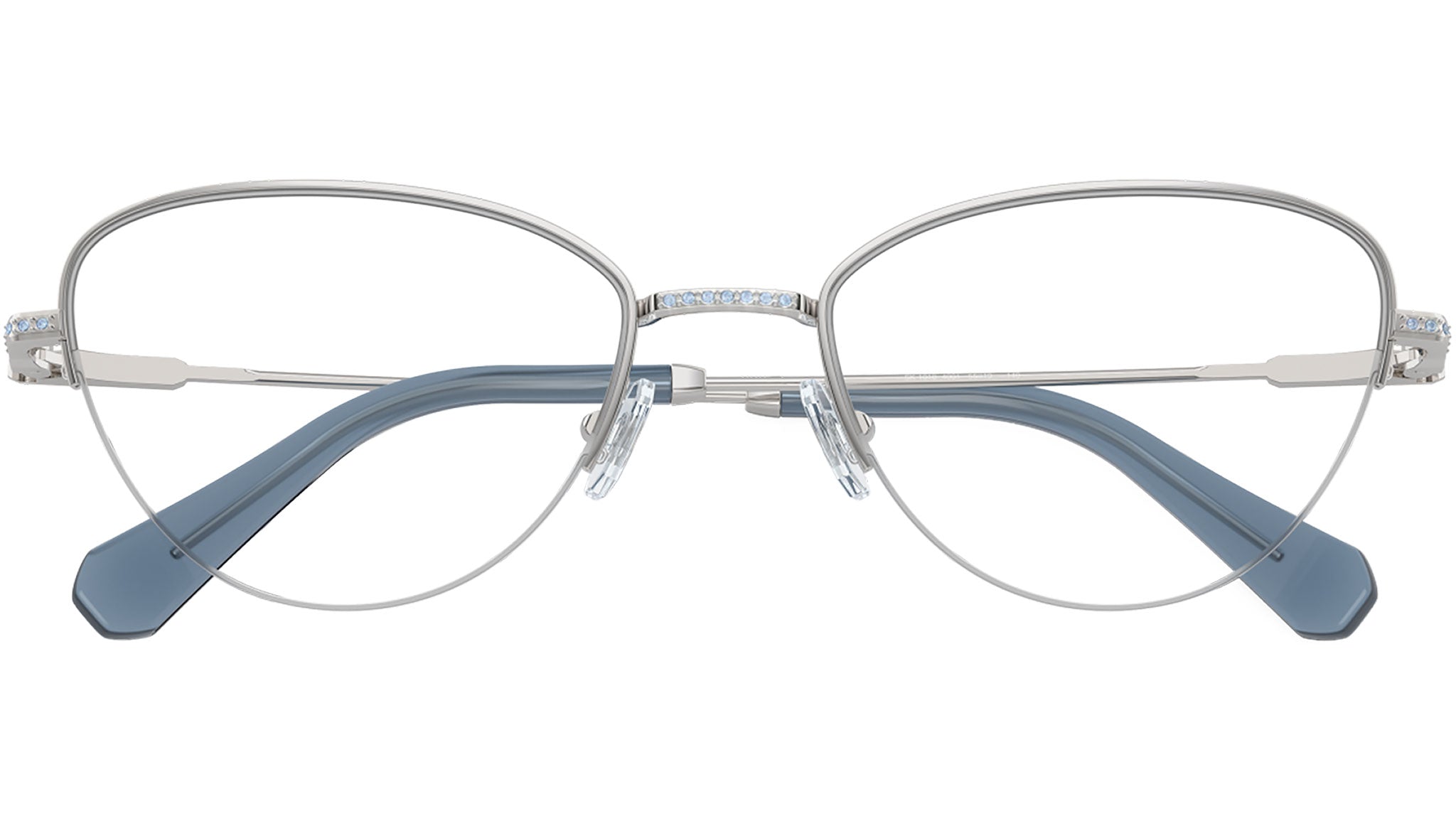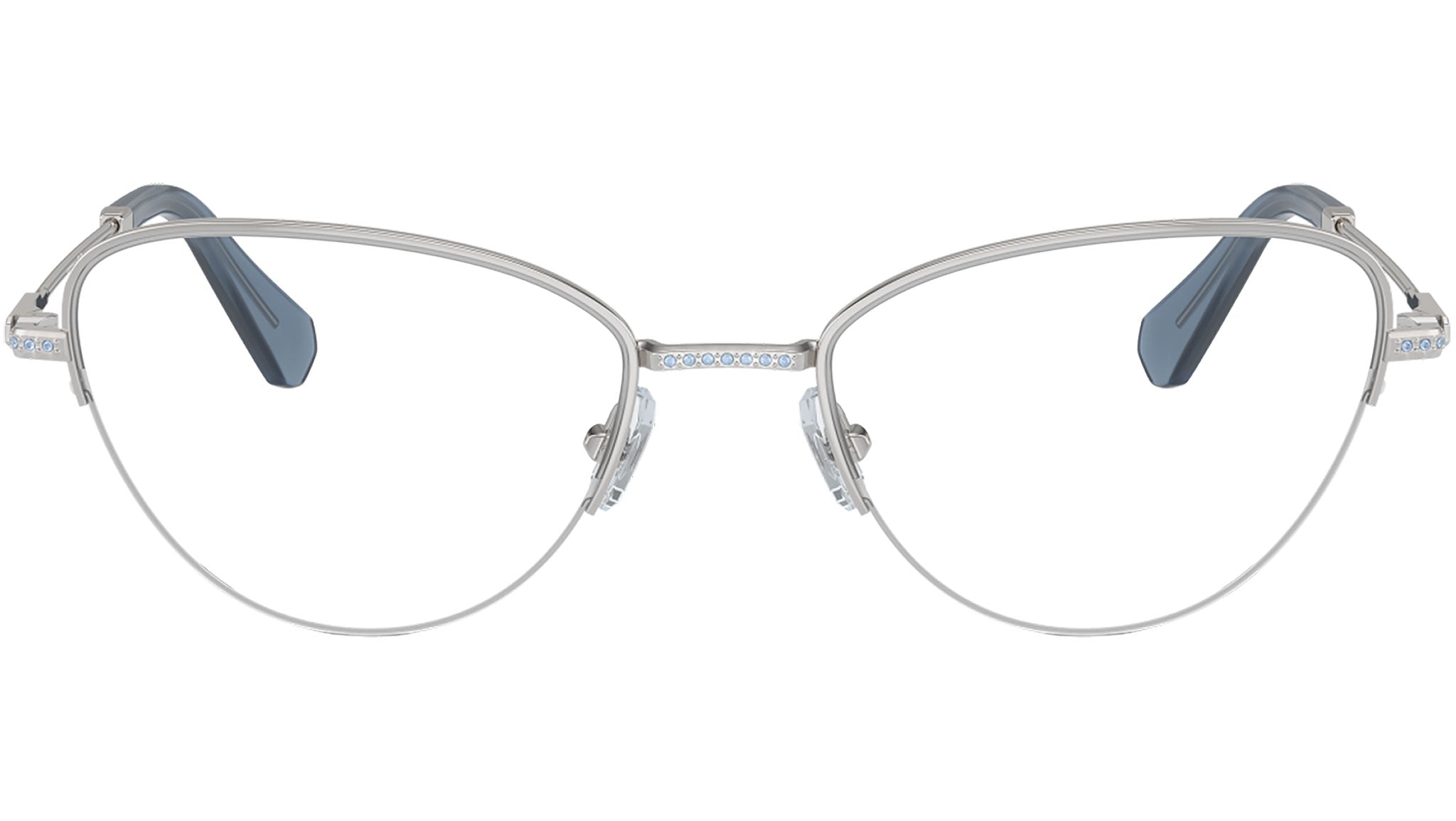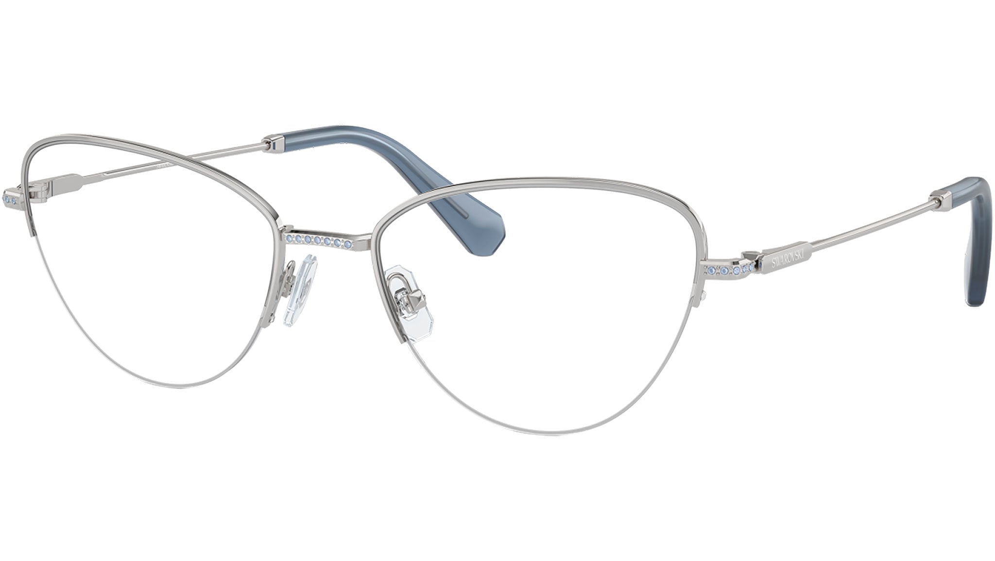 Swarovski optical frame for women model 1010 featuring silver semi rim metal frame and base 4 demo lens. Adjustable nosepads. Frame line: Science of Elegance. Brand code: 0SK1010. Color code: 4001. Authorised Swarovski Eyewear Online Reseller. Your glasses will come including the original case and accessories and will be covered by 12 month global warranty.