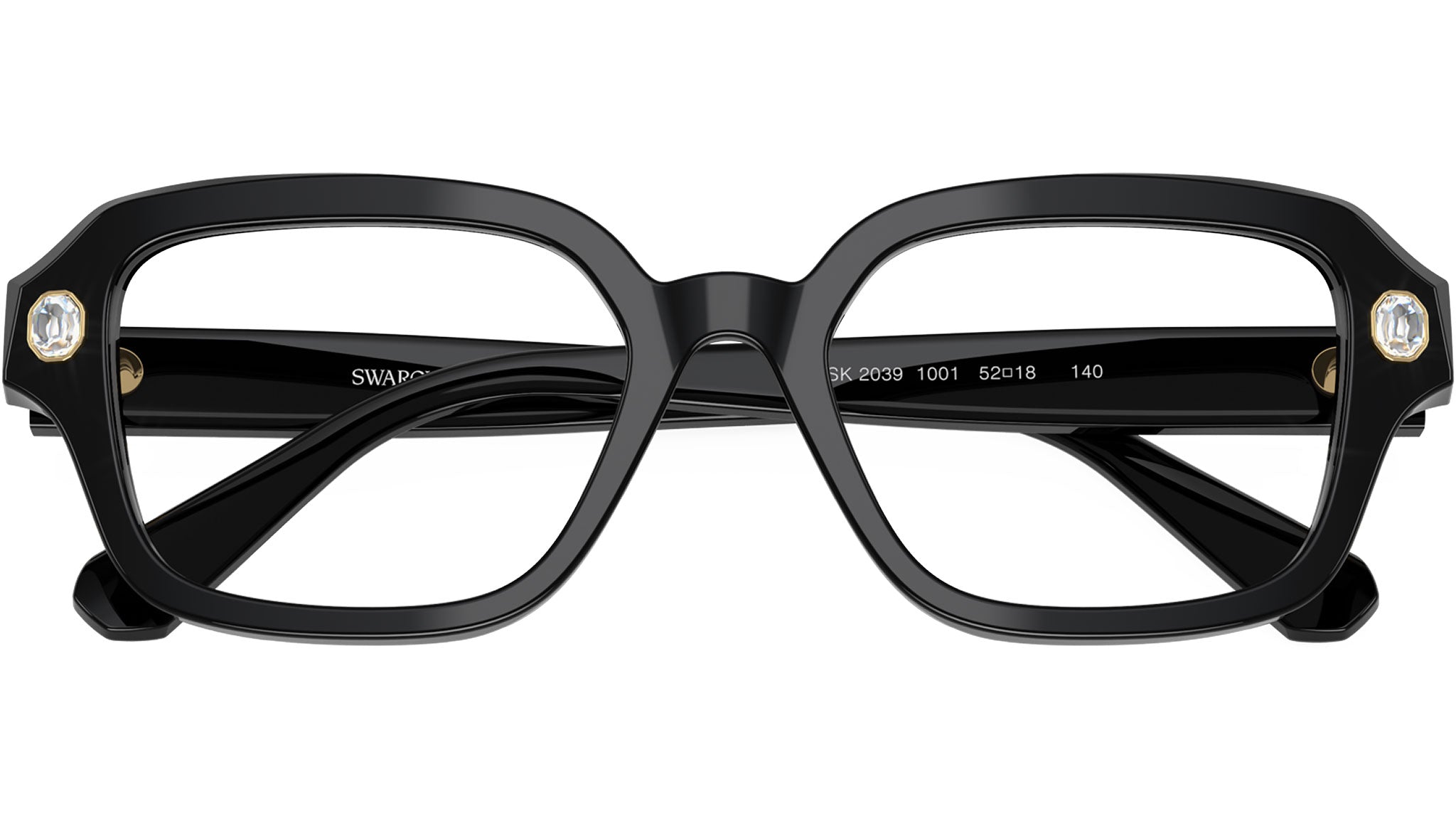 Swarovski optical frame for women model 2039 featuring black full rim acetate frame and base 4 demo lens. High bridge fit. Frame line: Science of Facets. Brand code: 0SK2039. Color code: 1001. Authorised Swarovski Eyewear Online Reseller. Your glasses will come including the original case and accessories and will be covered by 12 month global warranty.