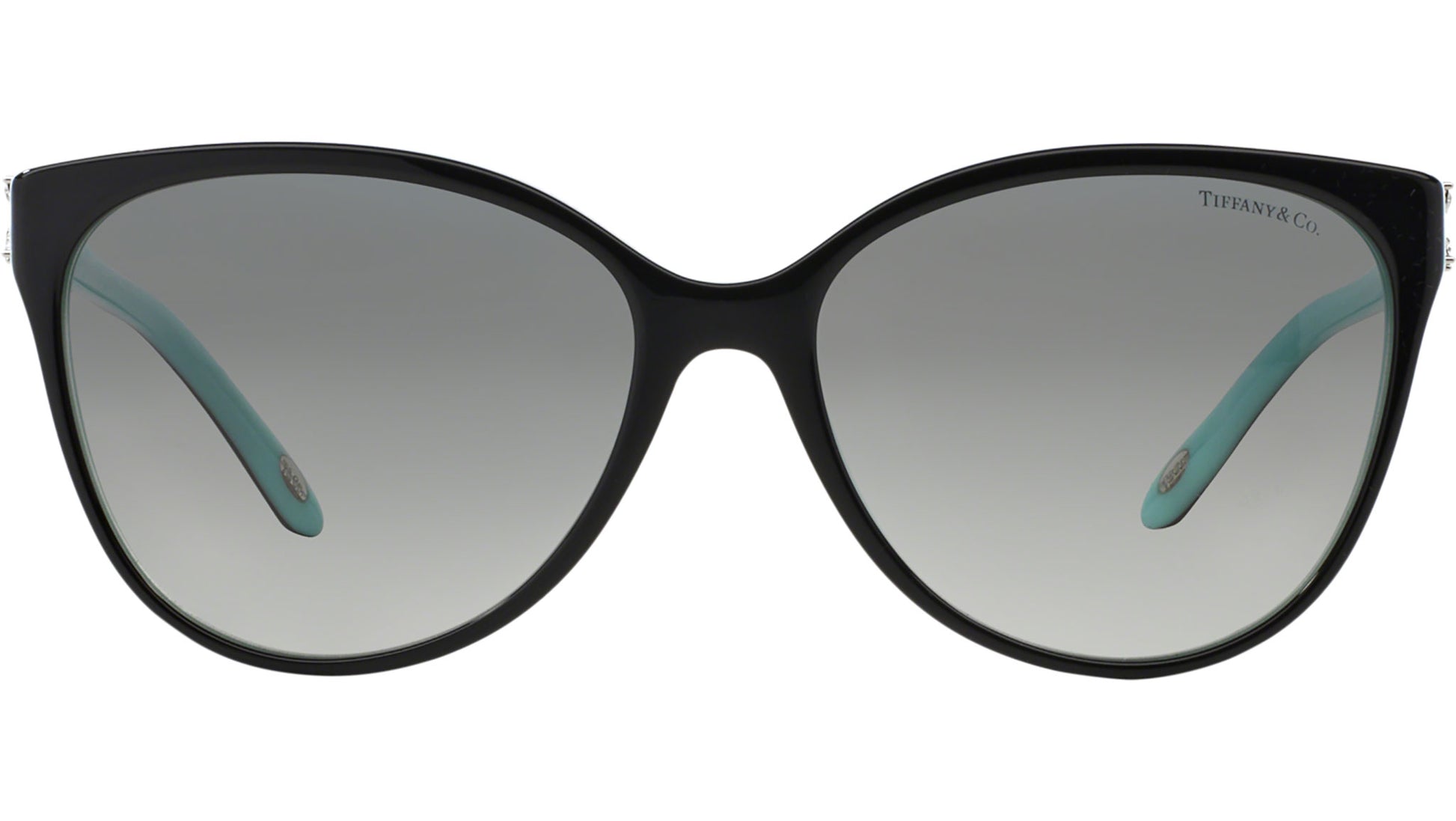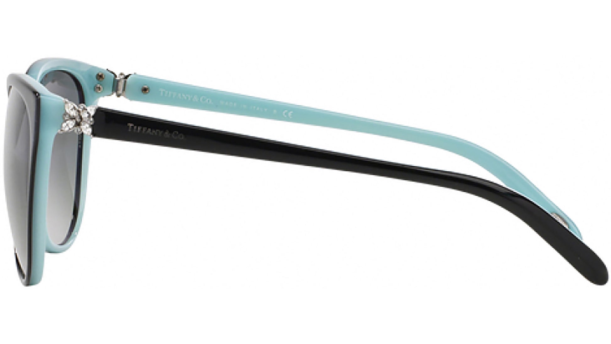 Tiffany sunglasses for women model 0TF4089B featuring black on Tiffany blue full rim acetate frame and base 6 grey gradient lenses. High bridge fit. Frame line: Blue Core. Brand code: 0TF4089B. Color code: 80553C. Authorised Tiffany Eyewear Online Reseller. Your glasses will come including the original case and accessories and will be covered by 12 month global warranty.