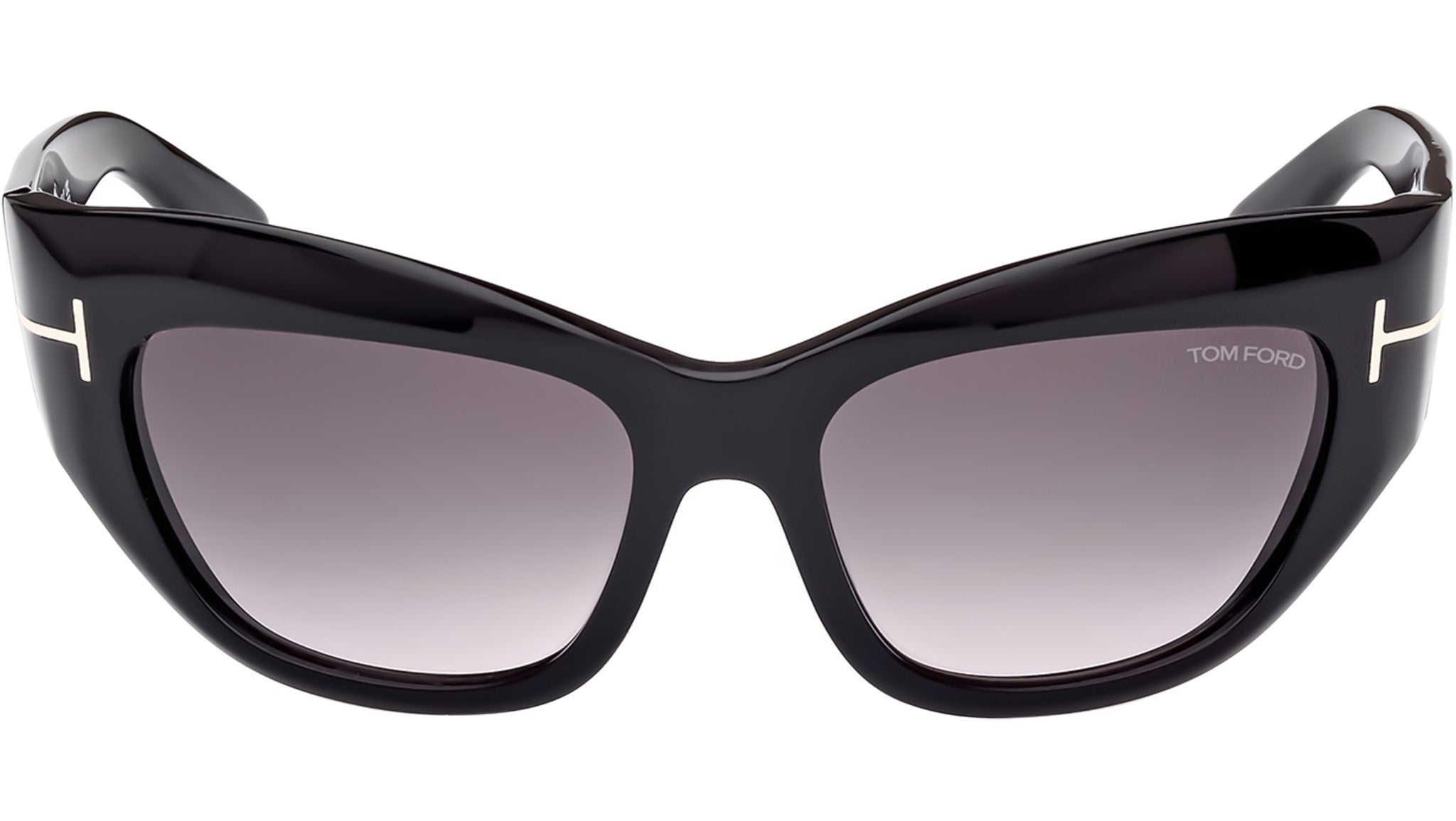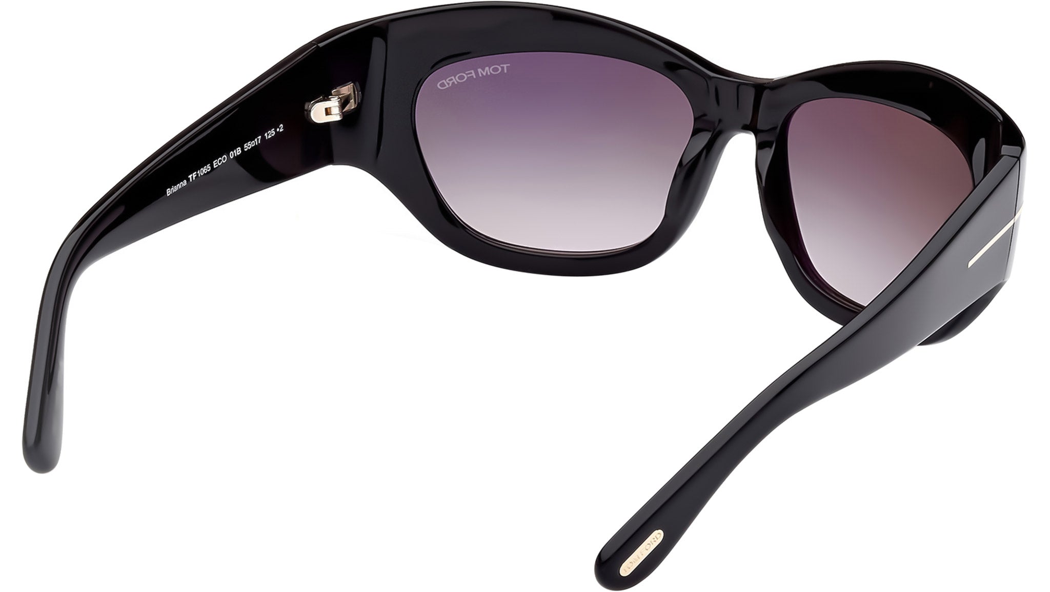 Tom Ford Brianna sunglasses for women model FT1065 featuring shiny black full-rim acetate frame with gradient smoke lenses. Brand code: 1065. Color code: 01B. Authorised Tom Ford Online Reseller. Your glasses will include the original case and accessories and will be covered by a 12-month global warranty.