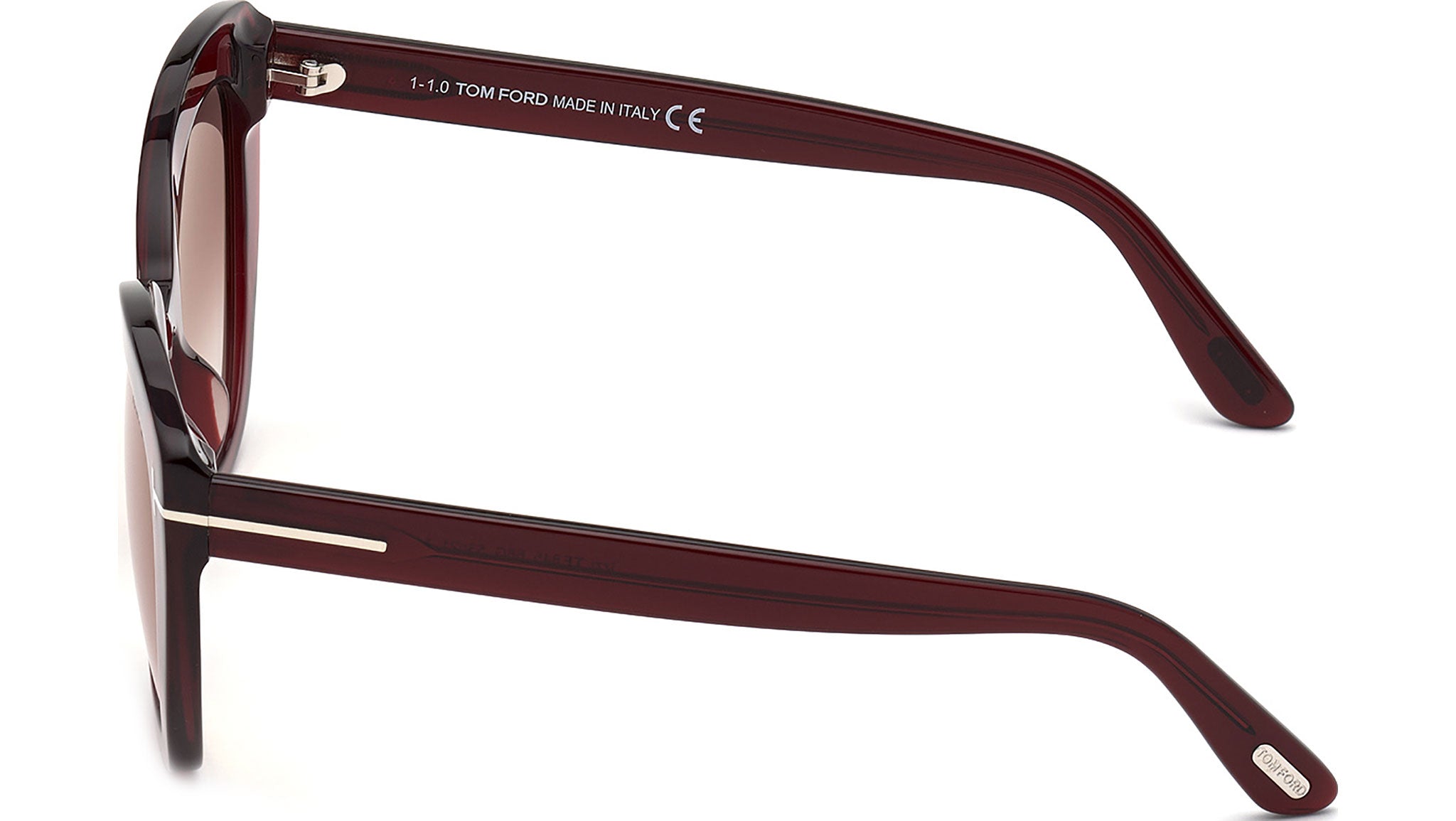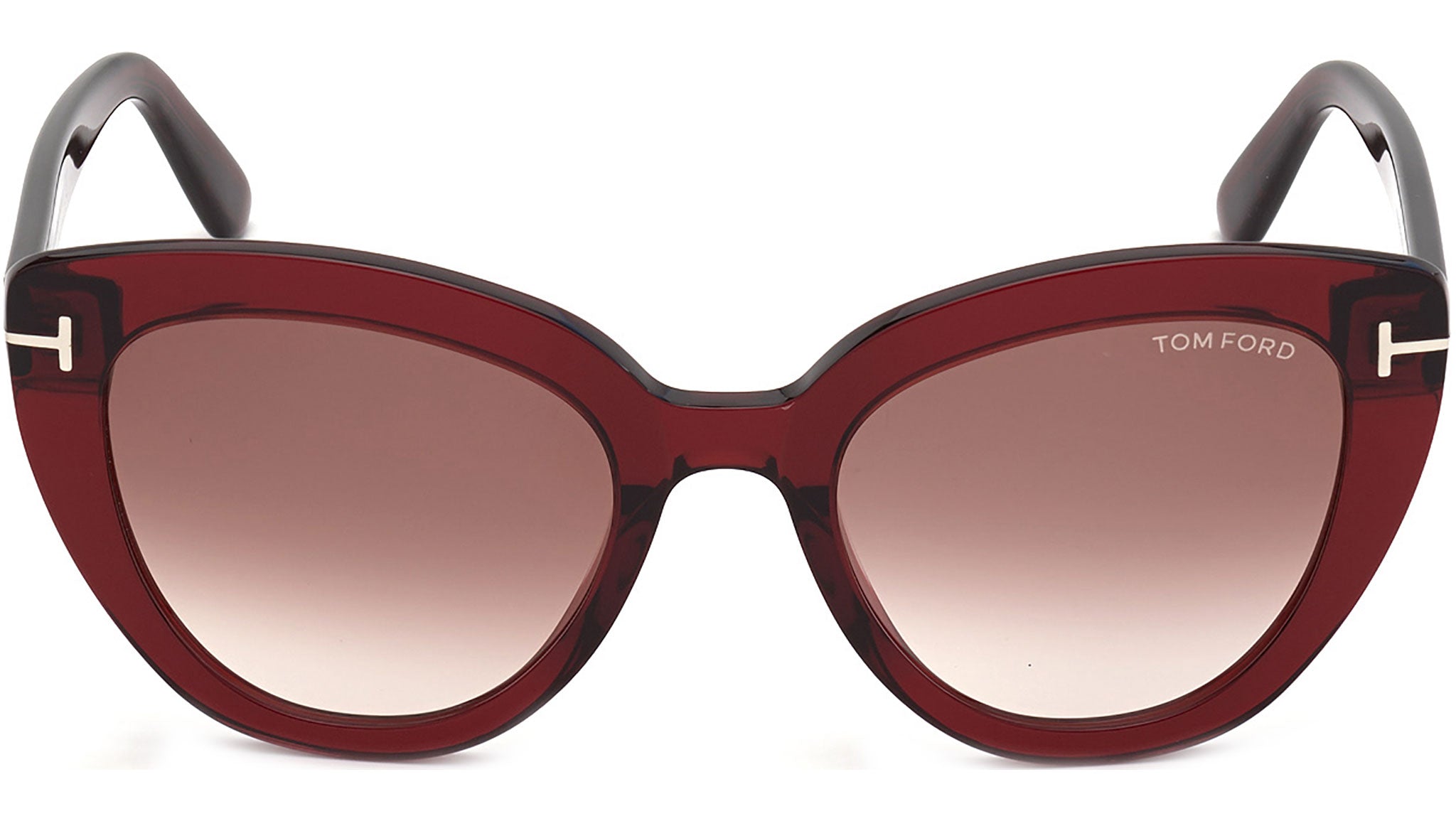 Tom Ford Izzi sunglasses model FT0845 66G featuring transparent red frame and brown mirror lens.