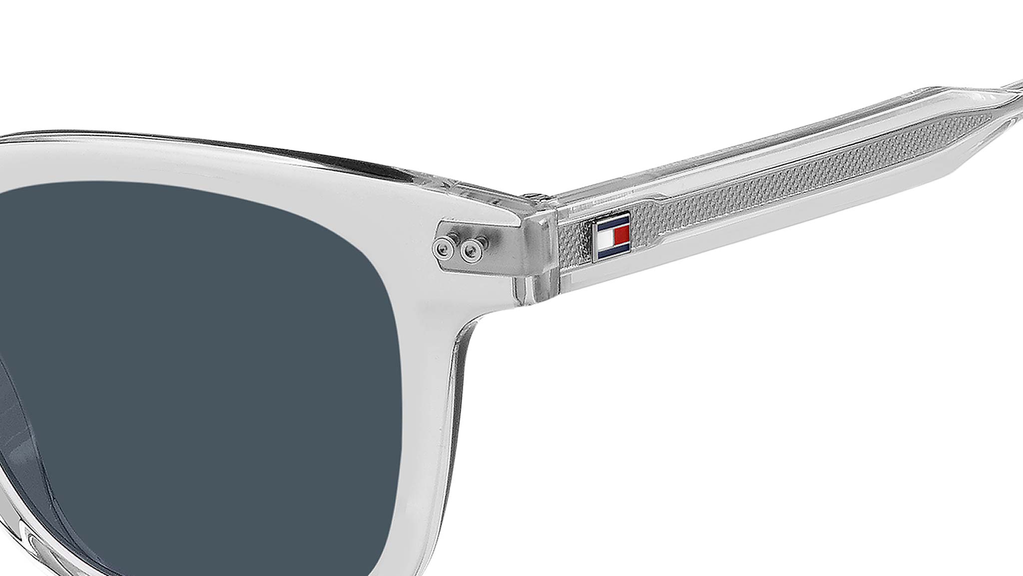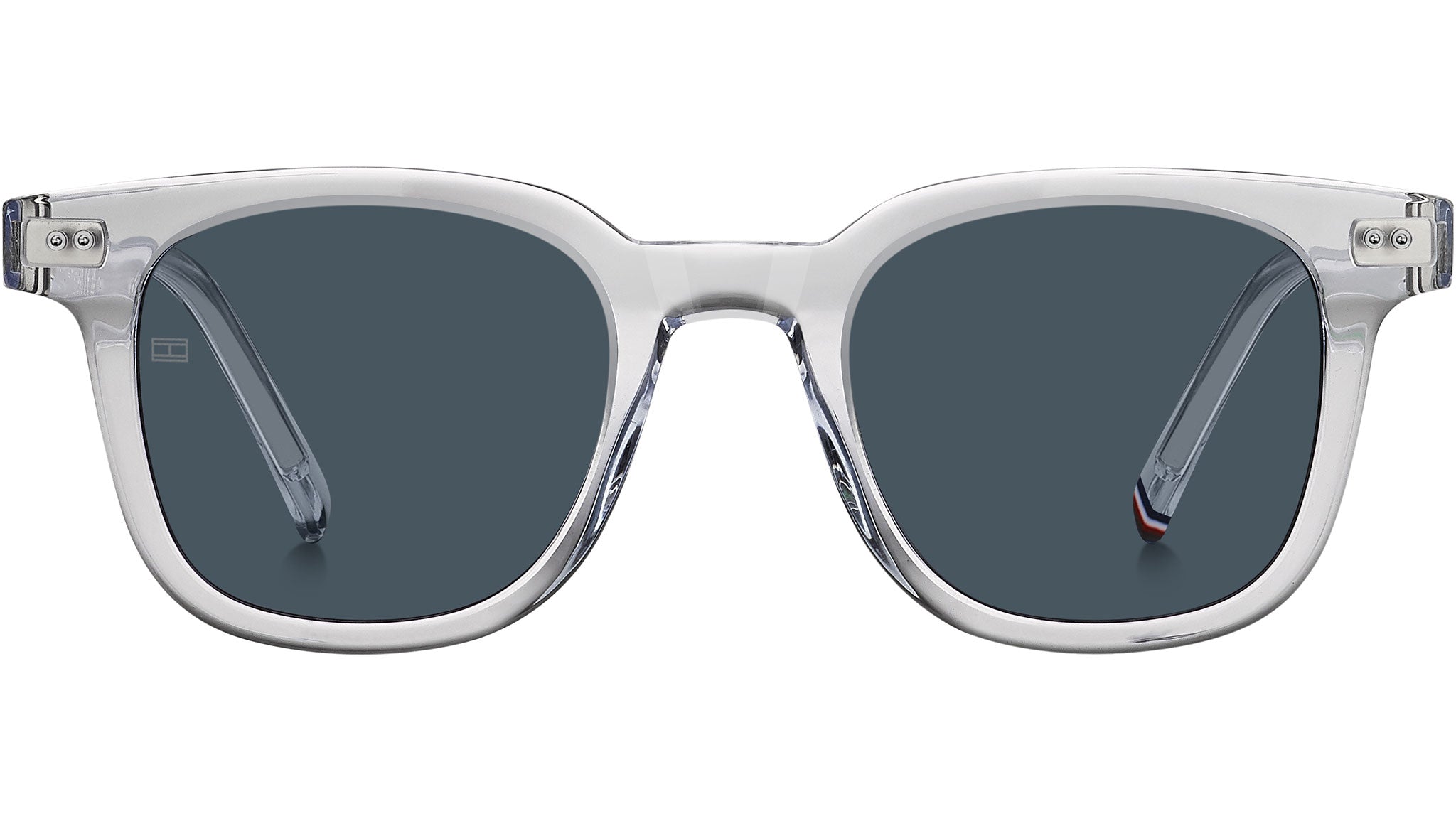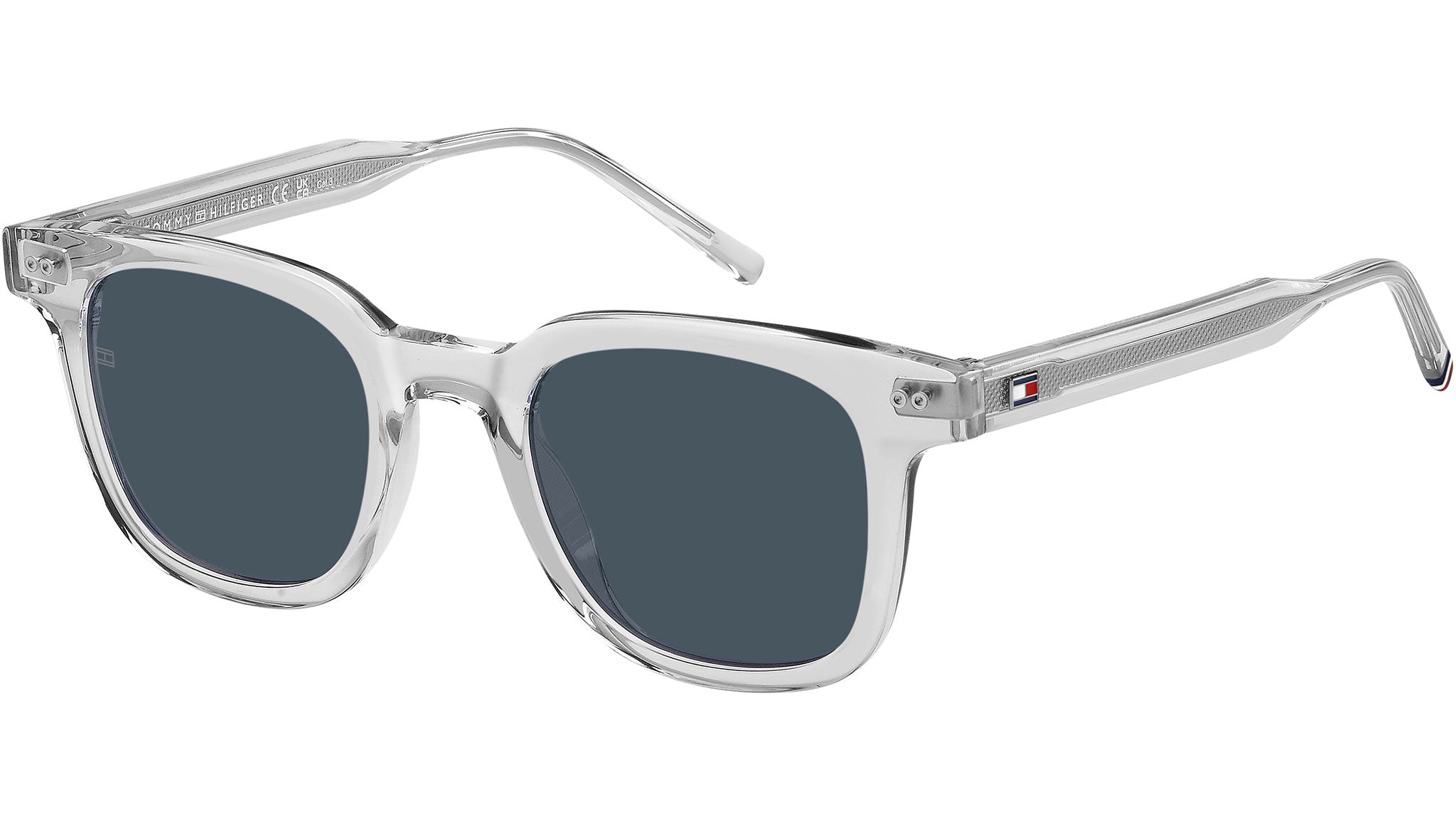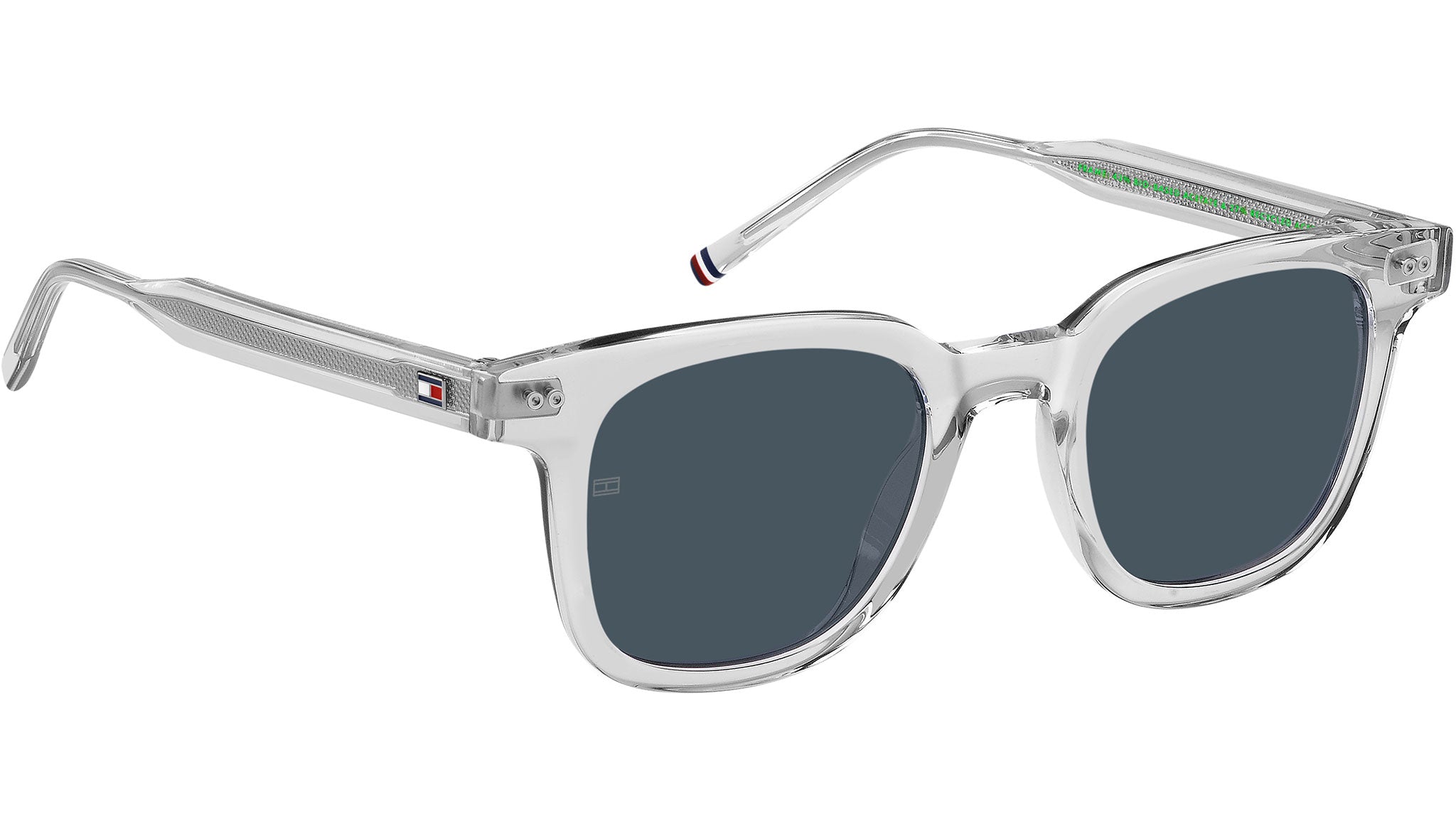 Tommy Hilfiger TH 2126/S 900 KU sunglasses featuring crystal rectangular eco acetate frame and blue lenses. A varsity soul and preppy inspiration define these men's sunglasses by Tommy Hilfiger. The brand's most distinct style is also more sustainable thanks to their construction in bio-based acetate. Their classic design includes modern elements, such as the round rivets, the new logo on the temples and the ribbon on the left end tip. These glasses come in neutral tones and options with a visible wire core. These glasses can be fitted with prescription sun lenses. Brand line: Modern Preppy. Style code: 207566. Color code: 900 KU. Authorized Tommy Hilfiger online reseller. Your glasses will include the original case and accessories and are covered by a 12-month global warranty.