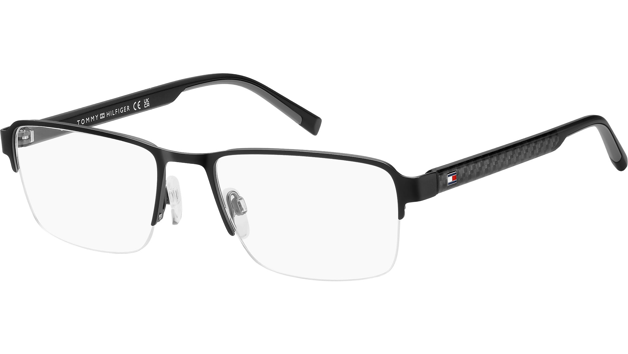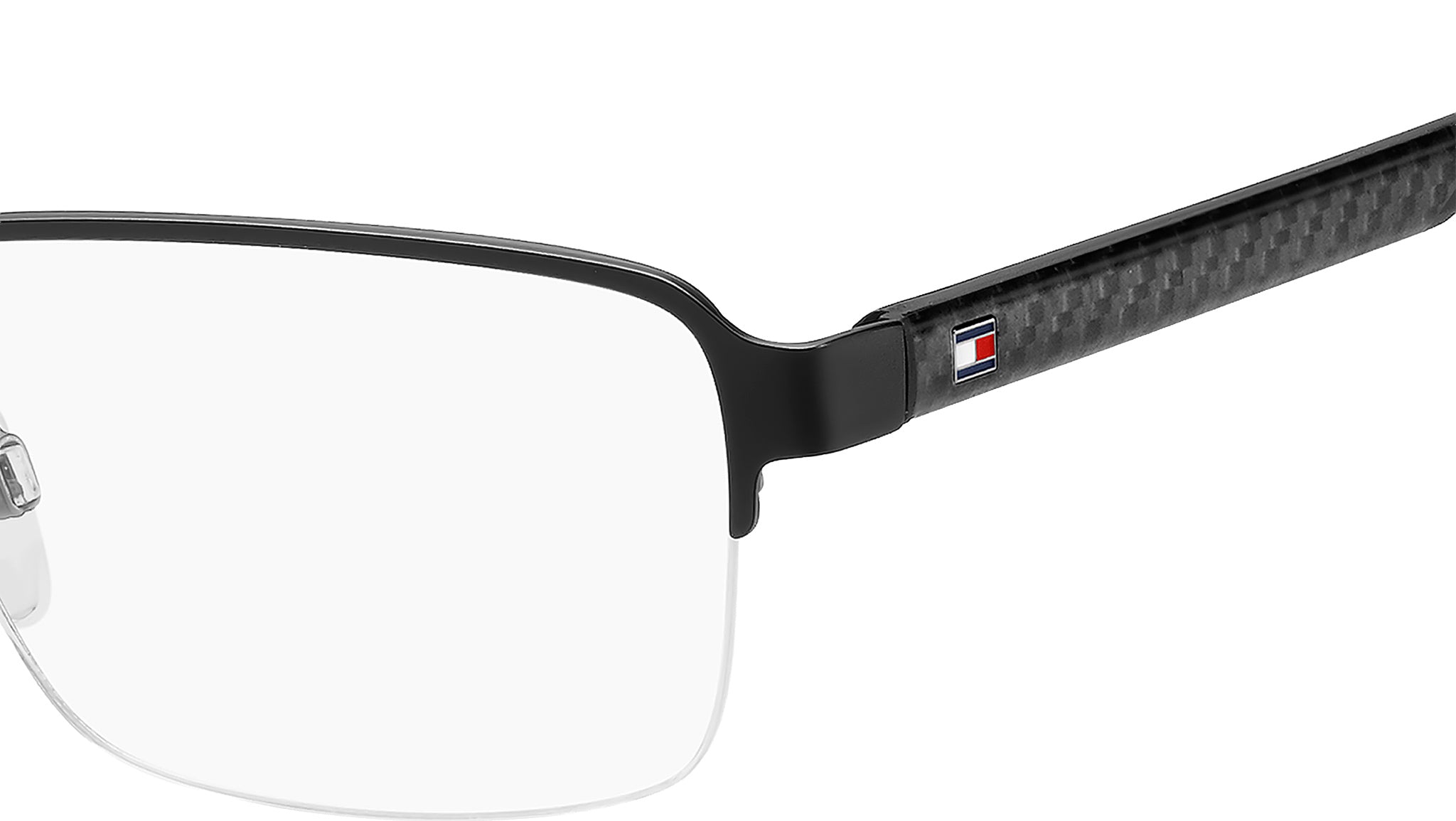 Tommy Hilfiger TH 2197 003 glasses featuring matte black rectangular metal frame and demo lenses. Tommy Hilfiger eyeglasses with numerous technical qualities, starting with the temples with inserts in carbon fibre, a lightweight and highly durable material. The hinges are flexible, the end tips are rubberised and the nose pads are in soft silicone. The result? Unrivalled comfort. As an aesthetic note, the iconci Flag enriched the style by the brand's polo shirts is enriched by the Tommy Hilfiger flag and a reserved, masculine colour palette. Brand line: Sporty. Style code: 109447. Color code: 003. Authorized Tommy Hilfiger online reseller. Your glasses will include the original case and accessories and are covered by a 12-month global warranty.