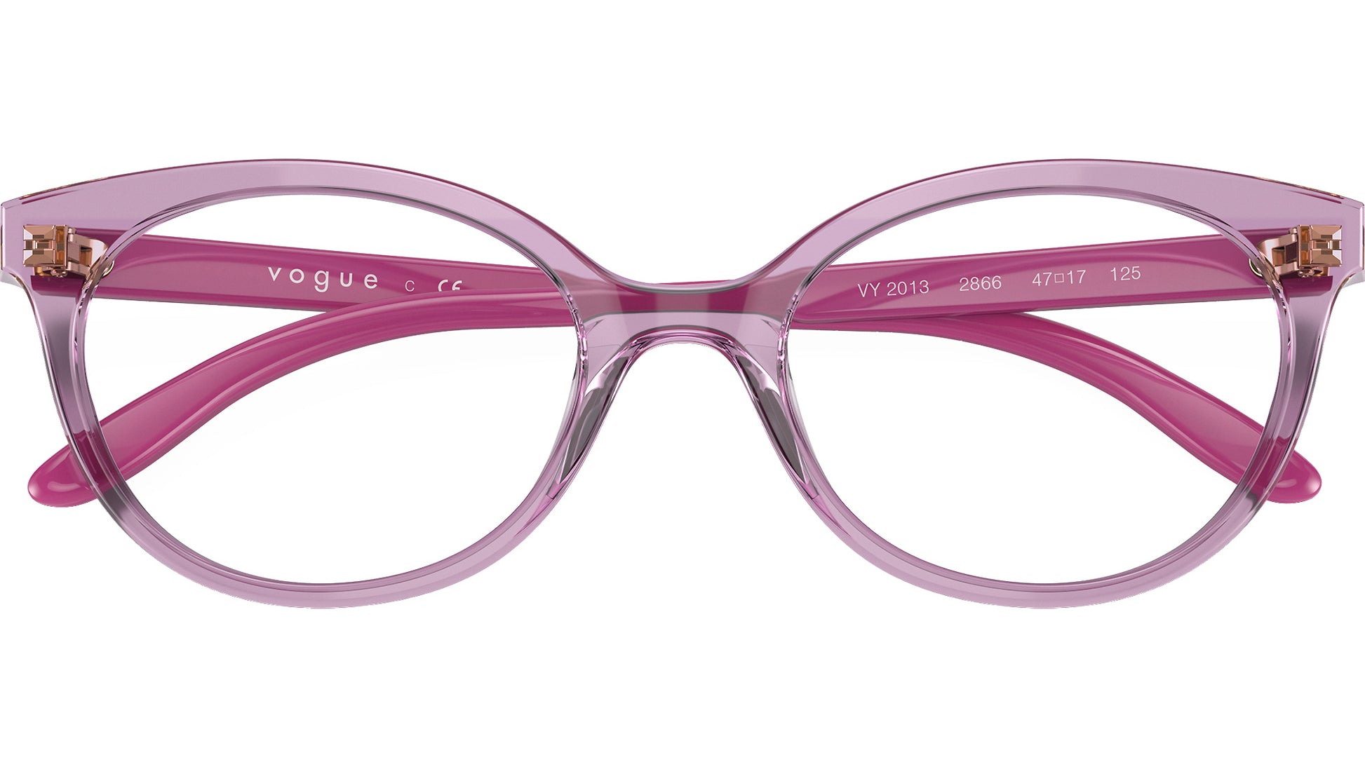 Vogue glasses for boys and girls model VY2013 2866 featuring transparent violet acetate frame and base 4 demo lens. High bridge fit. Frame line: Kids. Brand code: 0VY2013. Color code: 2866. Authorised Vogue Eyewear Online Reseller. Your glasses will come including the original case and accessories and will be covered by 12 month global warranty.