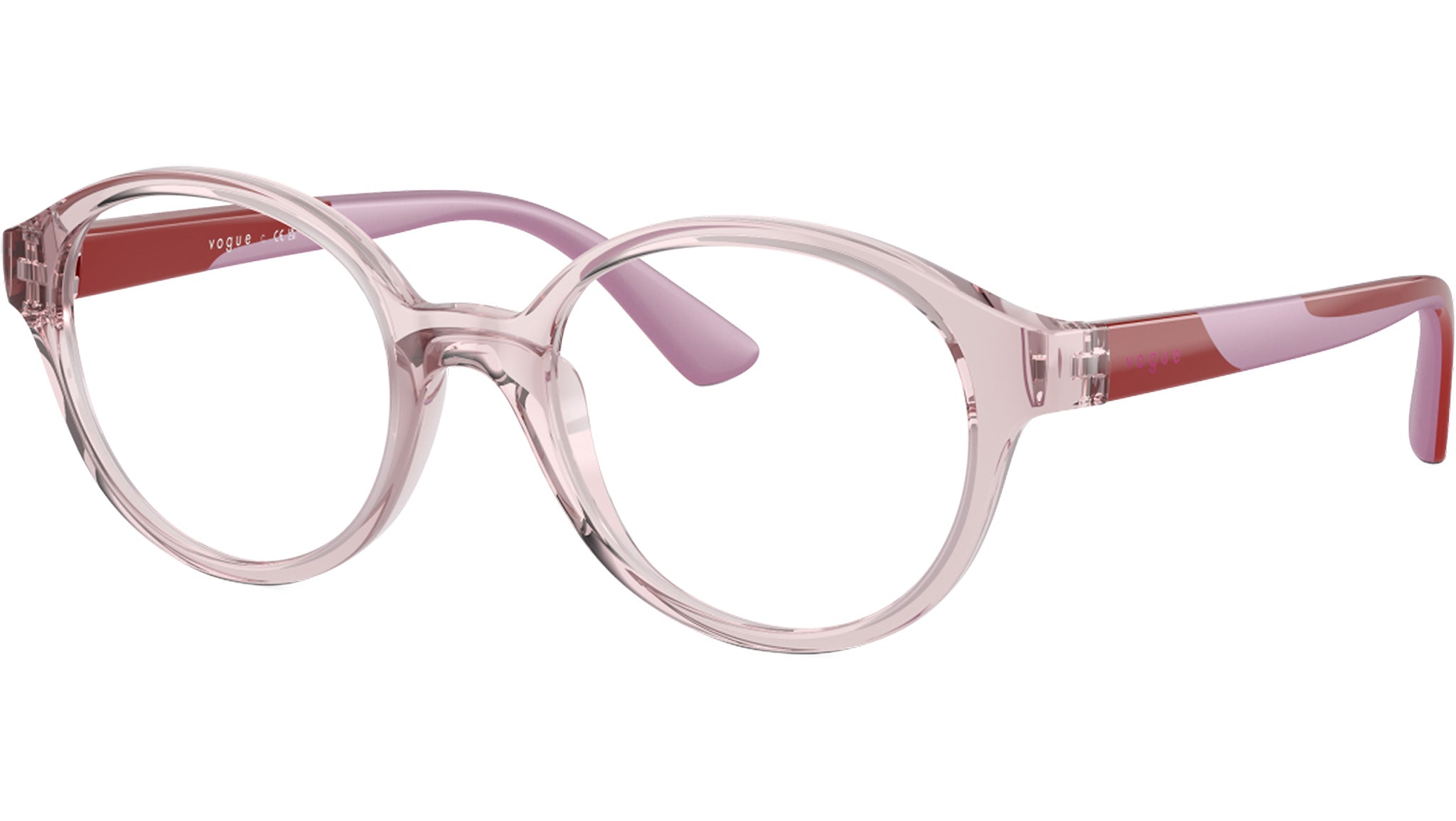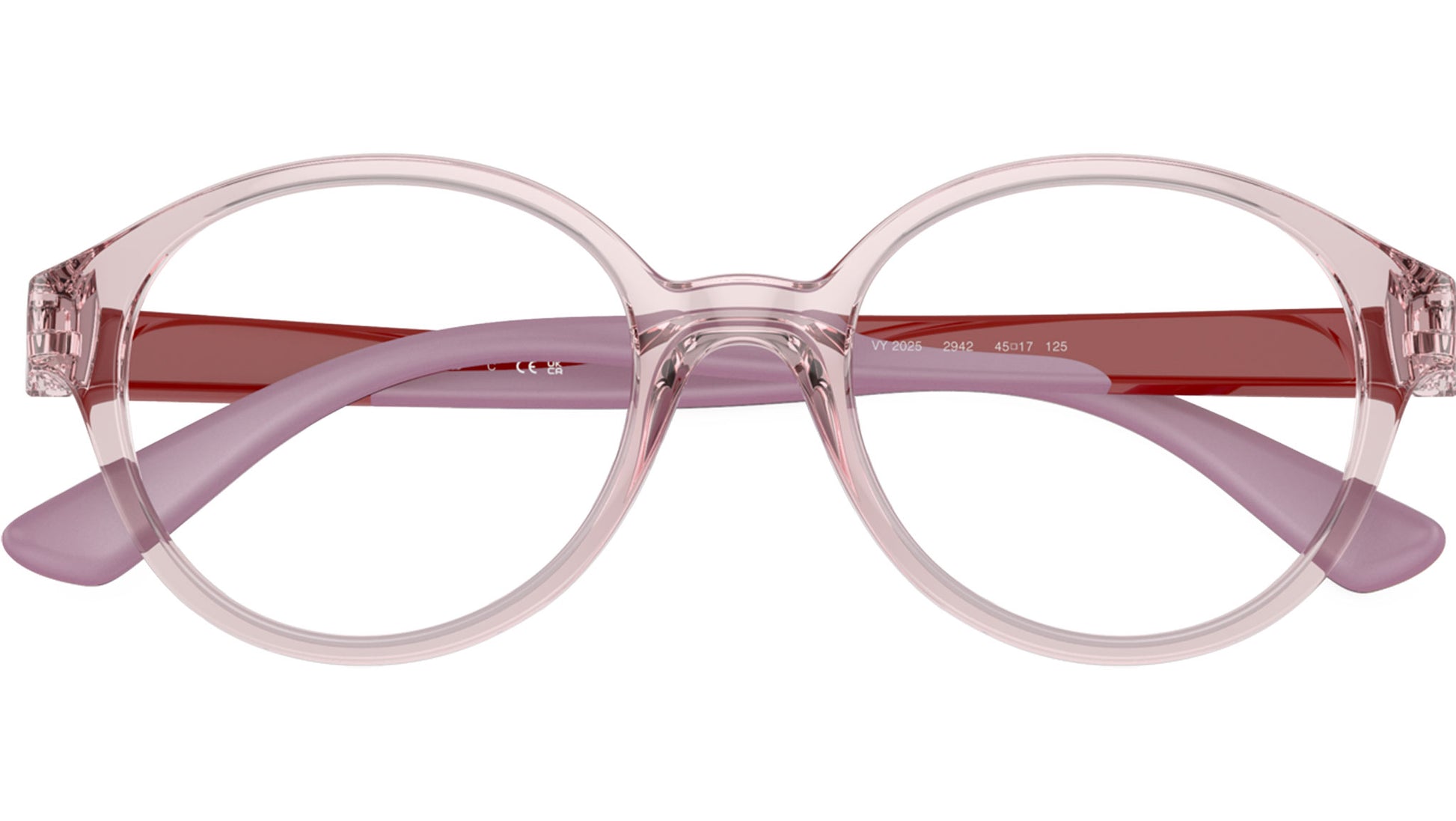 Vogue glasses for boys and girls model VY2025 2942 featuring transparent rose nylon frame and base 4 demo lens. High bridge fit. Frame line: Kids. Brand code: 0VY2025. Color code: 2942. Authorised Vogue Eyewear Online Reseller. Your glasses will come including the original case and accessories and will be covered by 12 month global warranty.