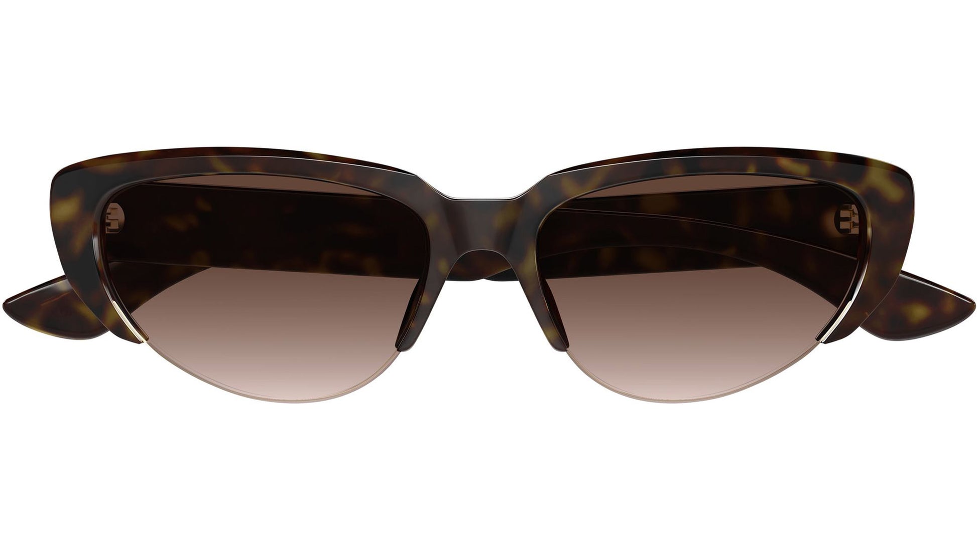 Alexander McQueen Logo line sunglasses model AM0533S for women. Cat Eye recycled acetate frame shape. Color code 002 featuring shiny dark havana front with havana temple and gradient brown lenses. Authorized Alexander McQueen online reseller. Your glasses will come with the original case and accessories and will be covered by a 12-month global warranty.