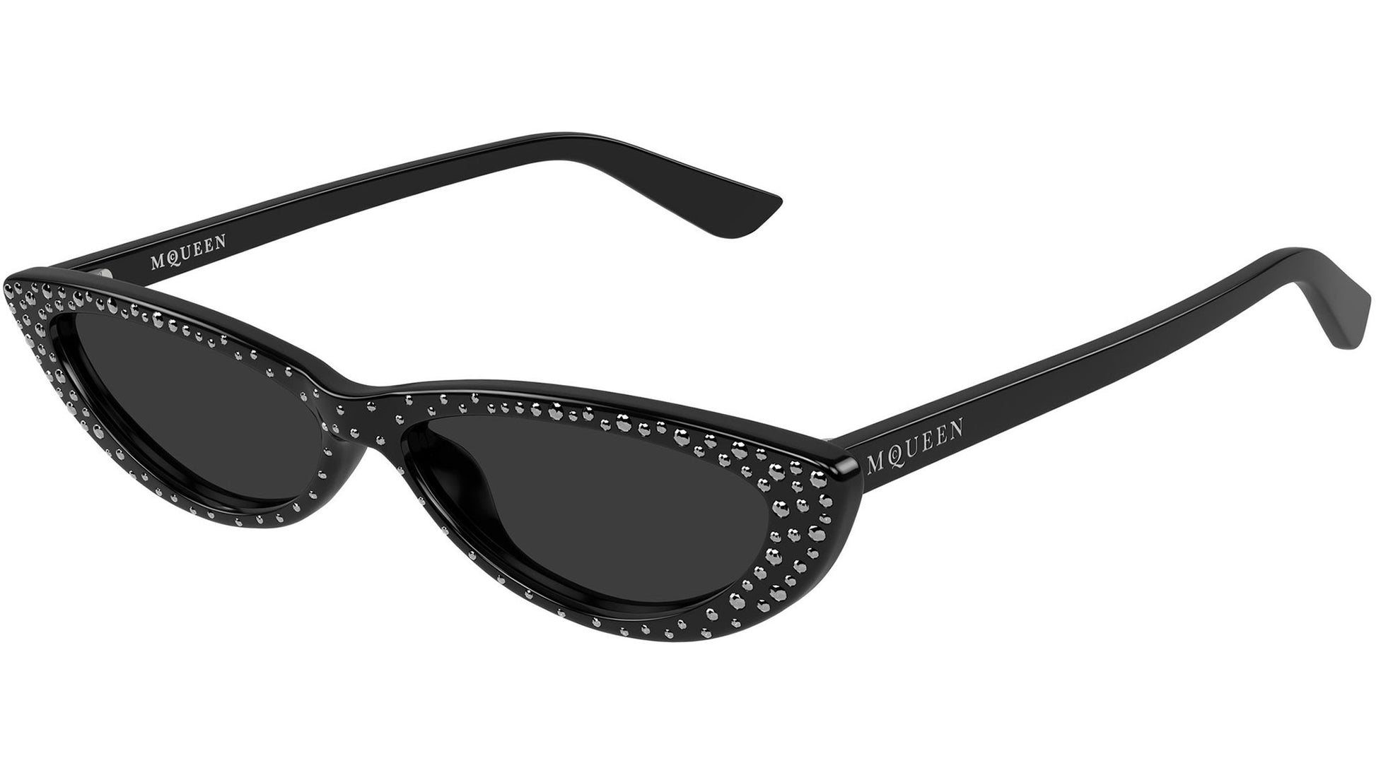 Alexander McQueen Logo line sunglasses model AM0535S for women. Panthos recycled acetate frame shape. Color code 005 featuring shiny solid black / dark grey strass front with black temple and solid grey lenses. Authorized Alexander McQueen online reseller. Your glasses will come with the original case and accessories and will be covered by a 12-month global warranty.