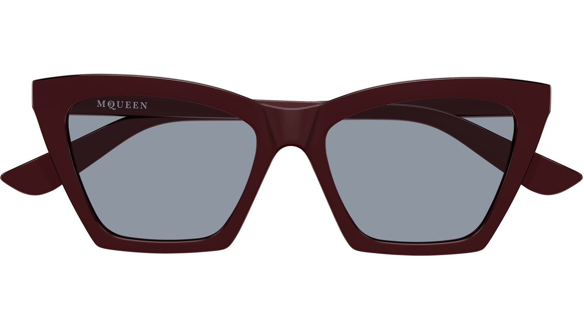 Alexander McQueen Logo line sunglasses model AM0536S for women. Cat Eye recycled acetate frame shape. Color code 004 featuring shiny solid deep burgundy front with red temple and solid light blue lenses. Authorized Alexander McQueen online reseller. Your glasses will come with the original case and accessories and will be covered by a 12-month global warranty.