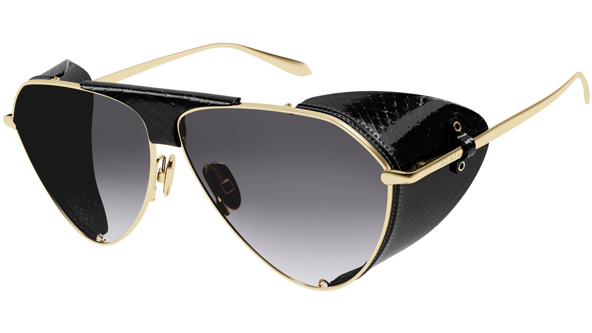 Azzedine Alaïa sunglasses collection model AA0067S color code 004 featuring shiny light gold metal / black ayers leather cover-bridge metal frame and gradient grey lens.