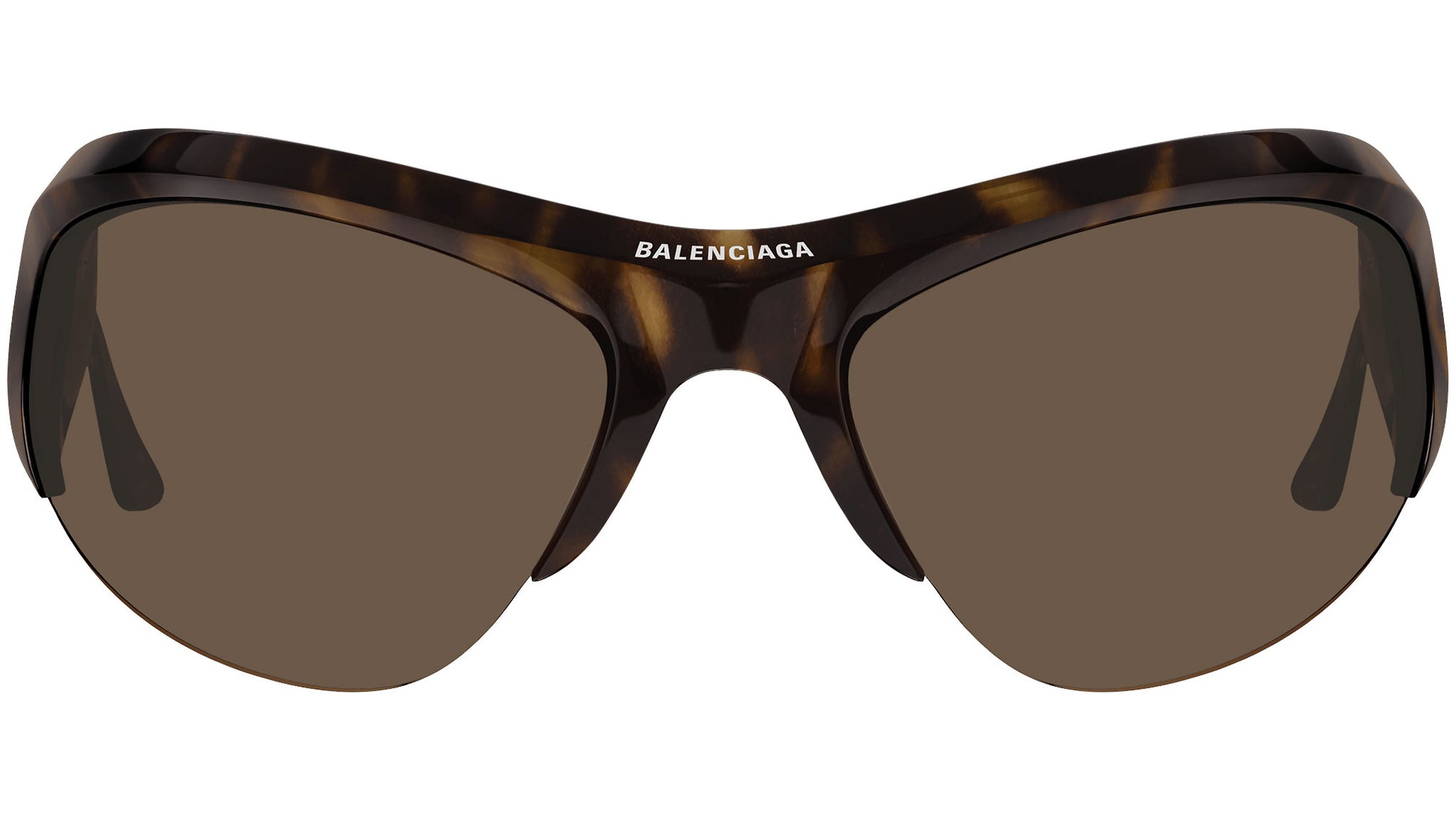 Balenciaga Extreme collection sunglasses model BB0232S 002 featuring shiny dark havana frame and solid brown (super 7 lens shape) lens.