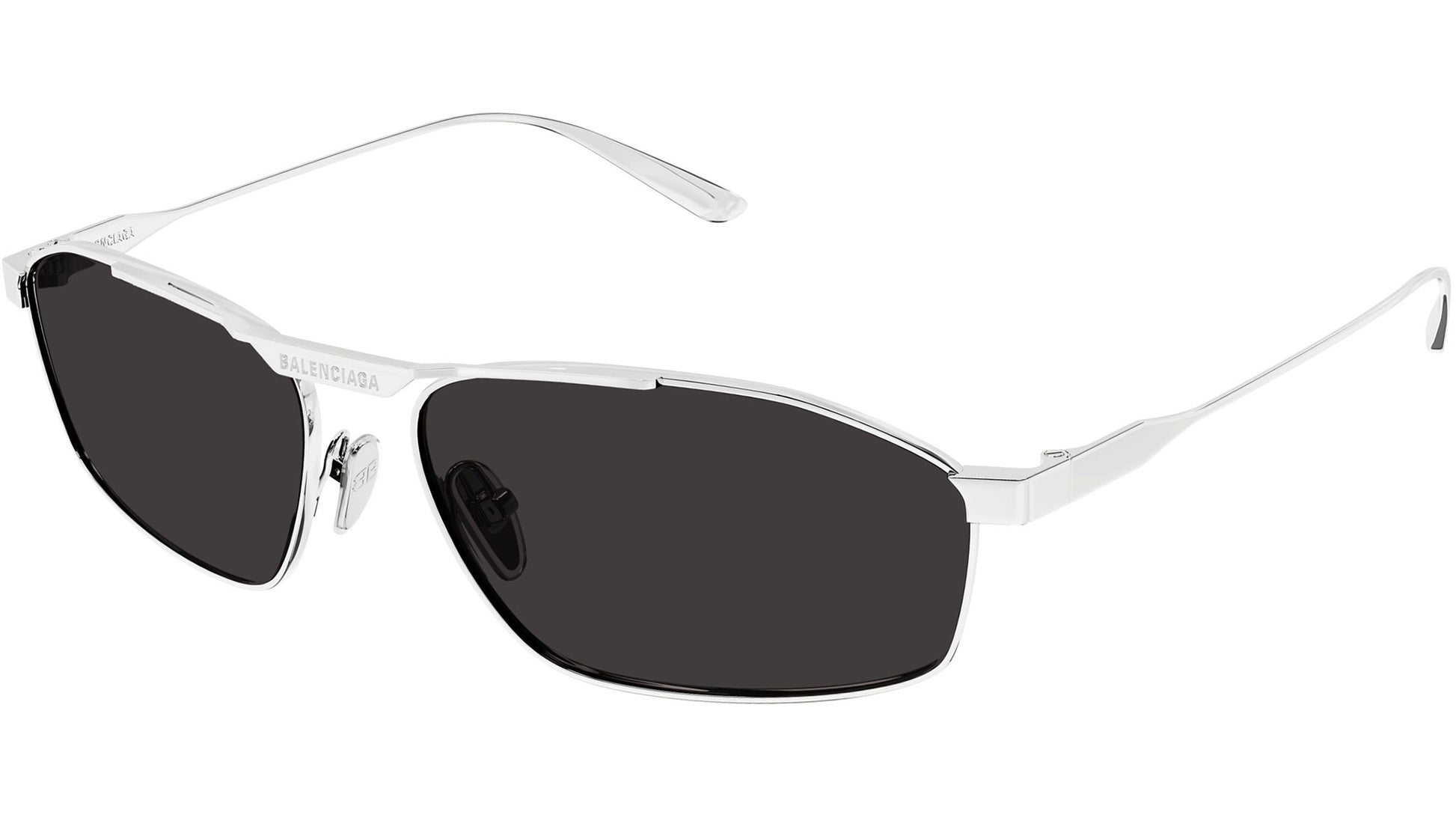 Balenciaga BB0416S 002 sunglasses for men, featuring shiny silver pilot metal frame and solid grey bio nylon lenses. Brand line: Everyday. Style code: BB0416S. Color code: 002. Made in Japan. Authorized Balenciaga online reseller. Your glasses will include the original case and accessories and are covered by a 12-month global warranty.