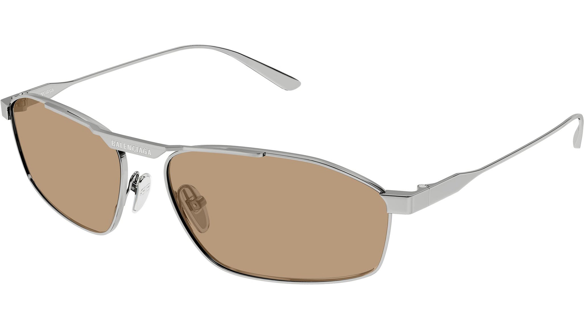 Balenciaga BB0416S 006 sunglasses for men, featuring shiny light ruthenium pilot metal frame and solid pale brown bio nylon lenses. Brand line: Everyday. Style code: BB0416S. Color code: 006. Made in Japan. Authorized Balenciaga online reseller. Your glasses will include the original case and accessories and are covered by a 12-month global warranty.