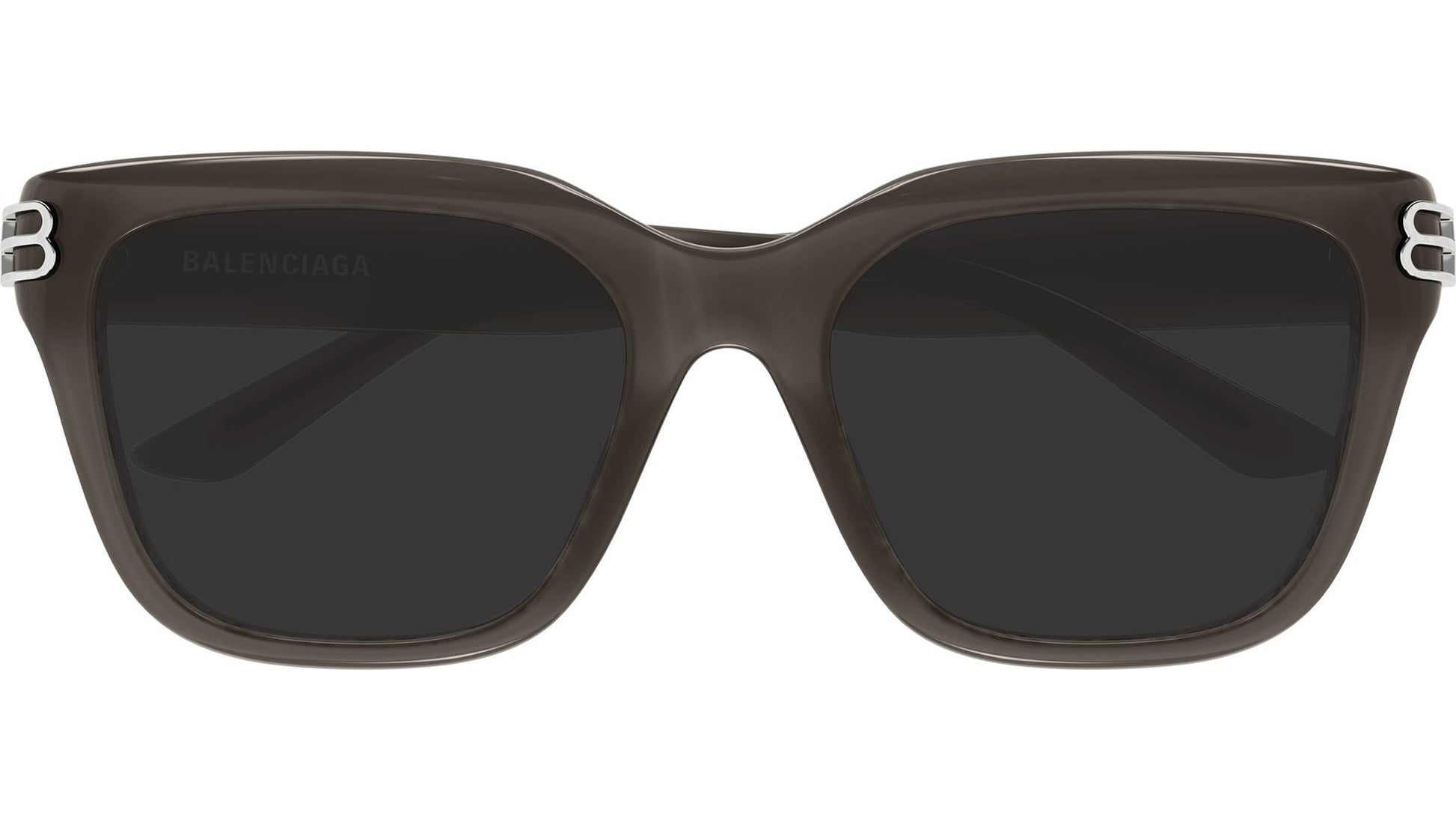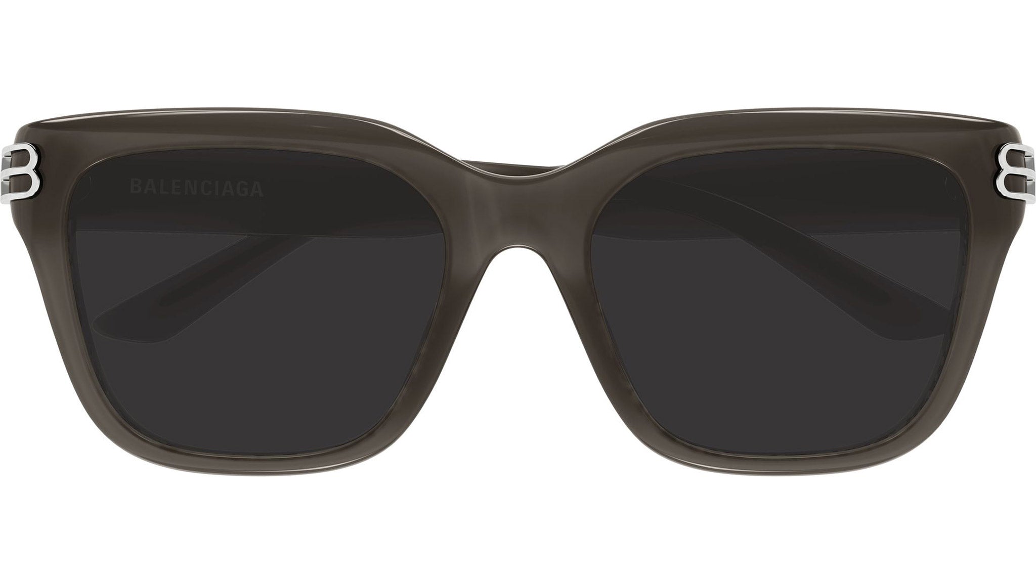 Balenciaga BB0433SK 004 sunglasses for women, featuring shiny opal dark taupe rectangular recycled acetate frame and solid grey bio nylon lenses. Brand line: Everyday. Style code: BB0433SK. Color code: 004. Made in Japan. Authorized Balenciaga online reseller. Your glasses will include the original case and accessories and are covered by a 12-month global warranty.