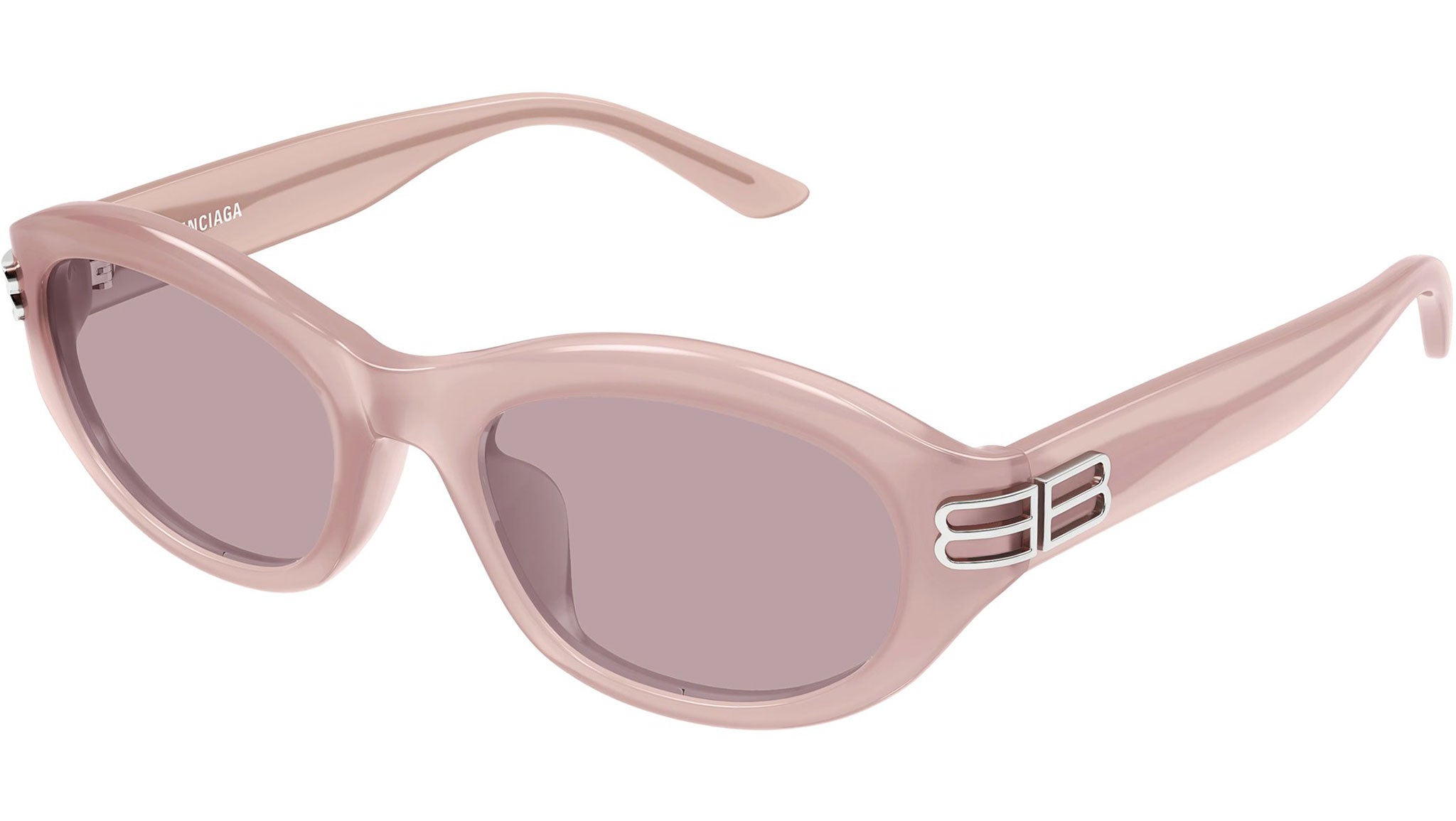 Balenciaga BB0434SK 003 sunglasses for women, featuring shiny opal pink panthos recycled acetate frame and solid violet bio nylon lenses. Brand line: Everyday. Style code: BB0434SK. Color code: 003. Made in Japan. Authorized Balenciaga online reseller. Your glasses will include the original case and accessories and are covered by a 12-month global warranty.