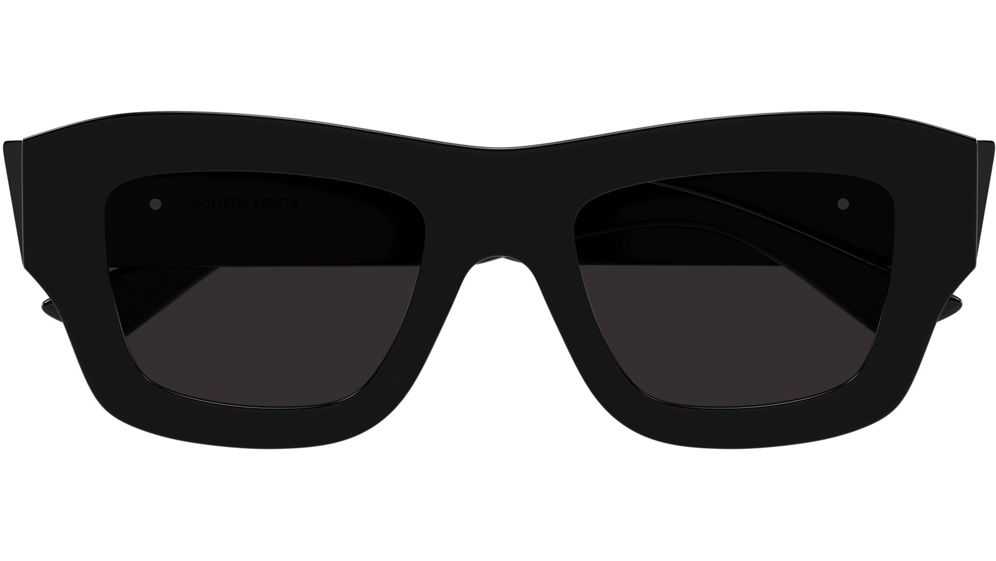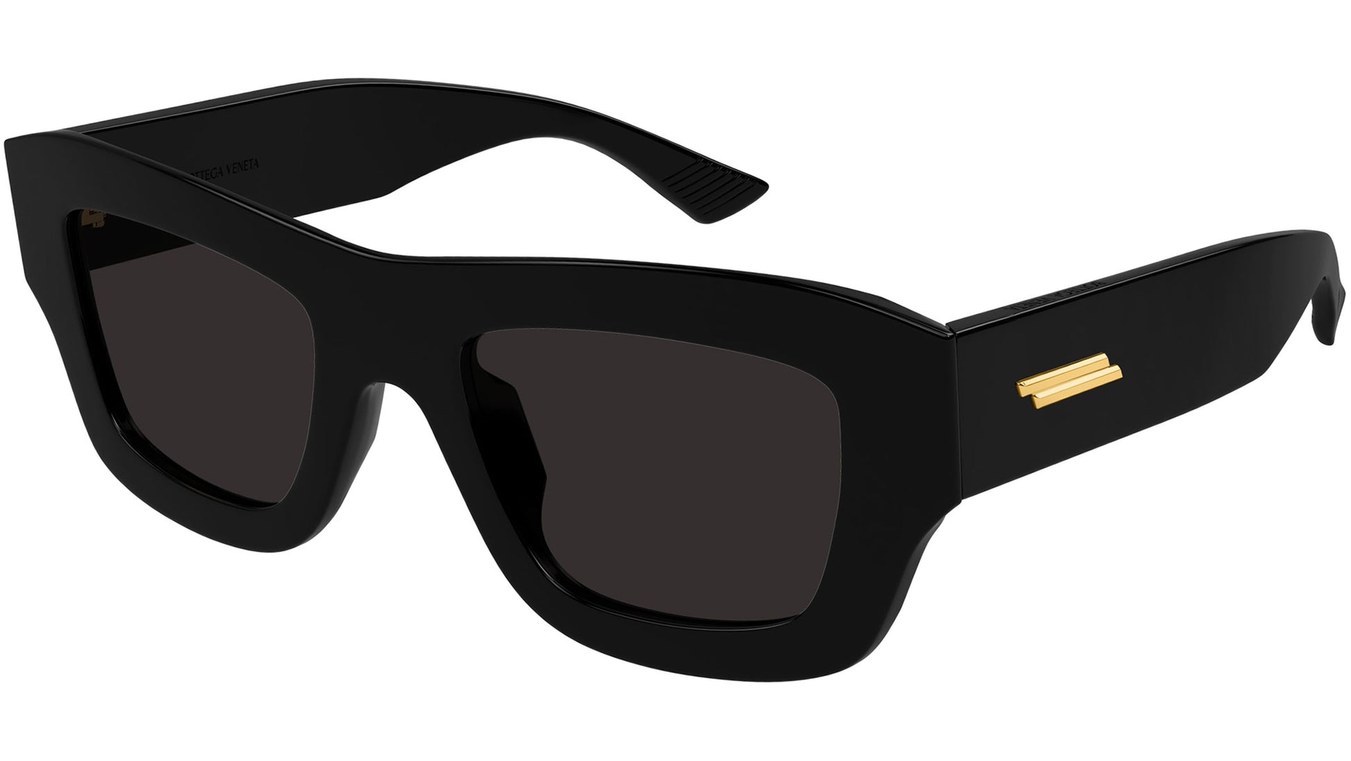 Bottega Veneta BV1357S 001 sunglasses for women, featuring shiny solid black rectangular recycled acetate frame and solid grey bio nylon lenses. Brand line: Ribbon. Style code: BV1357S. Color code: 001. Made in Italy. Authorized Bottega Veneta online reseller. Your glasses will include the original case and accessories and are covered by a 12-month global warranty.