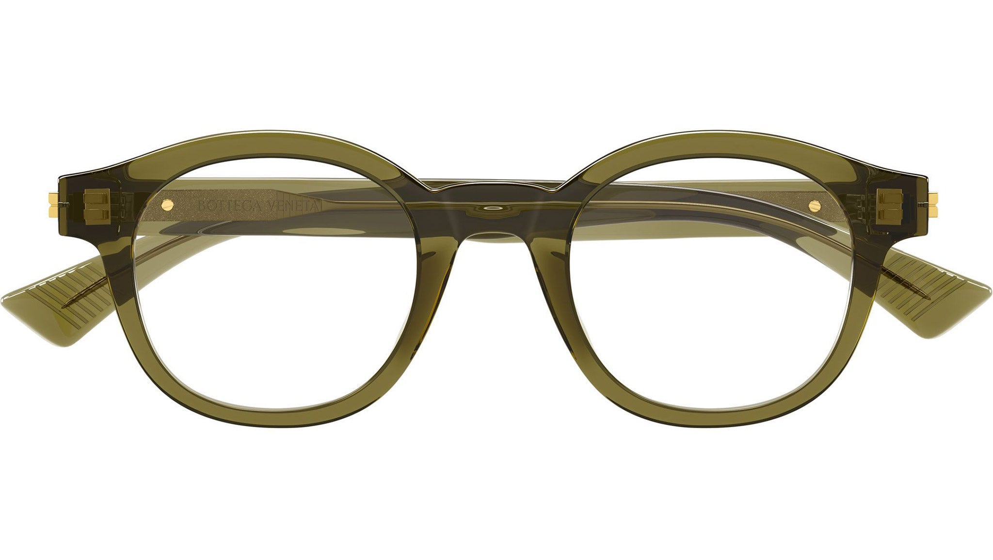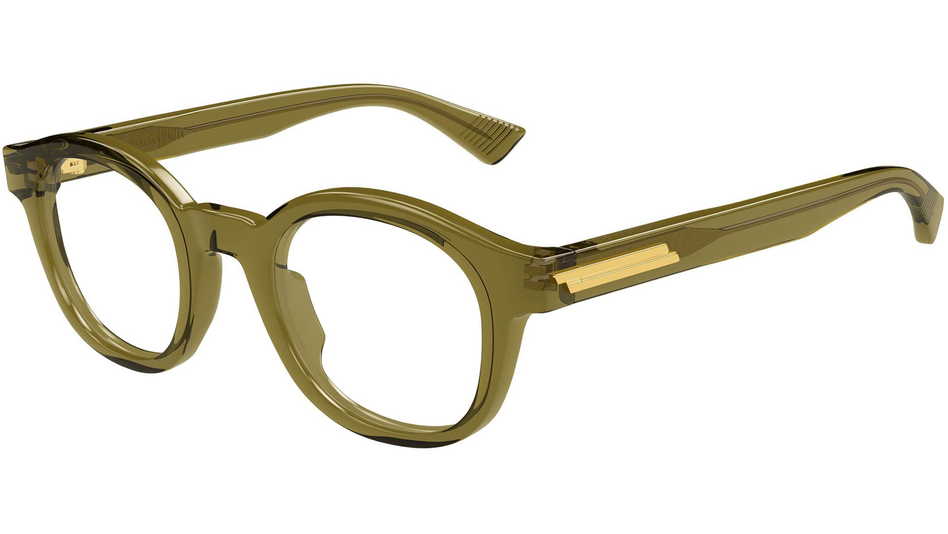 Bottega Veneta BV1413O 004 glasses for men, featuring shiny transparent vivid olive green panthos recycled acetate frame and demo lenses. Brand line: Ribbon. Style code: BV1413O. Color code: 004. Made in Japan. Authorized Bottega Veneta online reseller. Your glasses will include the original case and accessories and are covered by a 12-month global warranty.
