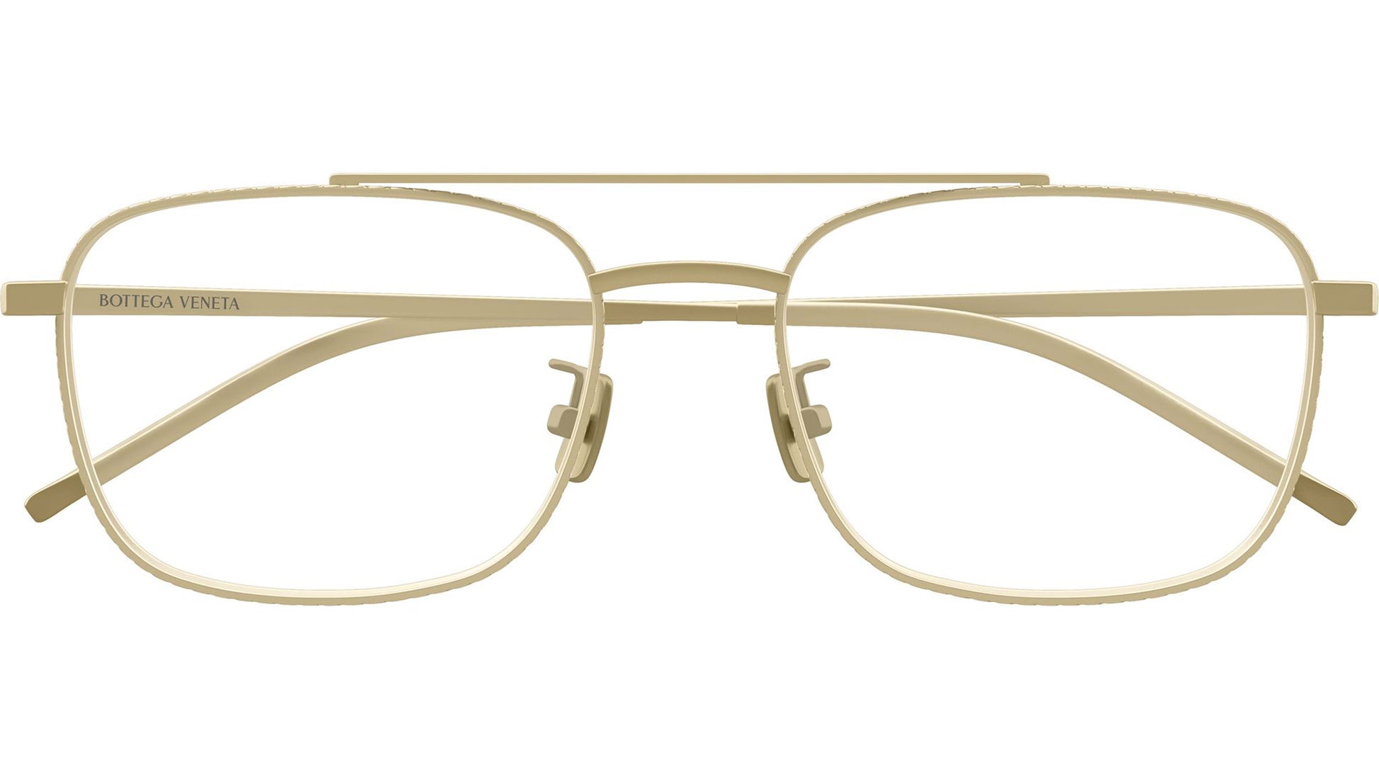 Bottega Veneta BV1425OA glasses for men and woman, featuring semimatte antique brass rectangular titanium frame and demo lenses. Brand line: Intrecciato. Style code: BV1425OA. Color code: size 57: 004. Size 55: 002. Made in Japan. Authorized Bottega Veneta online reseller. Your glasses will include the original case and accessories and are covered by a 12-month global warranty.