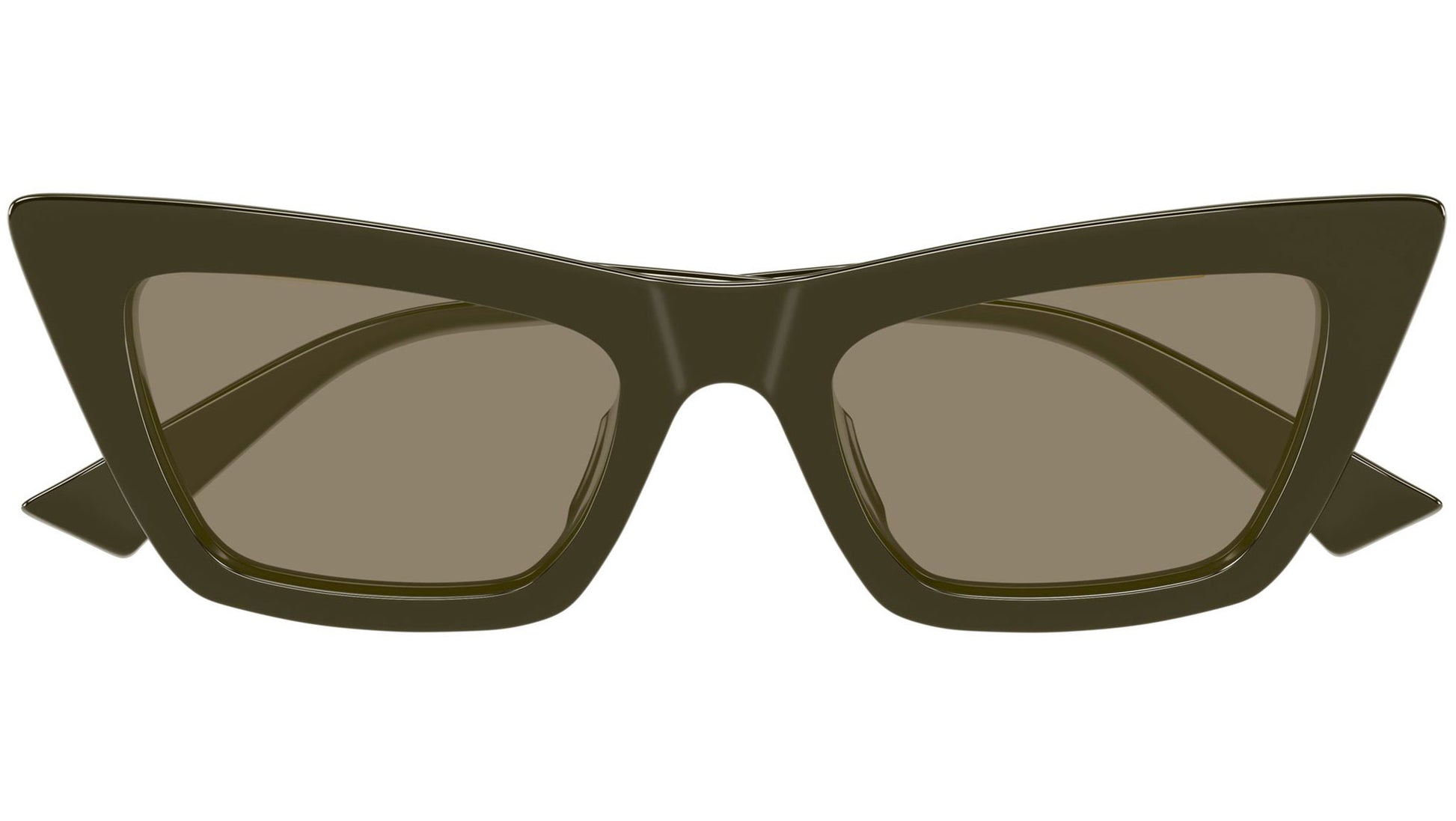 Bottega Veneta BV1446S 005 sunglasses for women, featuring shiny solid dark green cat eye recycled acetate frame and solid light tobac bio nylon lenses. Brand line: Ribbon. Style code: BV1446S. Color code: 005. Made in Italy. Authorized Bottega Veneta online reseller. Your glasses will include the original case and accessories and are covered by a 12-month global warranty.