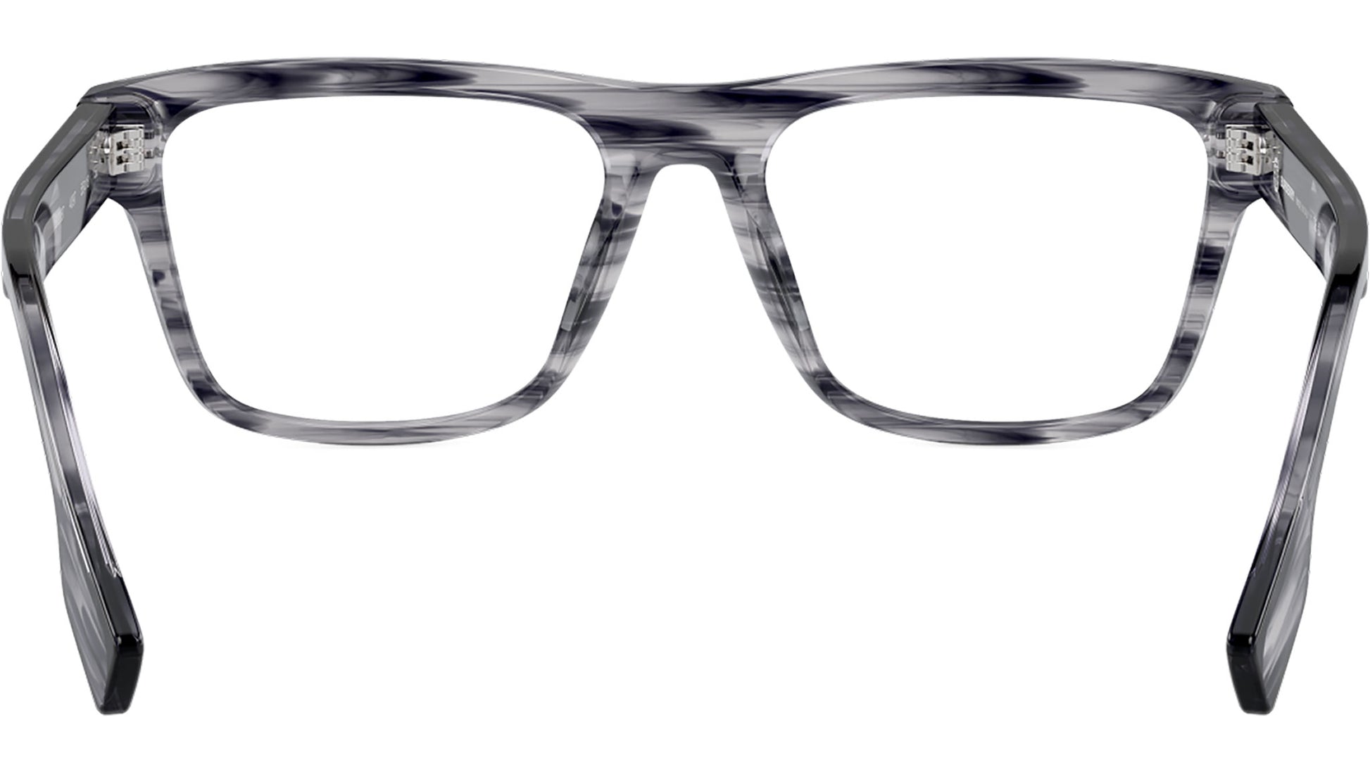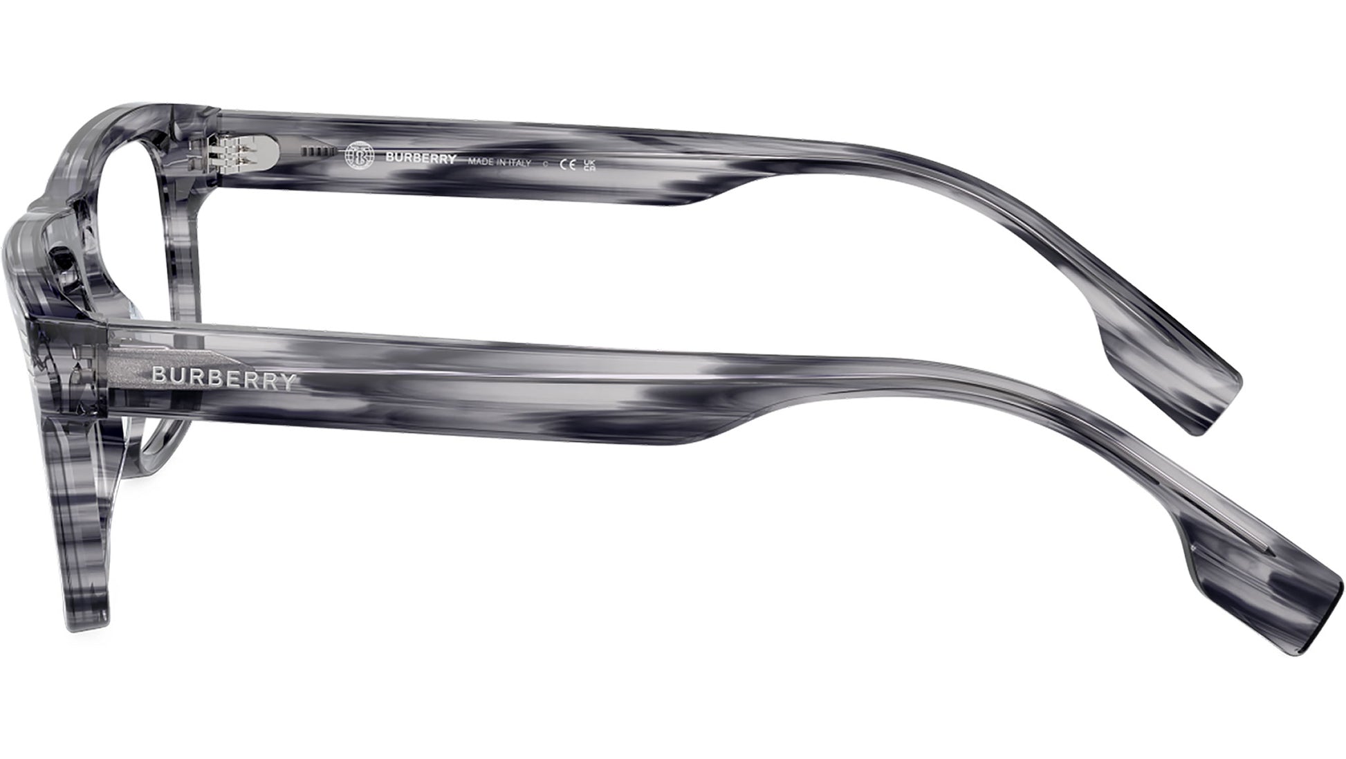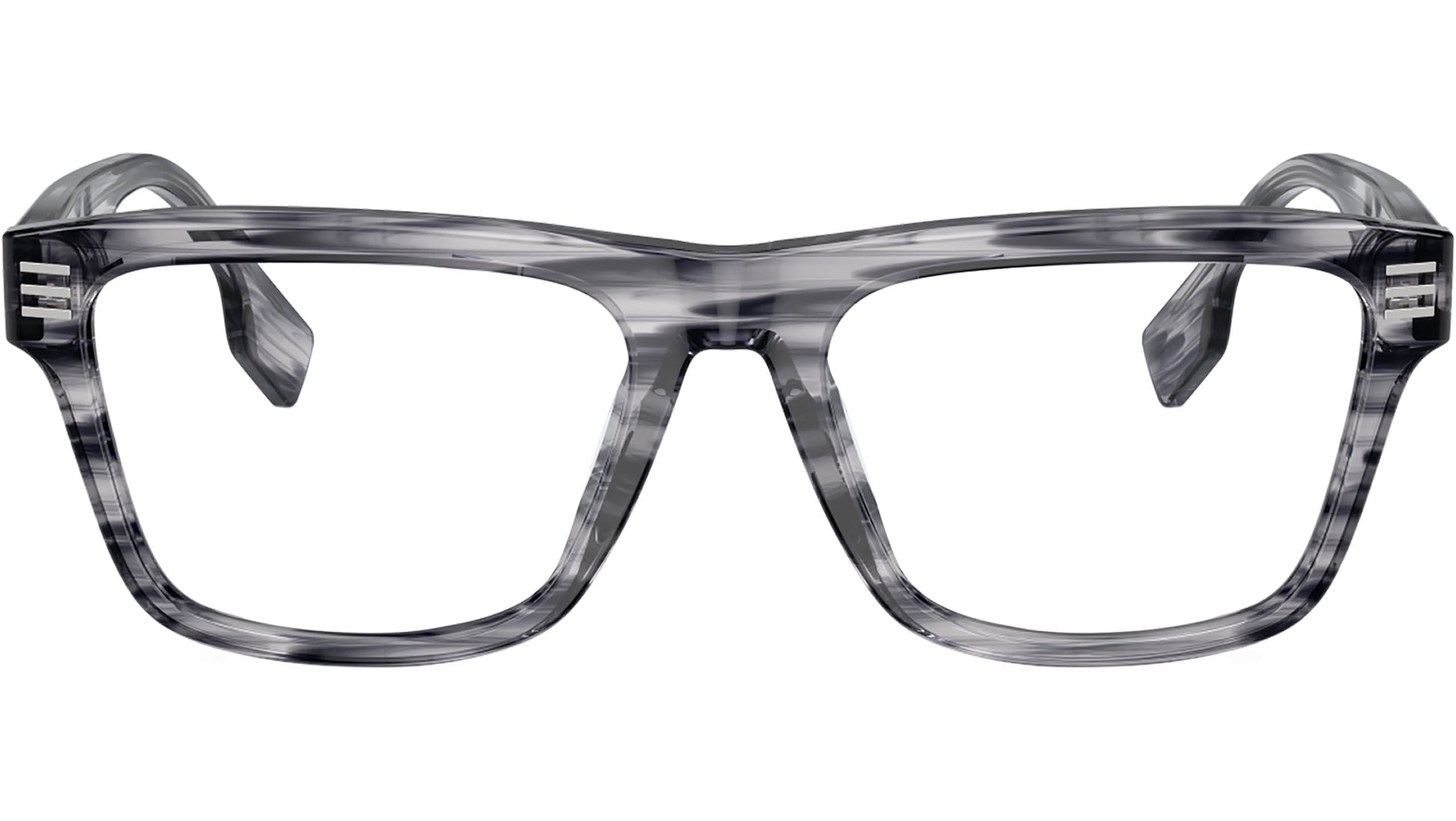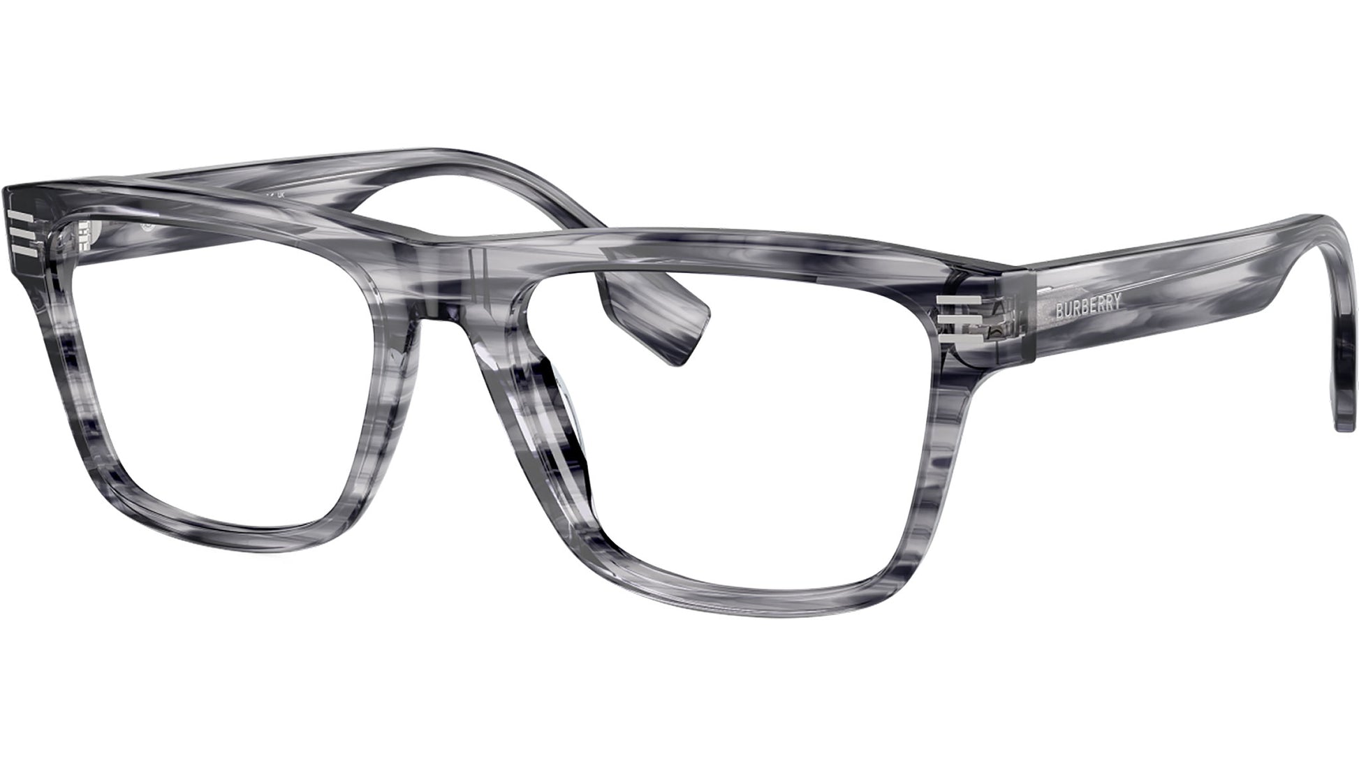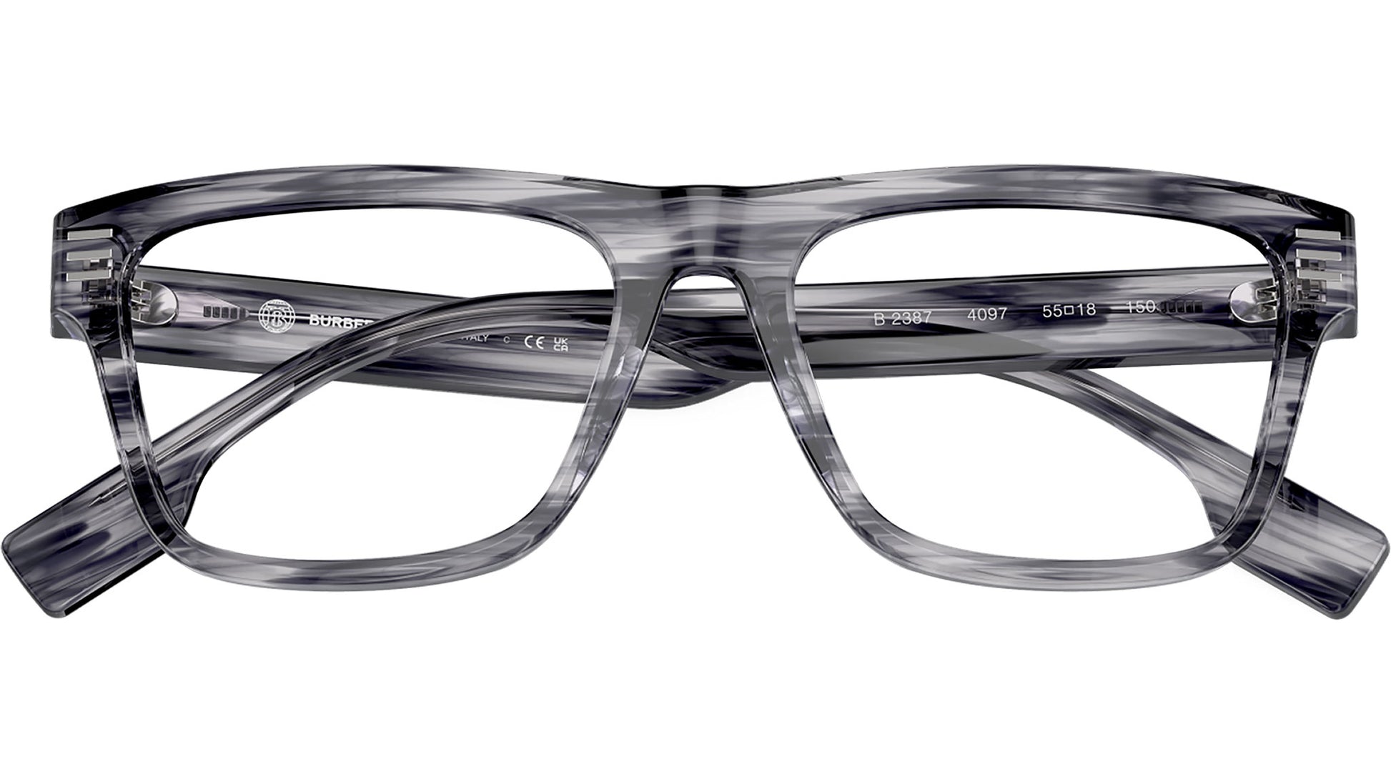 Burberry eyeglasses for men model 2387 featuring grey full rim acetate frame and base 4 curve demo lens. high bridge fit. Frame line: B. Stripe. Brand code: BE2387. Color code: 4097. Authorised Burberry Online Reseller. Your glasses will come including the original case and accessories and will be covered by 12 month global warranty.