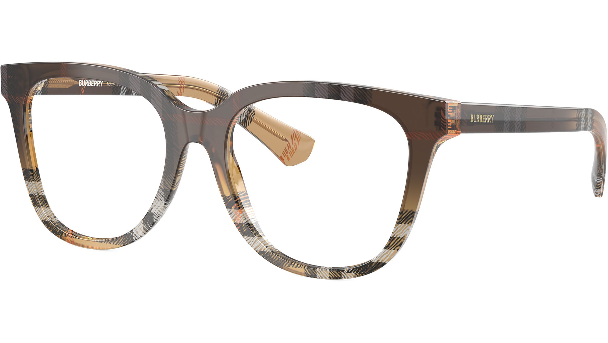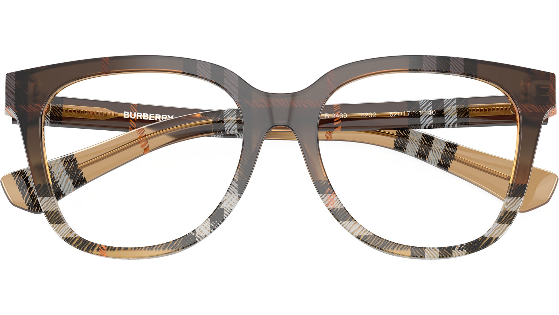 Burberry eyeglasses for women BE2439 4202 featuring check sand full rim acetate frame and demo lenses. High bridge fit. Suggested size: M. Frame line: Gradient Check. Brand code: 0BE2439. Color code: 4202. Authorised Burberry Online Reseller. Your glasses will include the original case and accessories and will be covered by 12 month global warranty.