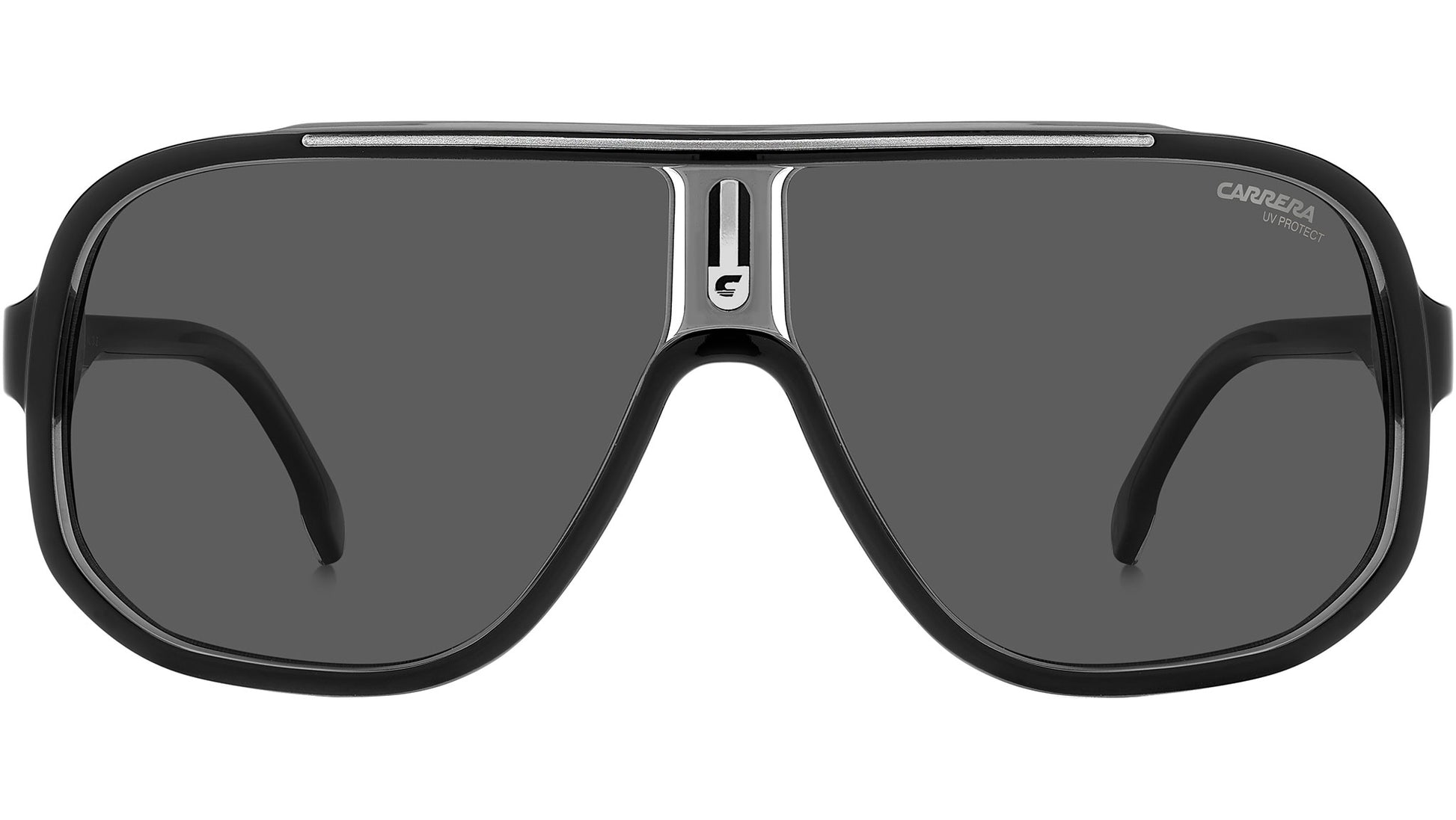 Carrera sunglasses model 1058/S color code 08A M9 Black Grey. These men's sunglasses give off strong retro vibes due to the navigator frame, so prevalent in Carrera's history. Made of injection-moulded polyamide, they come in neutral shades with contrasting colour combinations, the most significant of which is the brand's trademark flag along the temples. The full-coverage frames come with gradient or solid tint lenses (including one polarised option), rendered unforgettable thanks to the Carrera "C" insert.