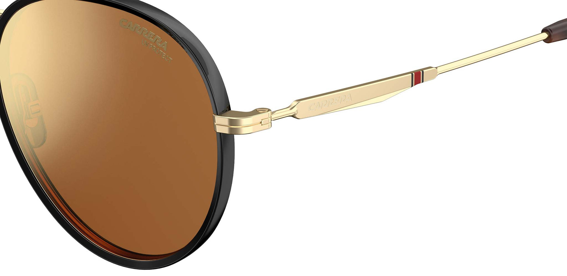 For Spring/Summer, Carrera achieves the seemingly impossible by marrying supreme comfort with superior quality and aesthetic. Case in point: these round sunglasses crafted from a lightweight combination of acetate and metal, making them a comfortable choice for daily wear. Notice the unique double-layered construction - the metal frame front outlined with smooth acetate rims - as well as the iconic Flag symbol adding a touch of signature luxury. Complemented by sleek metal temples with curved acetate tips, a laser-engraved Carrera lettering on each side as well as a discreet 'C' logo inside the left end tip, this sophisticated pair also features mirrored bronze lenses, which means that, as well as working for an active lifestyle, they'll also look good in the sun.