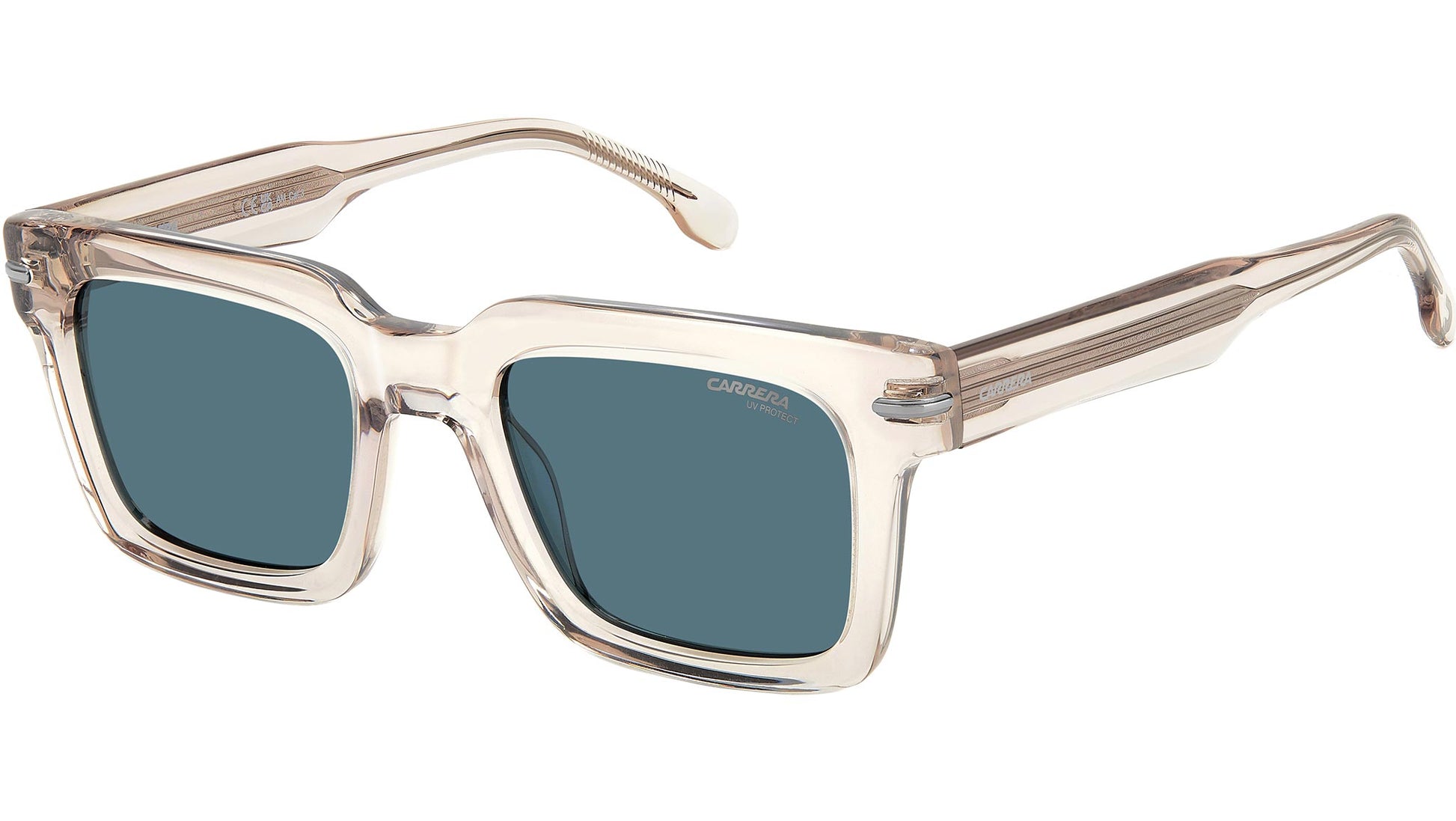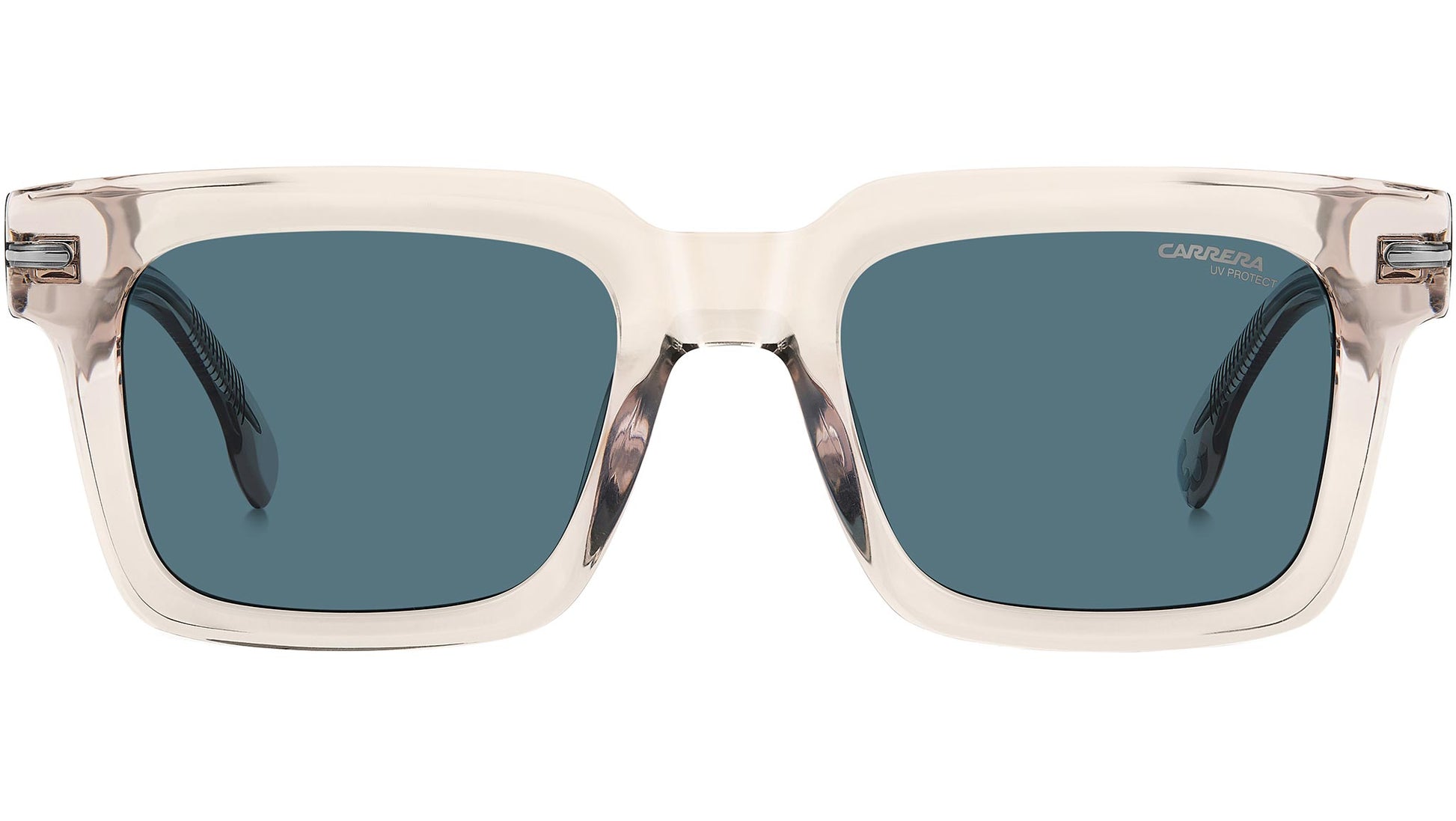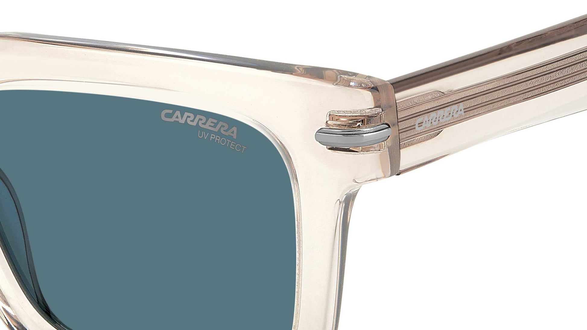Carrera sunglasses model 316/S color code FWM KU Nude. With bold proportions and bevelled edges, these Carrera sunglasses were designed to stand out. They feature an acetate structure that, as eyewear connoisseurs are sure to note, features the brand's sculpted metal ‘C’ detail. The square shape is a point of interest, and the frames can also hold prescription lenses. Carrera is offering them in various versions: multi-layer, clear with a visible core, and with polarized lenses.
