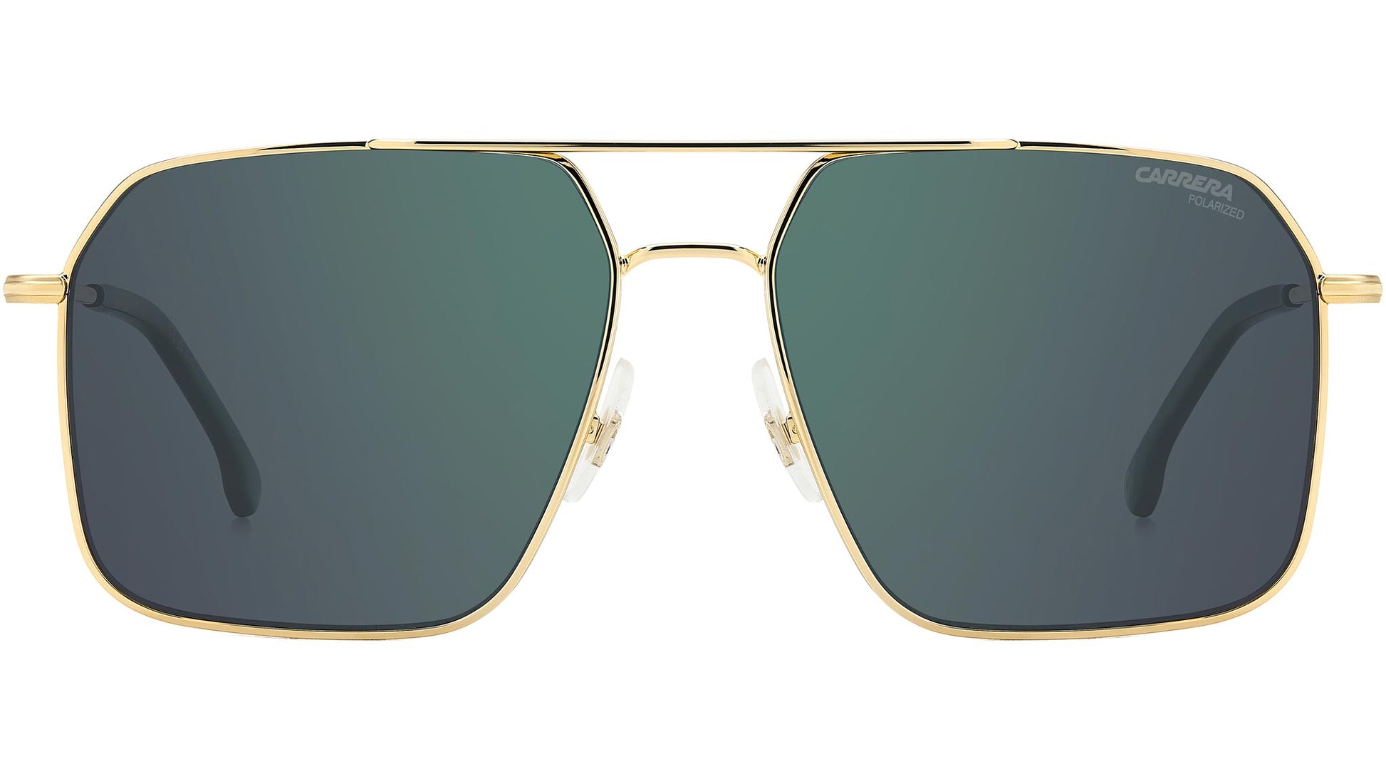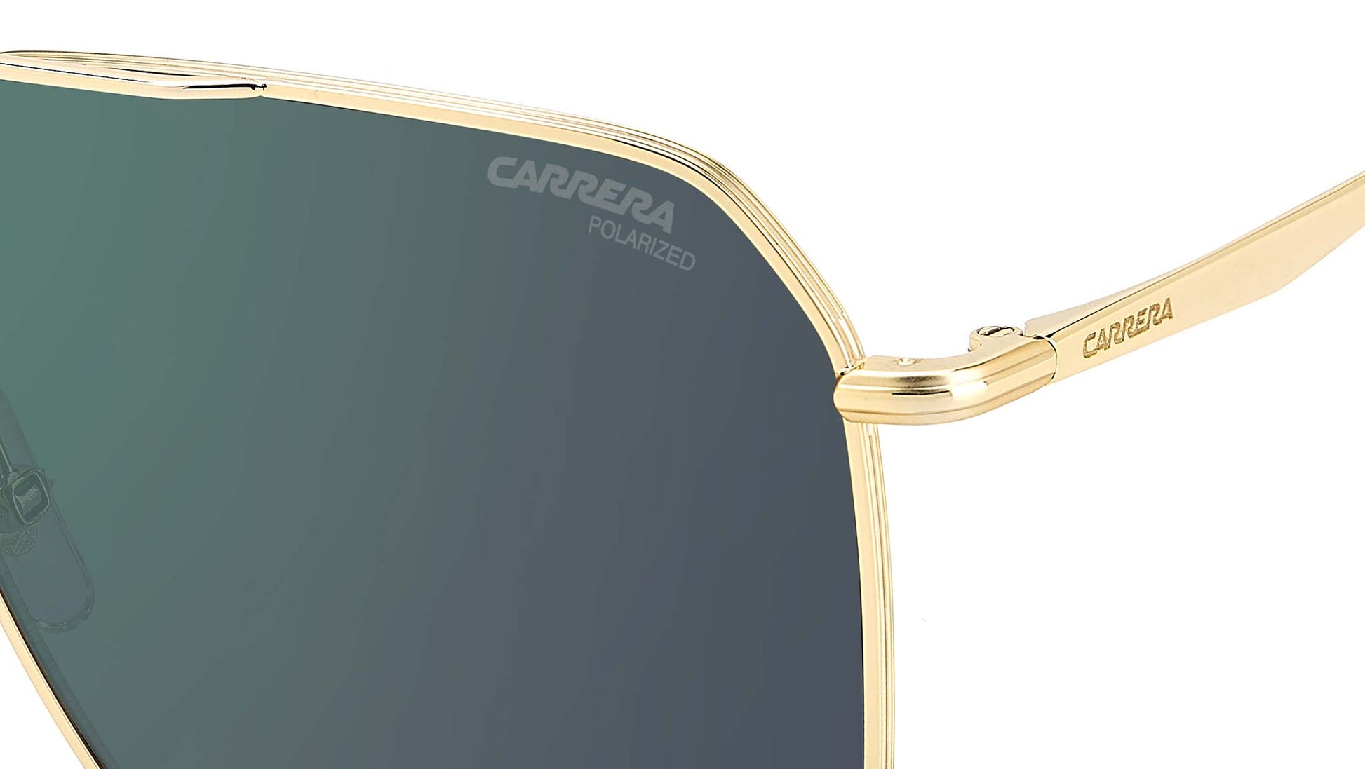 Carrera sunglasses model 333/S color code J5G Q3 Gold. These navigator sunglasses have a double bridge, the signature detail of Carrera. They’re enviable for their lightweight versatility. The stainless steel front can be fitted with prescription lenses. The temples are also in metal, rendered even more comfortable thanks to the acetate end tips. The entire look is defined by slender lines, yet these frames are durable enough to stand up to everyday use. The sun lenses ensure crisp vision, even more highly performing in the polarized and ultra-polar versions.
