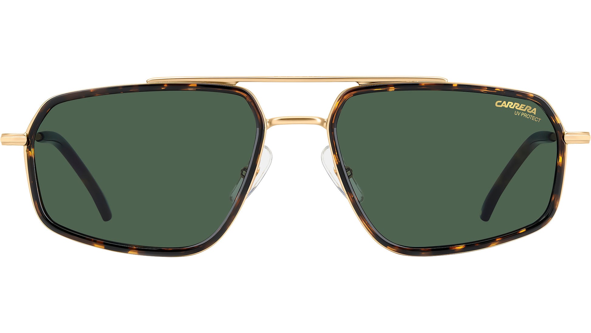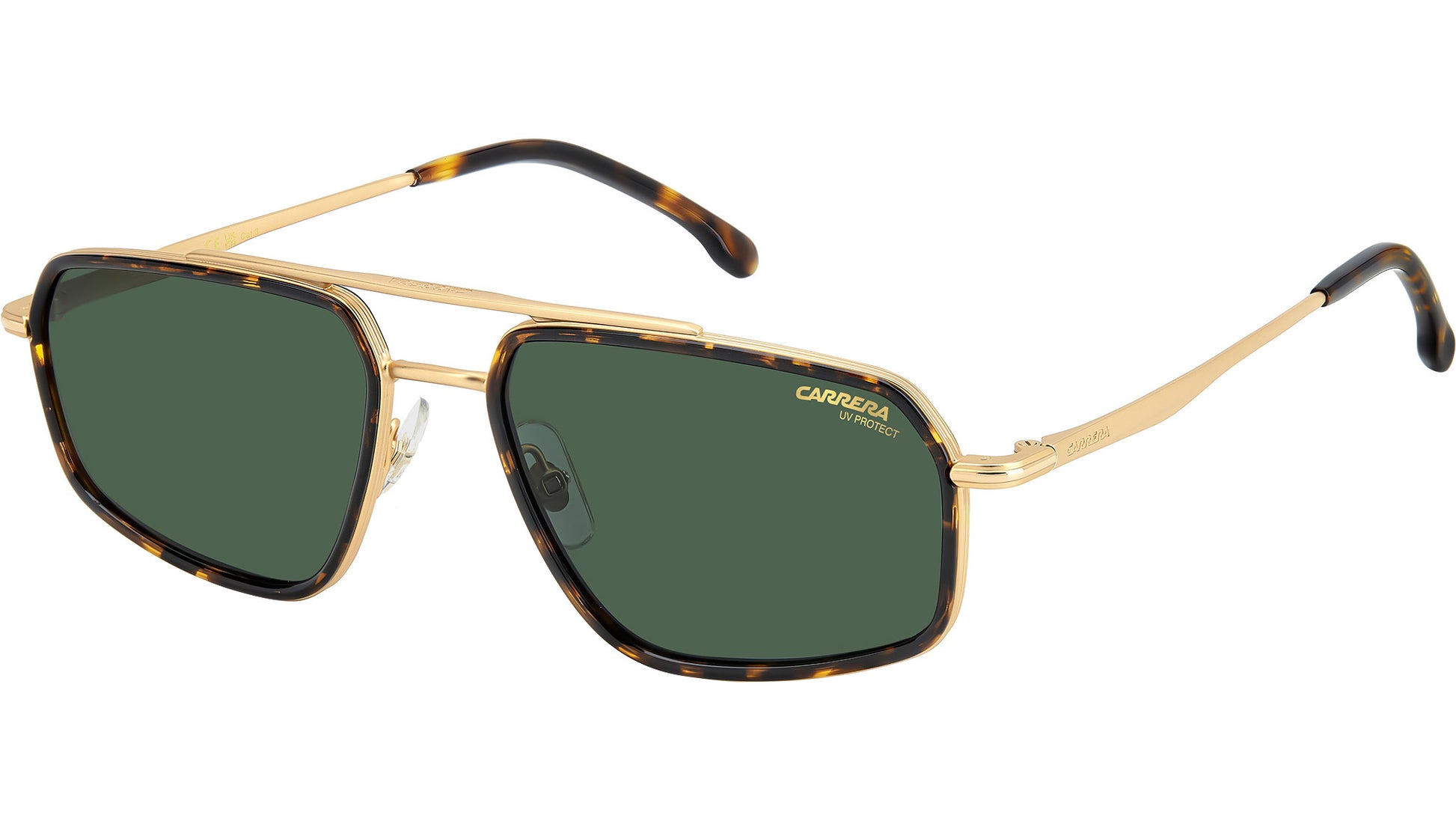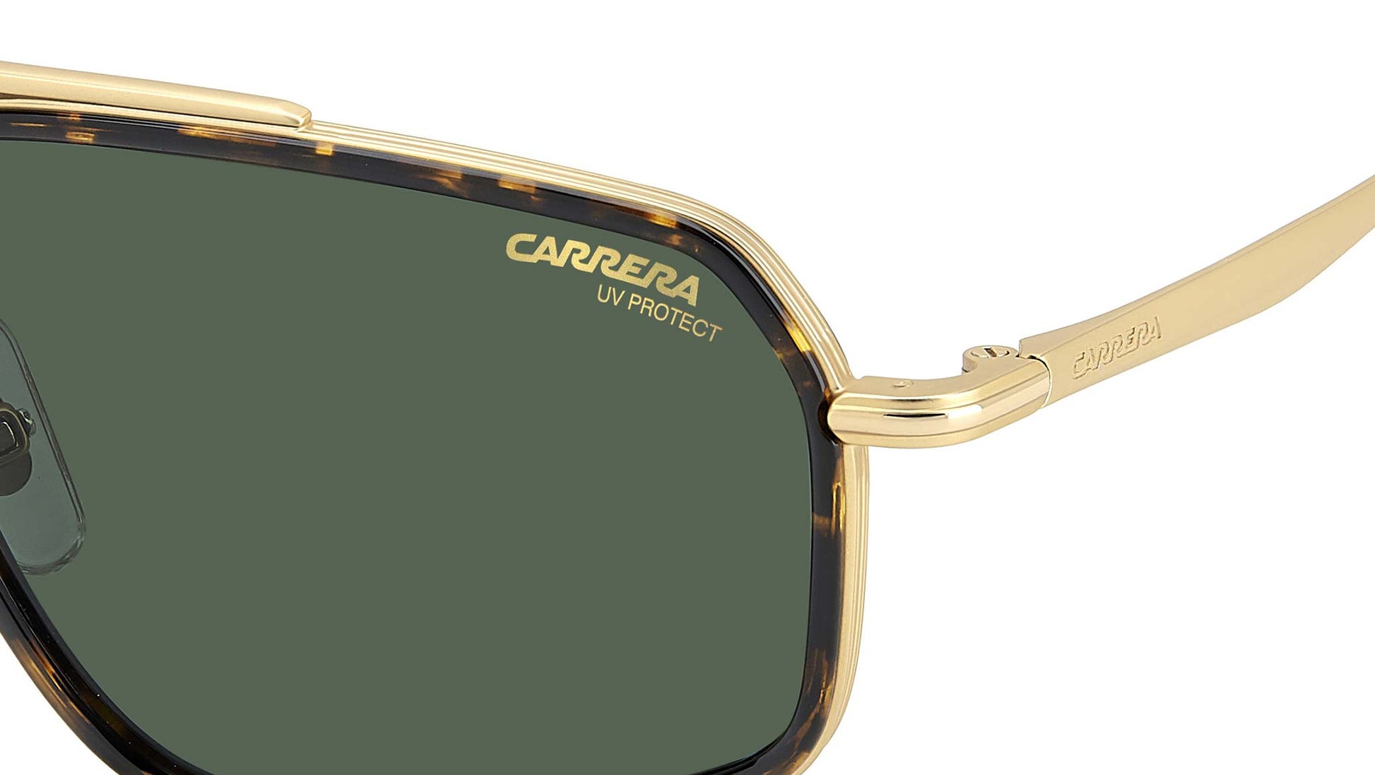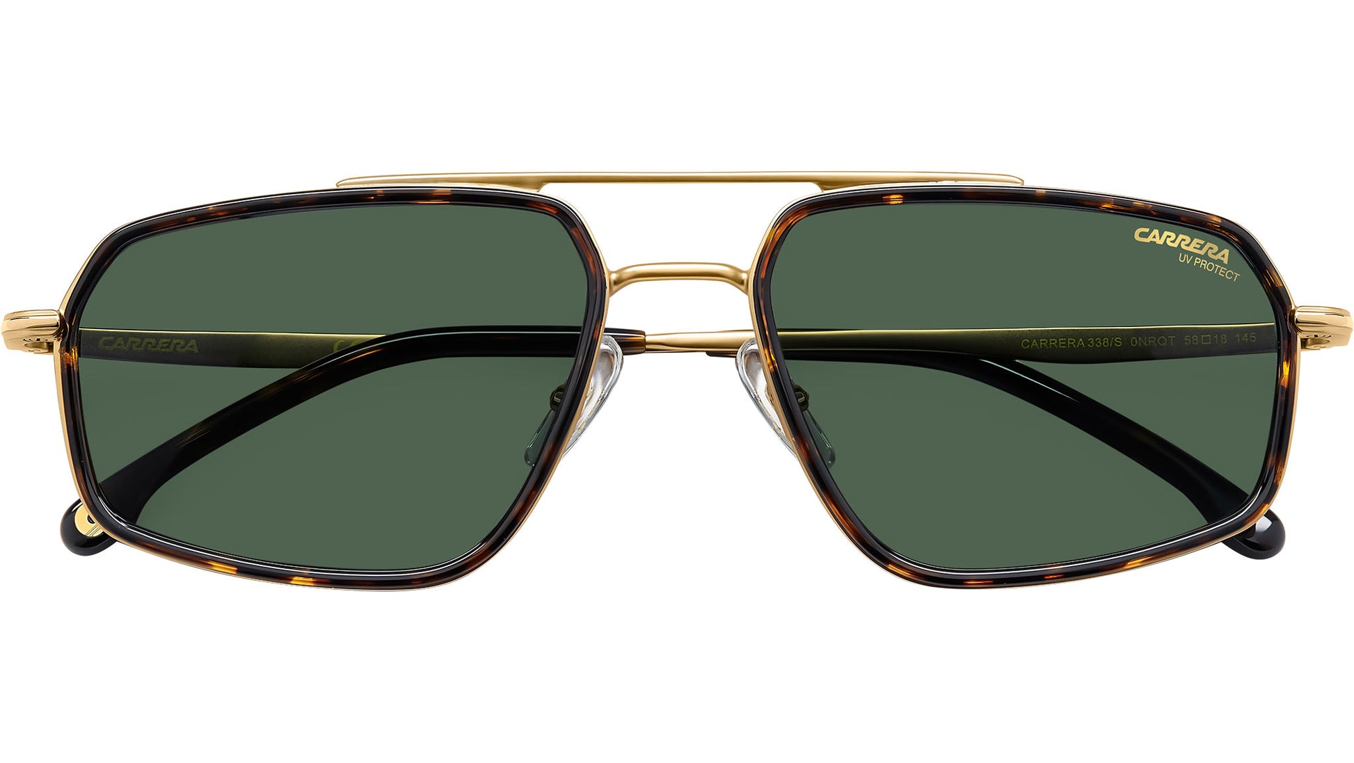Carrera 338/S 0NR QT sunglasses for men, featuring gold brown havana pilot metal frame and green lenses. These Carrera sunglasses are destined to become a wardrobe favourite, adored by just about everyone. The essential metal frames make them truly iconic, embellished by injected polyamide on the front, on-tone with the end tips. The double bridge, fin temples and the option to fit them with prescription lenses add the final touches. This style comes in a version with multi-layer temples, or with polarized lenses. Brand line: Signature. Style code: 207602. Color code: 0NR QT. Authorized Carrera online reseller. Your glasses will include the original case and accessories and are covered by a 12-month global warranty.