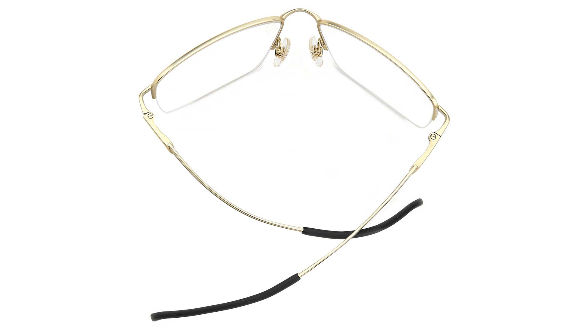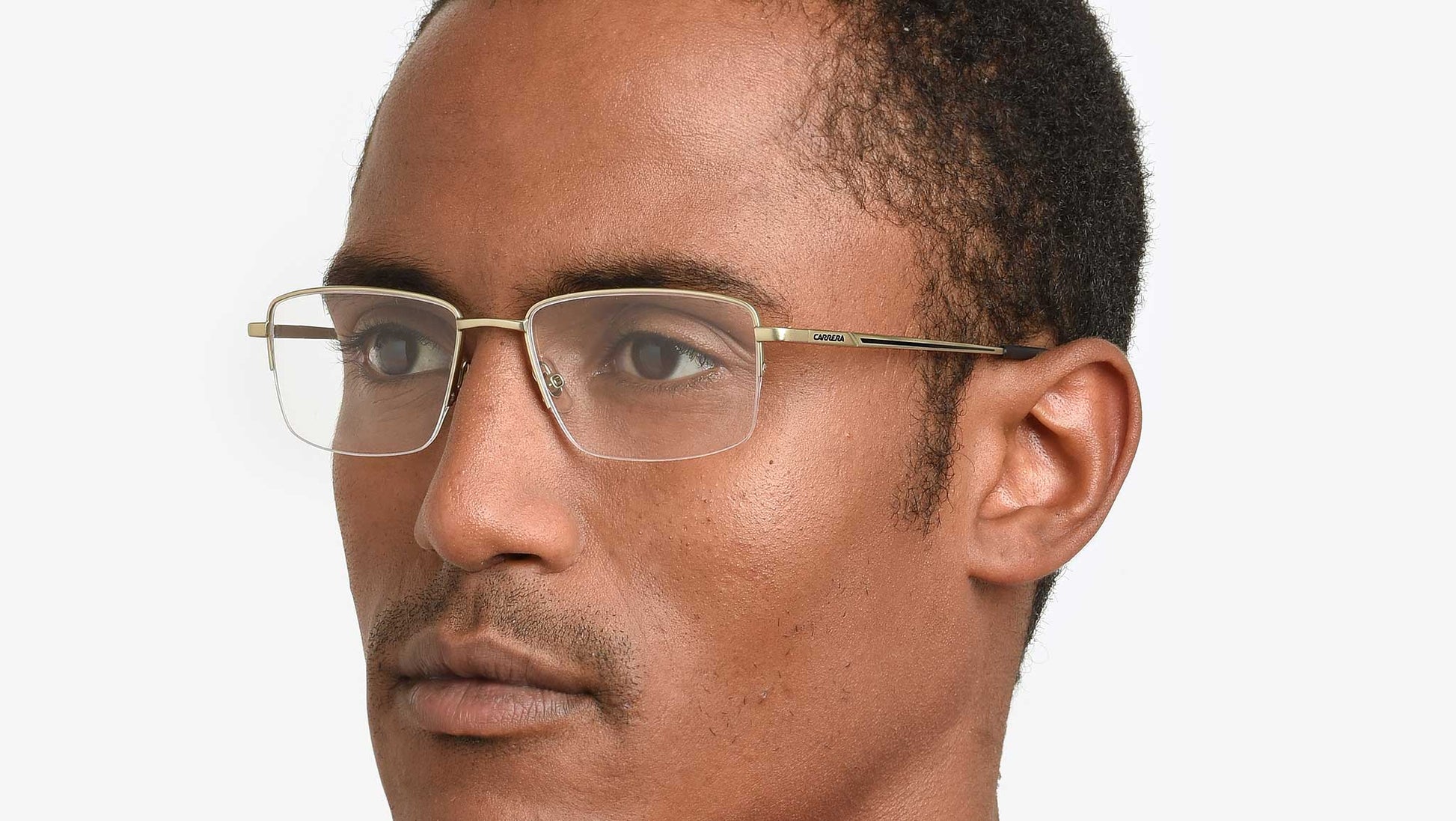 Carrera optical frame model 8895 color code AOZ Matte Gold. With these glasses, Carrera offers unbeatable technical qualities. The temples and the nose bridge are made of Memory Metal, a premium material that ensures maximum flexibility and long-lasting durability. The practicality of this style is further enhanced by the shape of the half-rim front, the fit of which is optimised by adjustable nose pads. A Carrera flag, printed on the temples, expresses the identity of the brand.