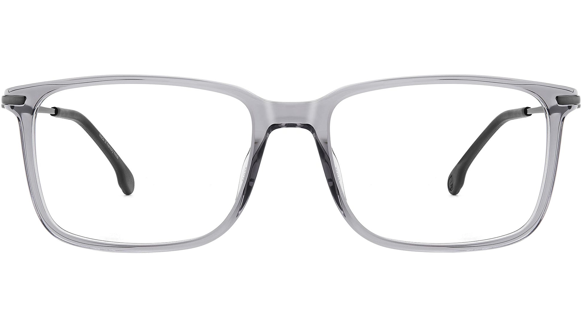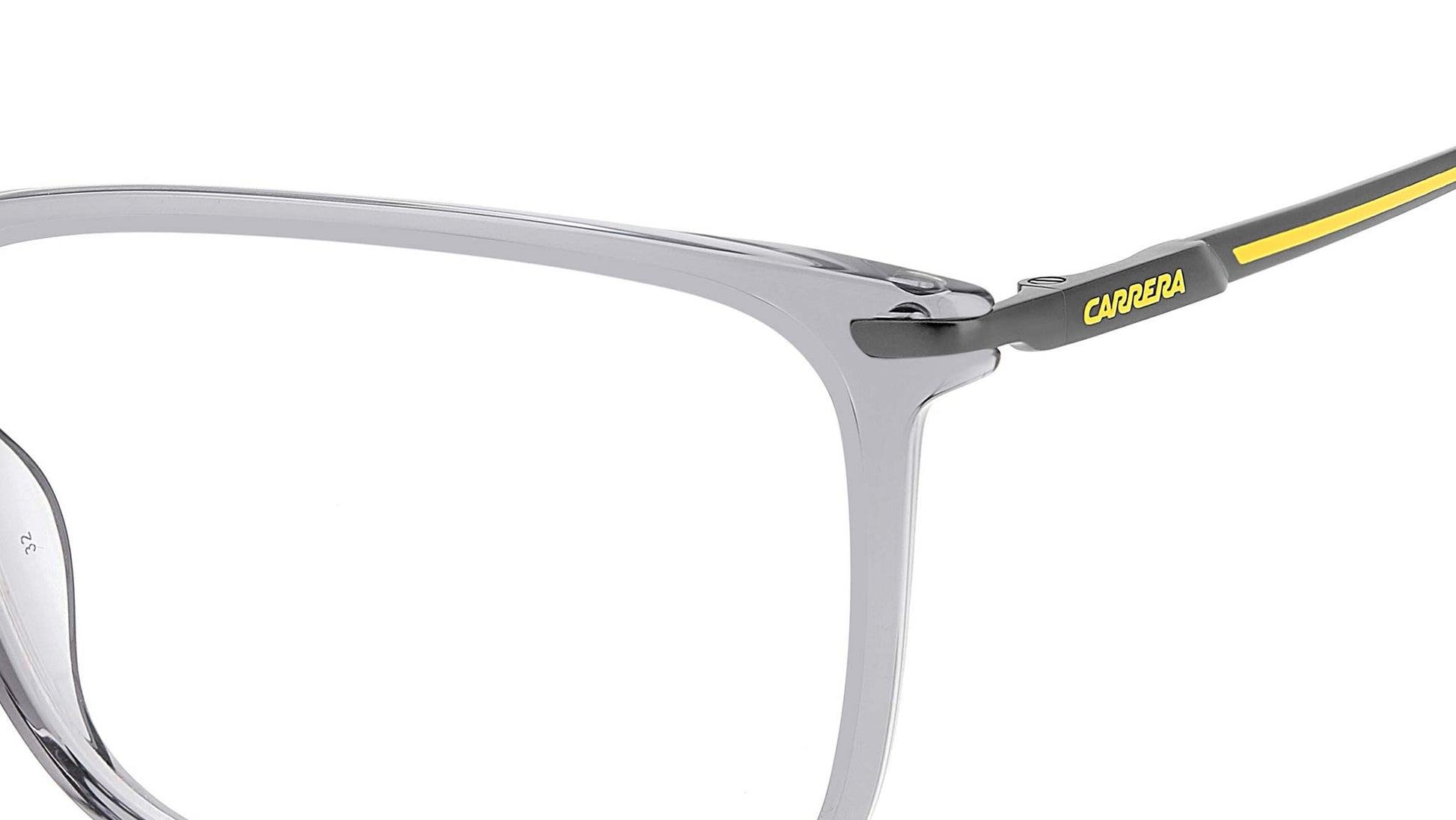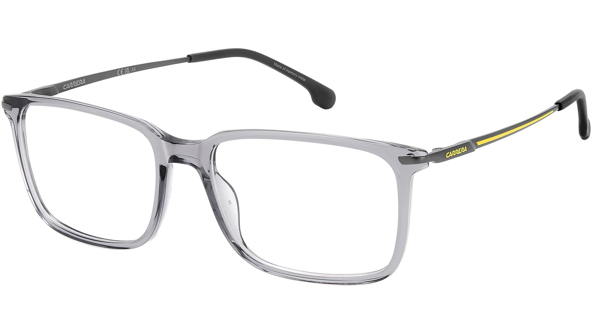 Carrera optical frame model 8897 color code KB7 Grey. Carrera technology and quality bring these highly practical eyeglasses to life. This pair is composed of a lightweight acetate front, simply impeccable in its lines and slender proportions. The temples are in Memory Metal, a premium material whose calling card is flexibility, for everyday use defined by comfort. The different colourways include versions with the Carrera flag printed on the temples.