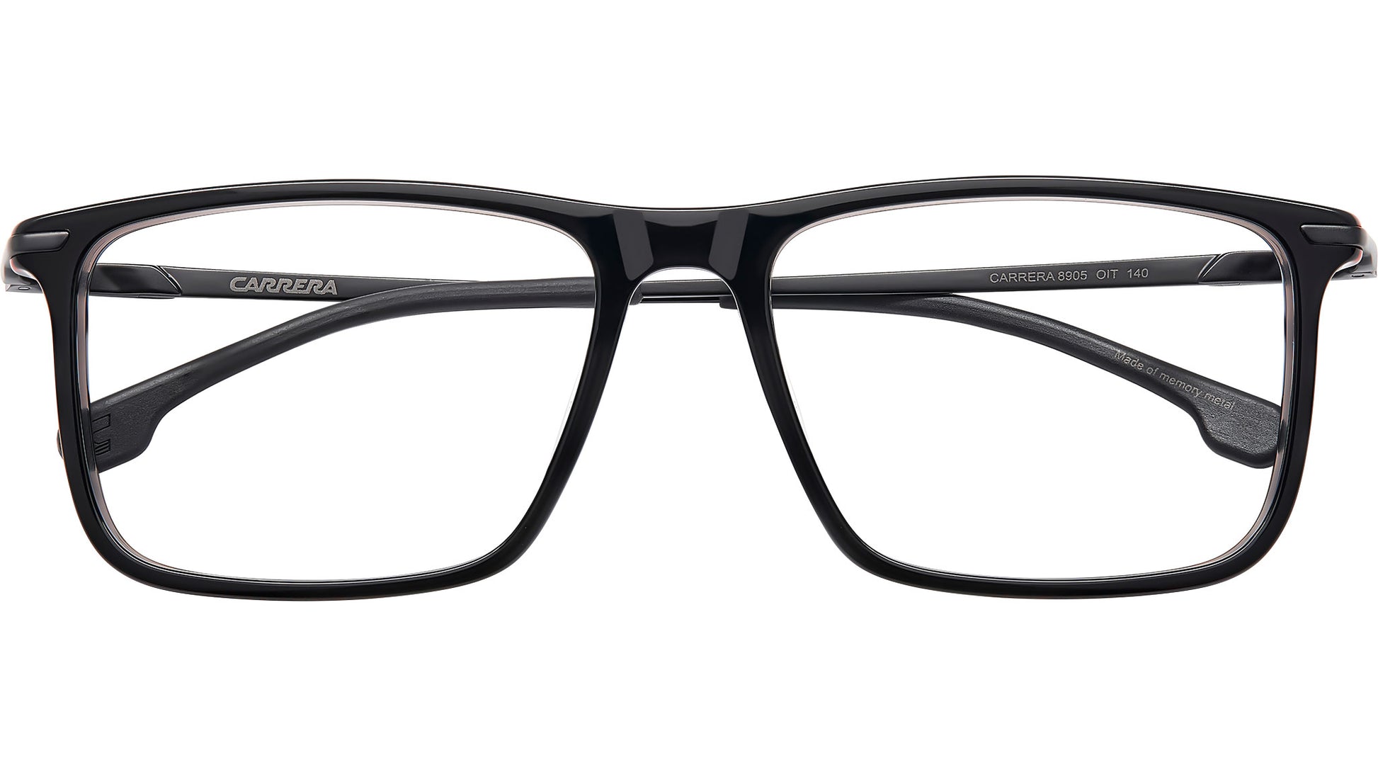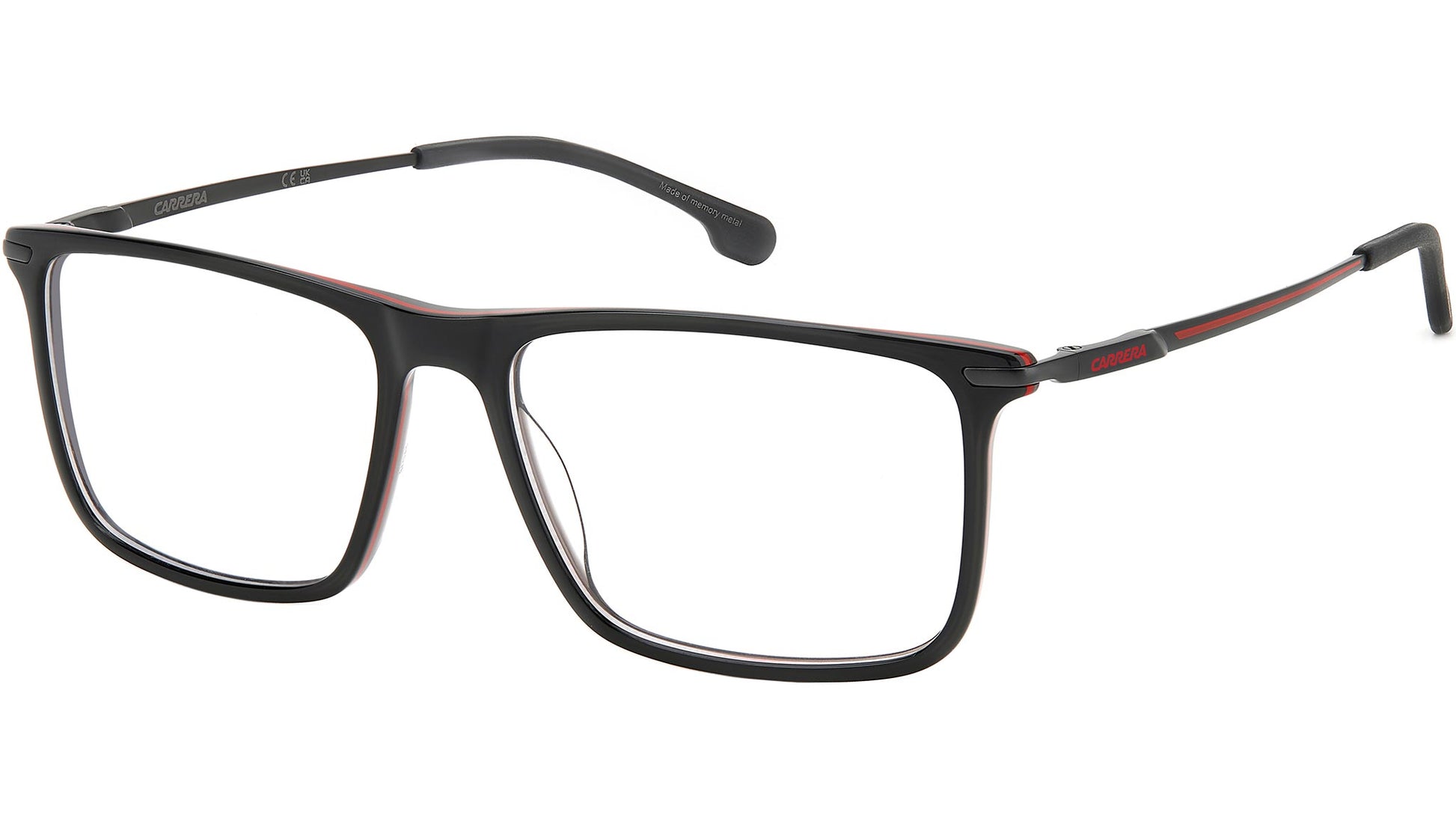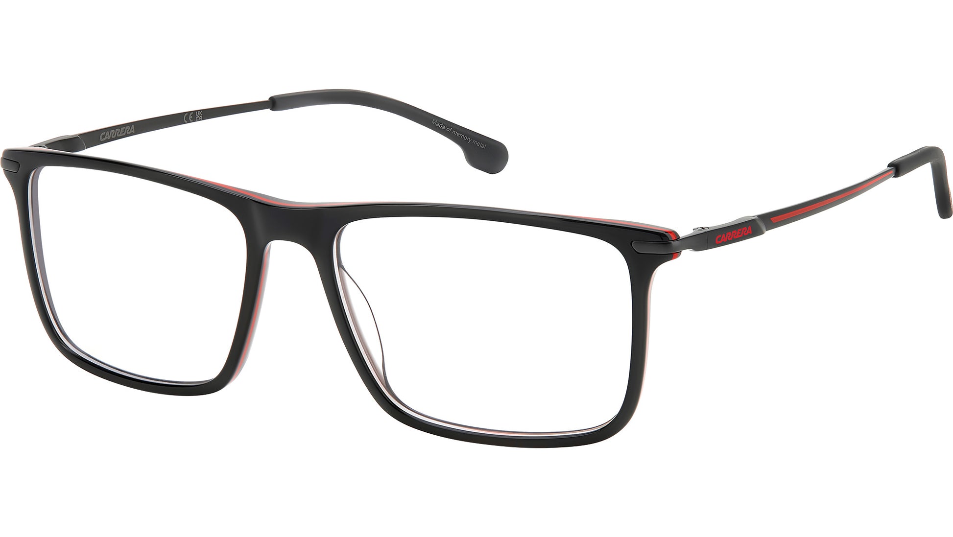 Carrera CARRERA 8905 OIT glasses for men, featuring black red rectangular acetate frame and demo lens lenses. Premium materials and high-quality manufacturing define these Carrera eyeglasses. They're designed for light-as-a-feather comfort, with a slender and compact front in lightweight acetate. Daily use is no problem at all: the Memory Metal temples always return to their original position, even when they're stressed and folded. Everyone can choose their favourite colour palette, each of which is accented by a logo and a tone-on-tone Carrera flag. Brand line: Sport. Style code: 108127. Color code: OIT. Authorized Carrera online reseller. Your glasses will include the original case and accessories and are covered by a 12-month global warranty.