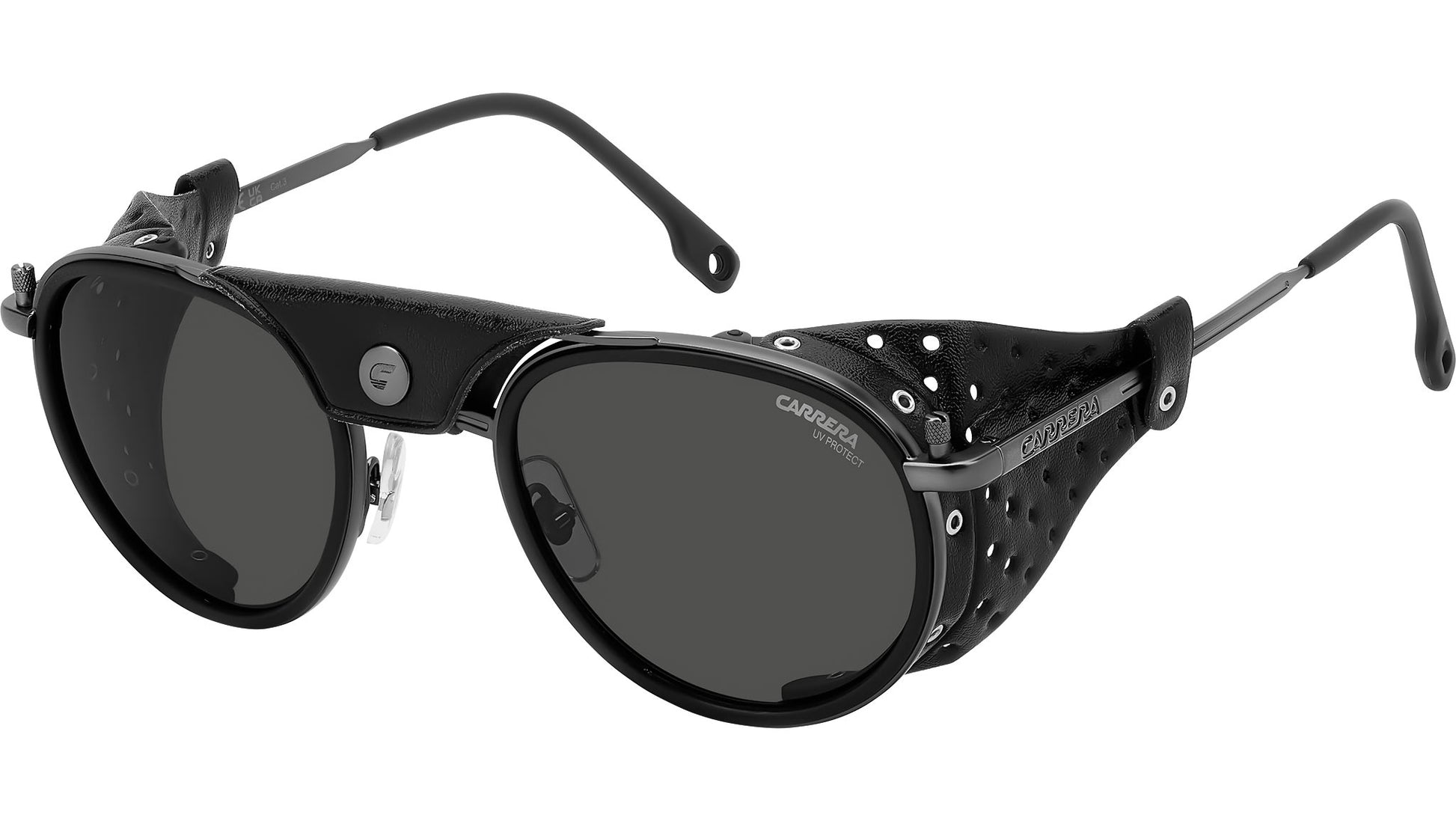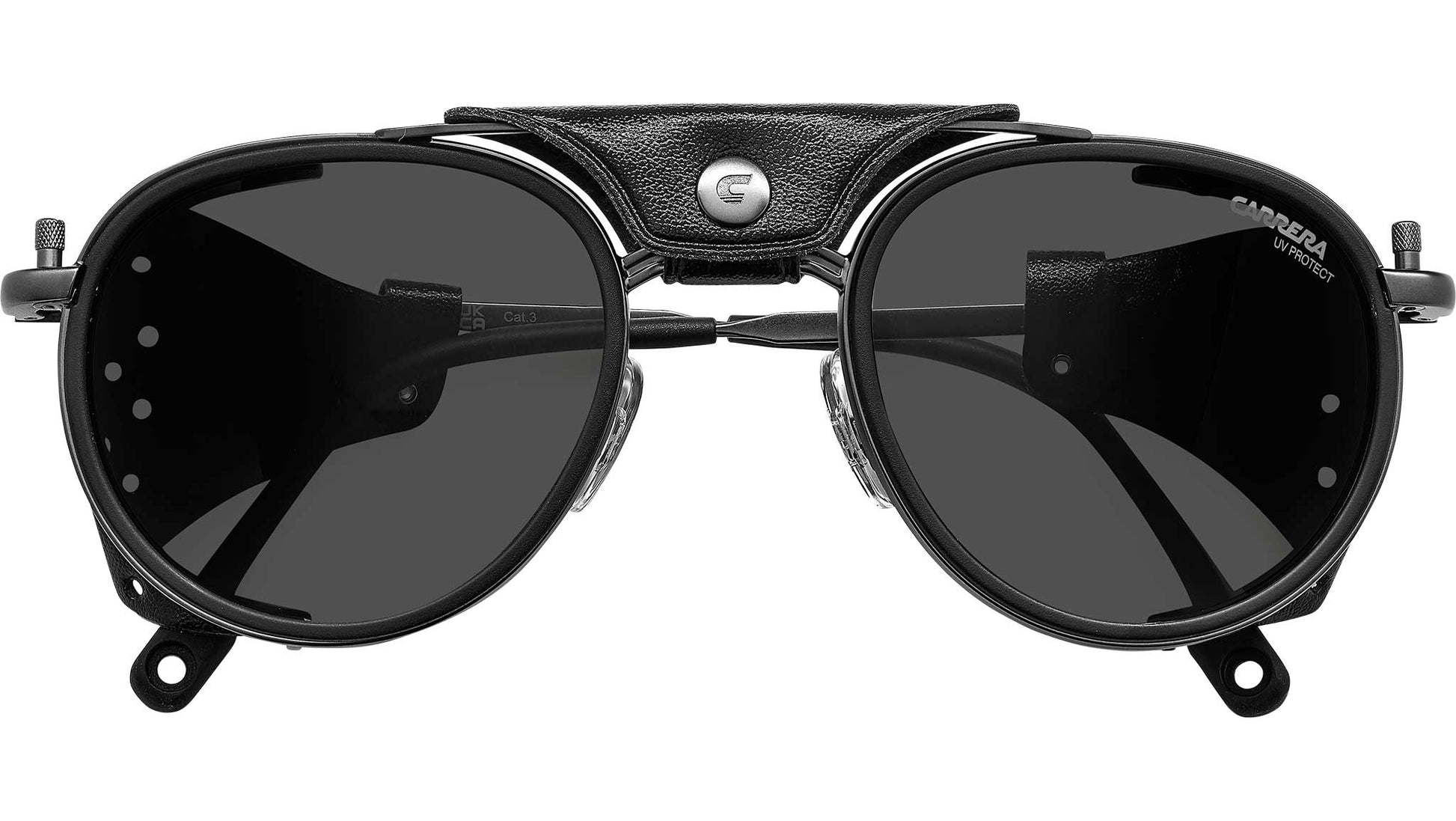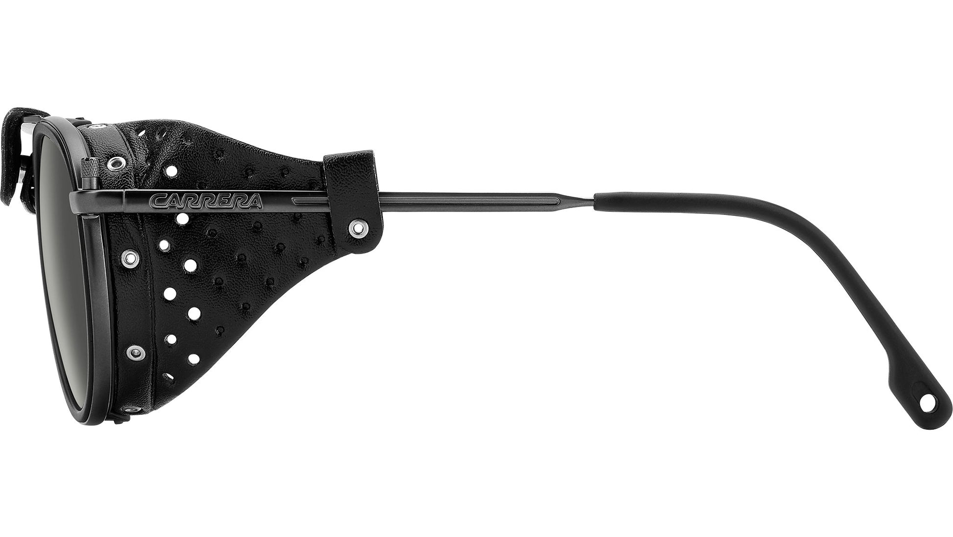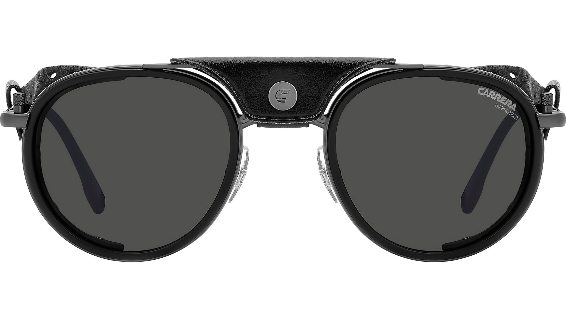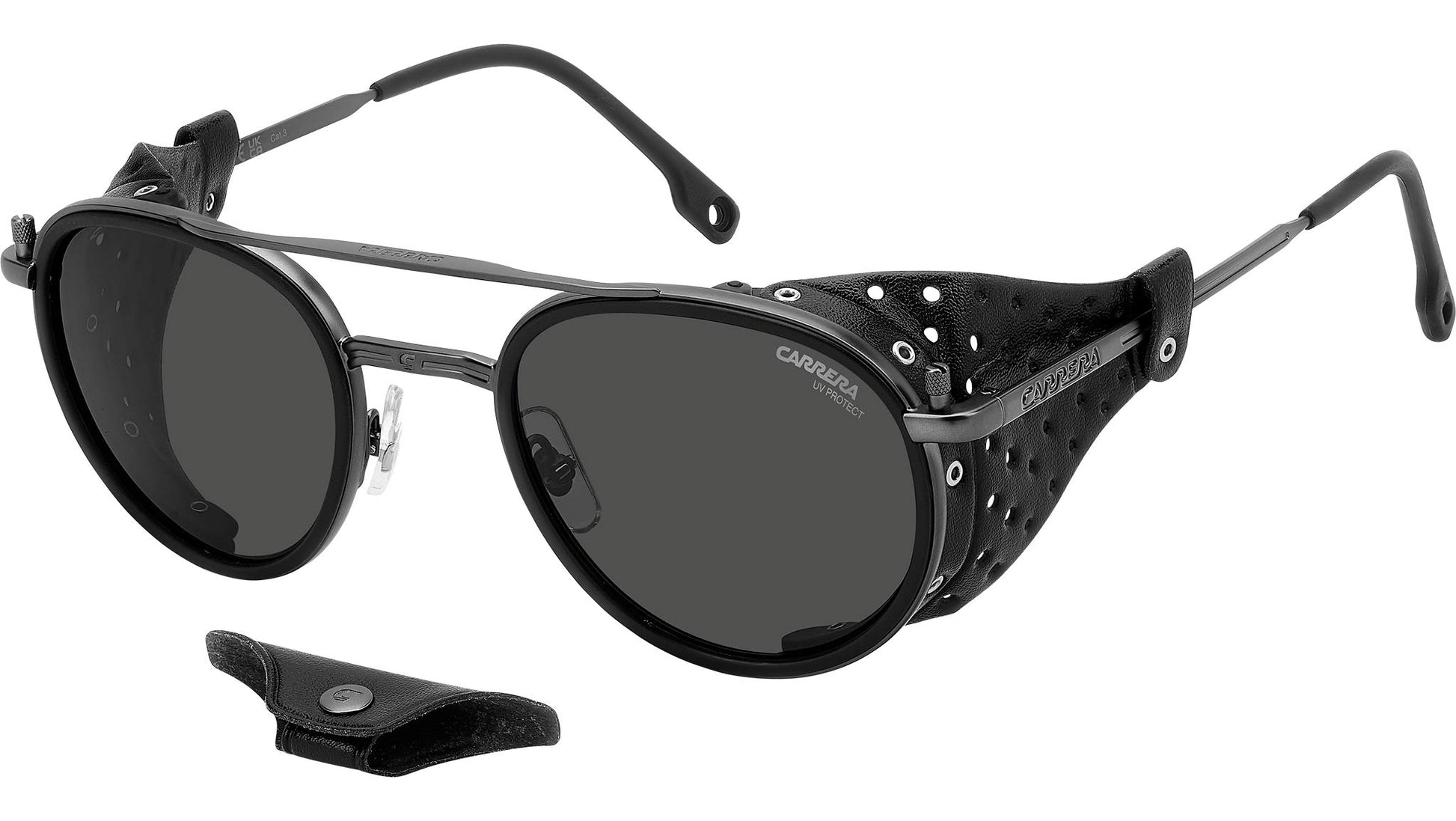 Carrera C SPORT 05/S R80 IR sunglasses for men, featuring matte dark ruthenium panthos metal frame and grey lenses. These Carrera sunglasses were inspired by Alpine landscapes. The metal structure is accompanied by detachable faux leather elements on the sides and double bridge which protect from the light and wind. The end tips can be adjusted, remaining solidly in place thanks to their curved shape. Dedicated openings make it possible to attach an elastic cord which can be purchased separately, so as not to lose them on the most arduous climbs. This style is available in mirrored or photochromic lens versions. Brand line: Sport. Style code: 207993. Color code: R80 IR. Authorized Carrera online reseller. Your glasses will include the original case and accessories and are covered by a 12-month global warranty.