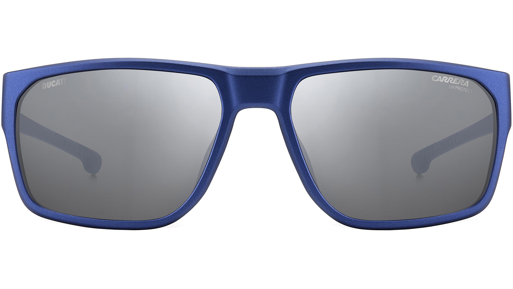 Carrera Ducati sunglasses model CarDuc 029/S color code TZQ T4 Blue Metalized. Equally perfect for days spent on a motorcycle as those dedicated to relaxation, these Carrera | Ducati sunglasses will go straight to the heart of motorcycle enthusiasts. The temples stand out, with the initial part in flexible, durable Ultem, completed by a V-shaped notch (a nod to the geometric forms of Ducati motorcycles) and prominent logos. The full-coverage frames can hold prescription lenses. Also available in mirrored or ultrapolar lens options.