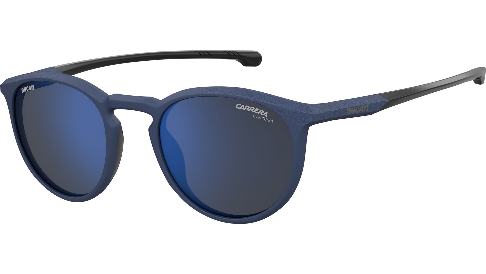 Carrera Ducati CARDUC 035/S TZQ XT sunglasses for men, featuring blue metalized panthos injection frame and blu sky mirror lenses. These sunglasses by Carrera | Ducati bring style to the racetrack. The pantos front with a keyhole bridge complements almost any face, even those of women who want to go bold with a sporty look. The temples are a tribute to the design of the Panigale, while the slender silhouettes and the shiny rubber end tips make these glasses ideal under a motorcycle helmet. Vision is optimised when they're fitted with prescription lenses, whether mirrored or polarized. Brand line: Paddock. Style code: 206750. Color code: TZQ XT. Authorized Carrera Ducati online reseller. Your glasses will include the original case and accessories and are covered by a 12-month global warranty.