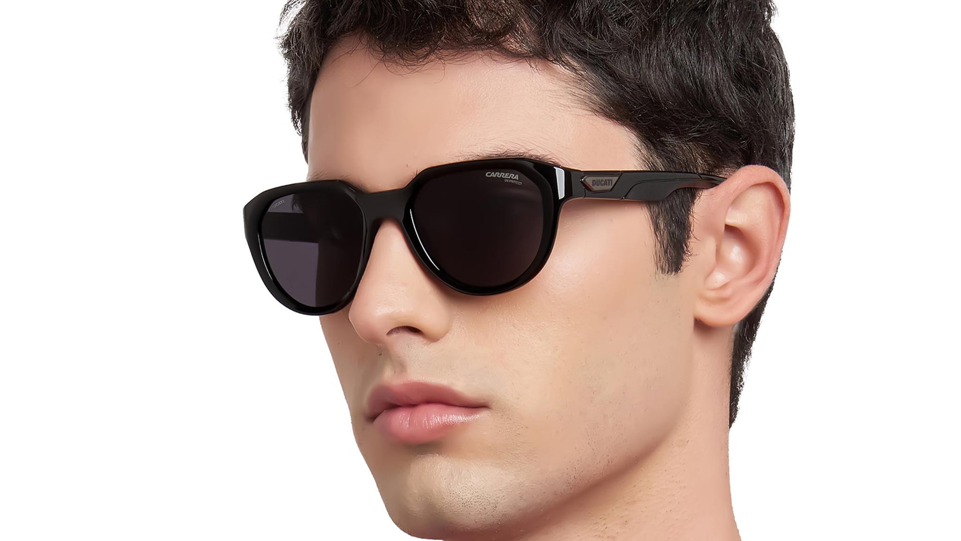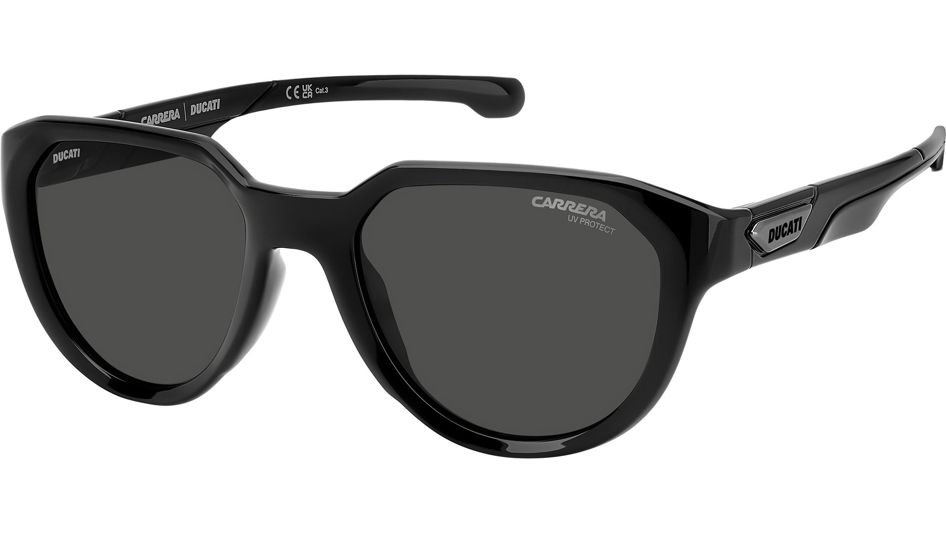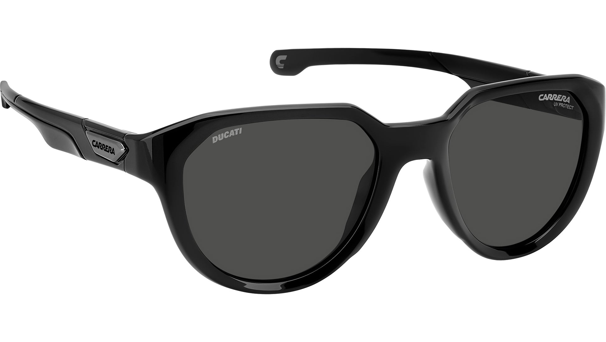 Carrera CARDUC 050/S 807 IR sunglasses for men, featuring black round nylon frame and grey lenses. Champions of motorcycle racing, champions of style: these Carrera | Ducati sunglasses unite performance and aesthetics. Their inspiration comes from the racing paddock – and it shows: a multifaceted geometric front and bold temples with a metal insert, logo and linear grooves, also in contrast options. And if that weren’t enough, the mirrored version is even more daring. Brand line: Paddock. Style code: 207875. Color code: 807 IR. Authorized Carrera online reseller. Your glasses will include the original case and accessories and are covered by a 12-month global warranty.